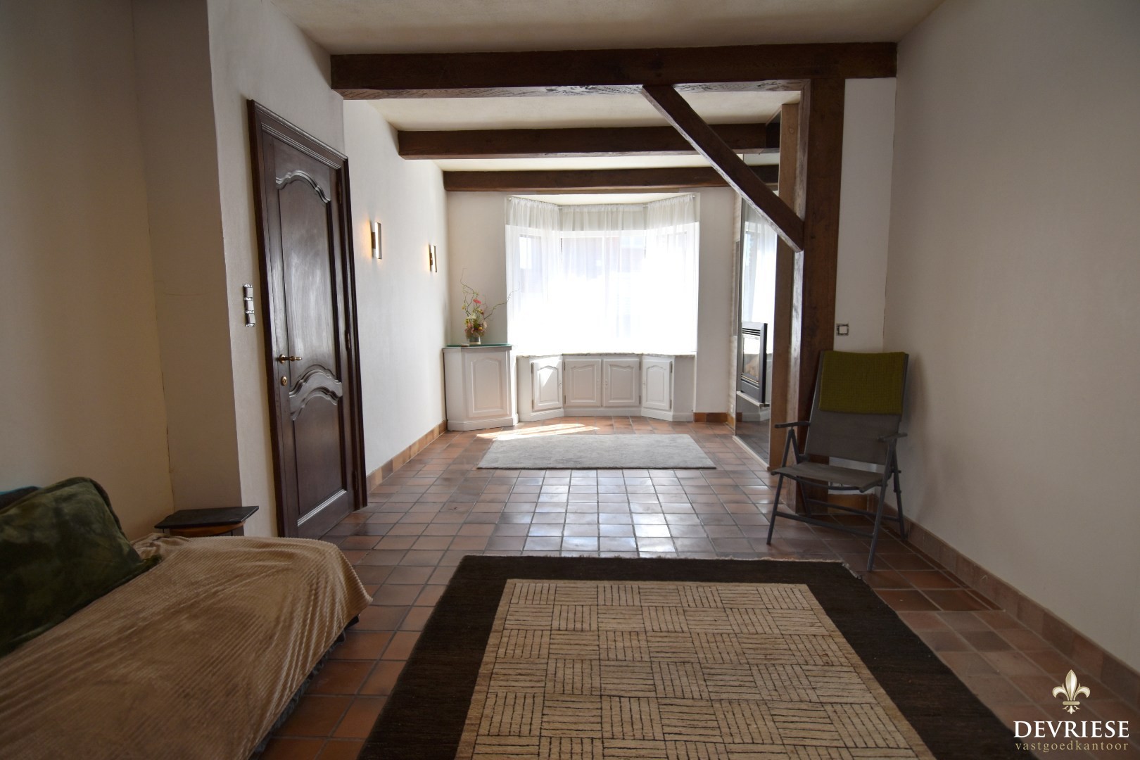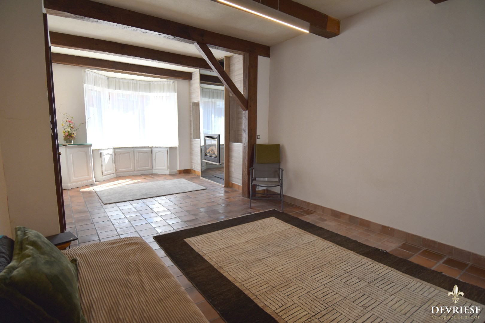 Inkomhal, ruime leefruimte met aansluitend de keuken die uitgerust is met een gasvuur (wordt vervangen door een elektrisch vuur), vaatwas, oven en frigo.