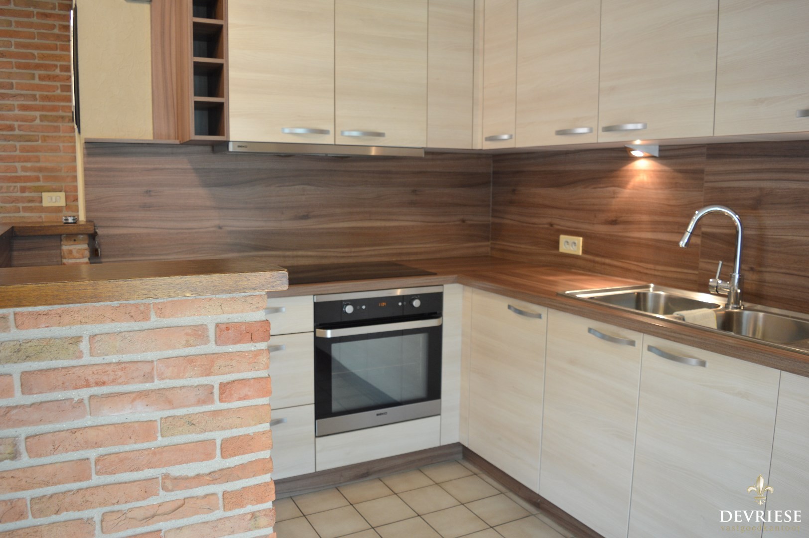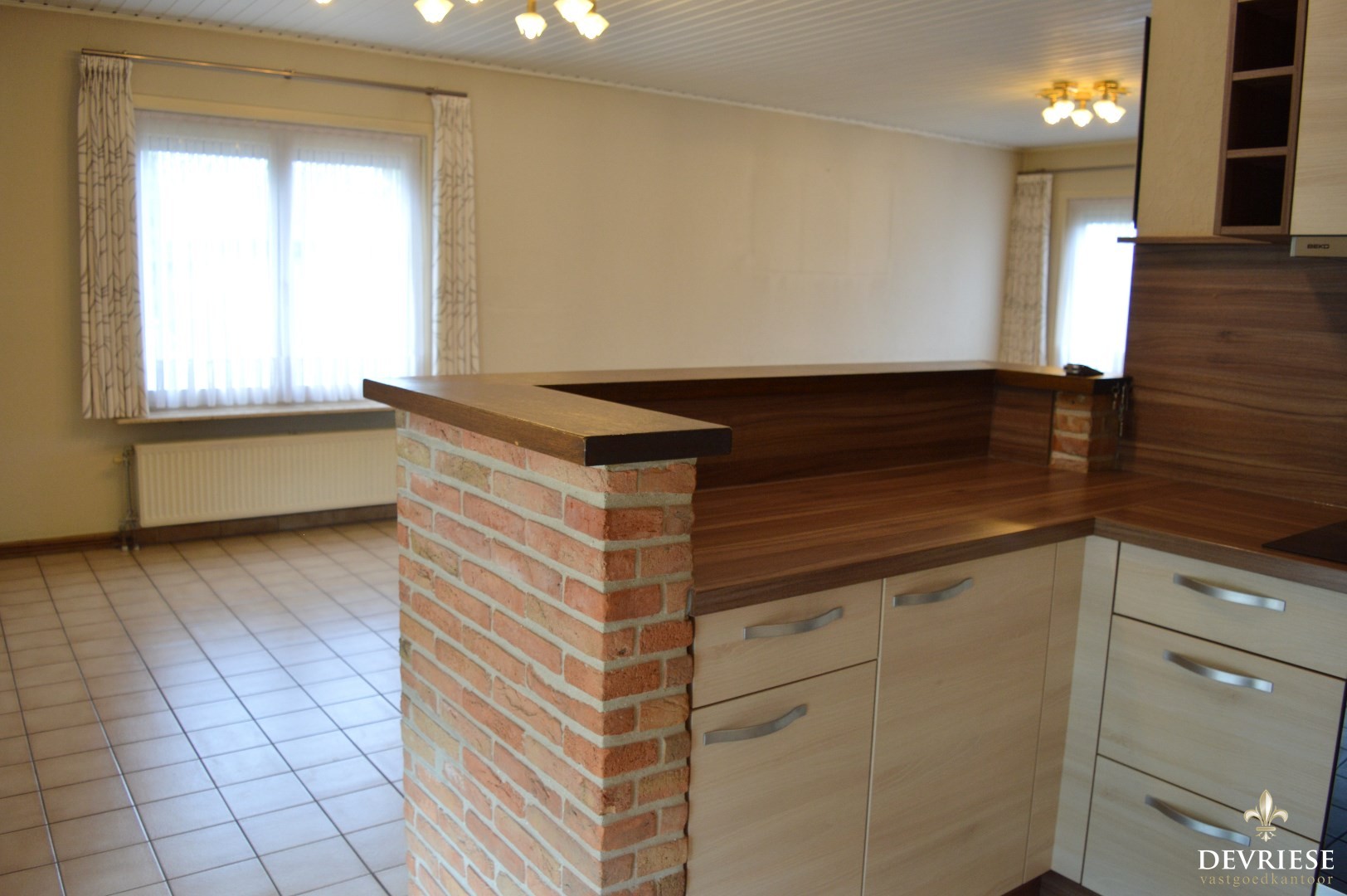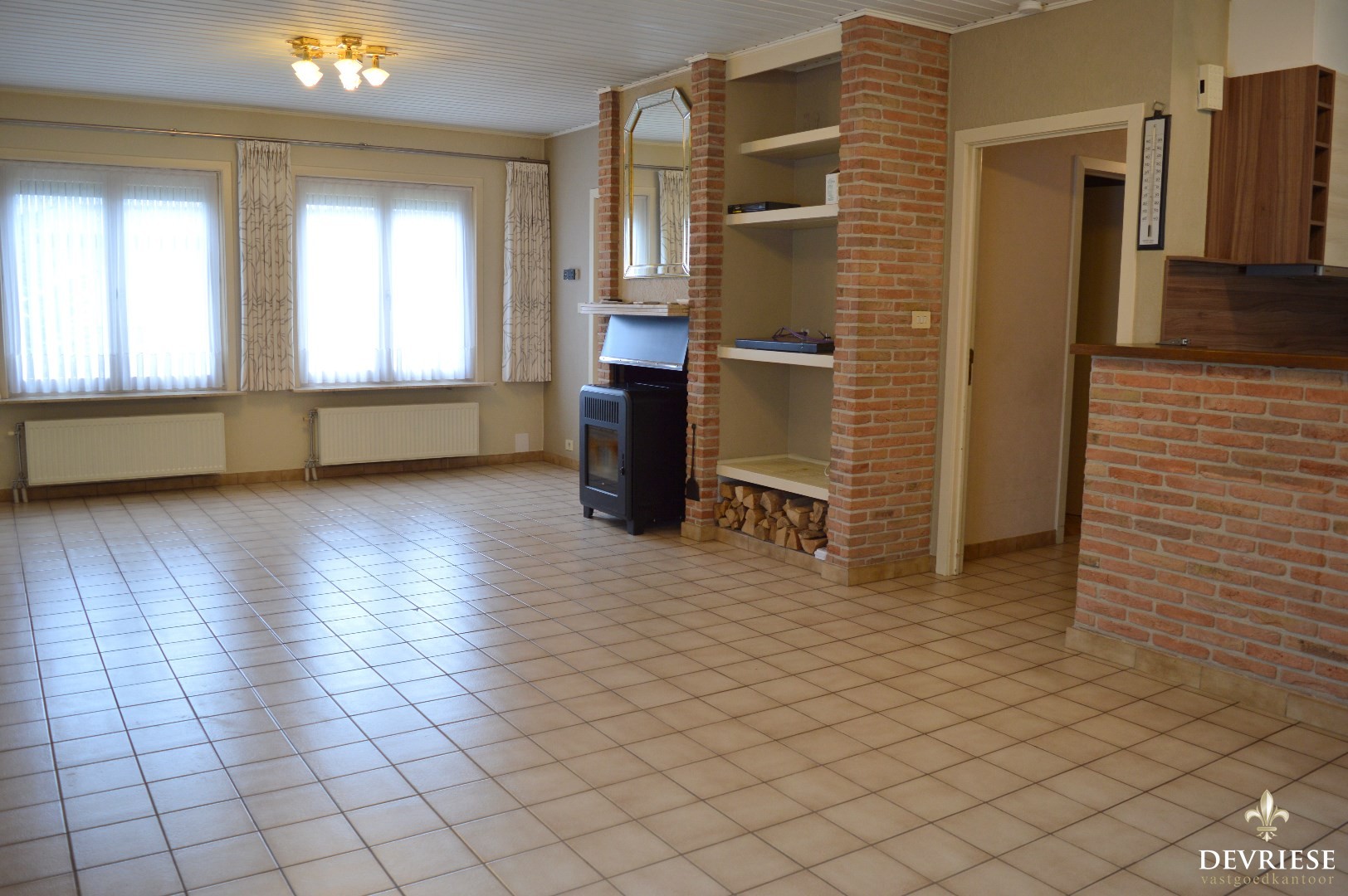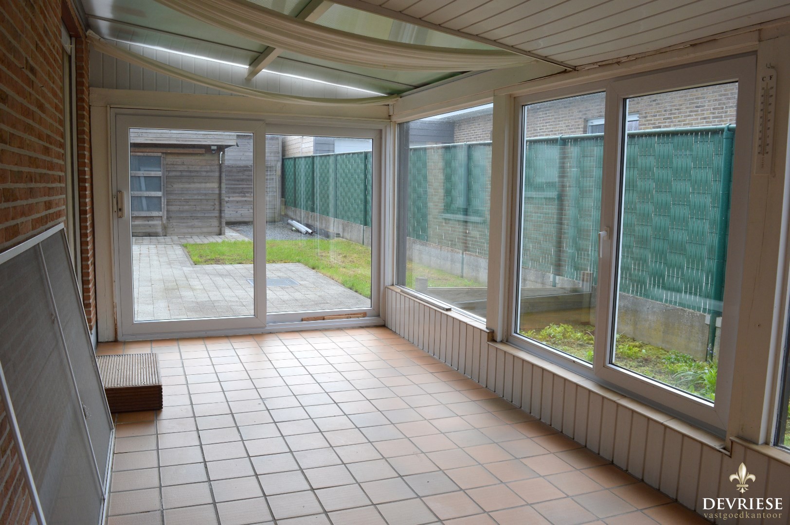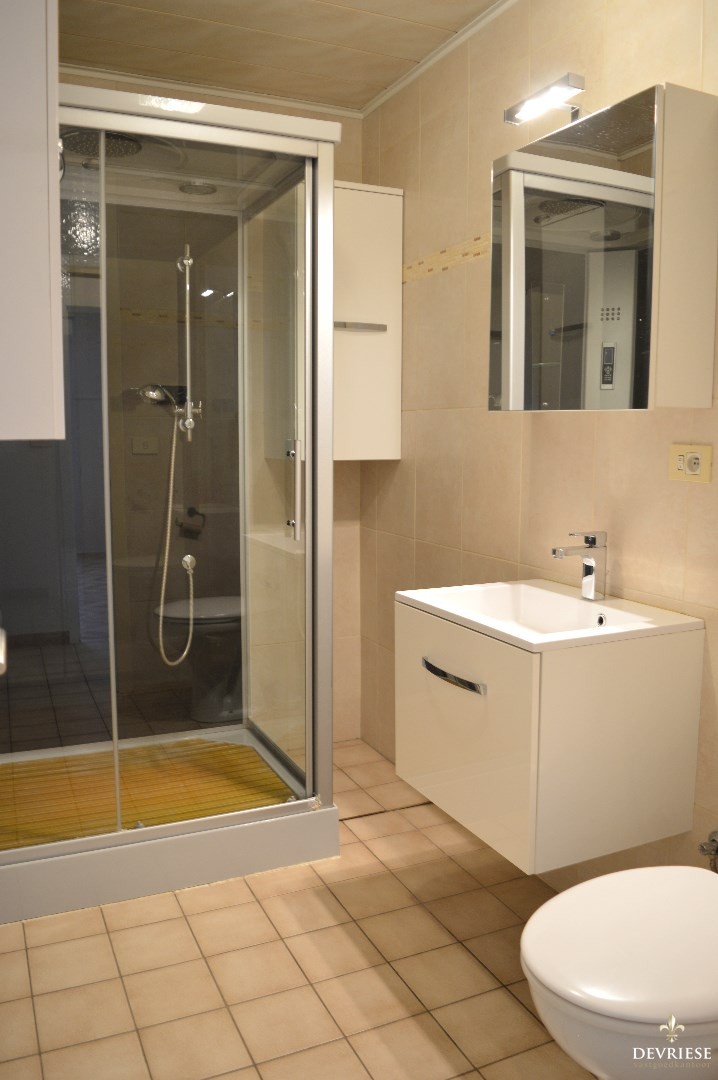 Inkomhal, ruime leefruimte met aansluitend de keuken (voorzien van oven, keramische kookplaat en vaatwasmachine). Daarnaast is er ook een ruime en aangename veranda aanwezig die uitgeeft op de zuid gerichte tuin.