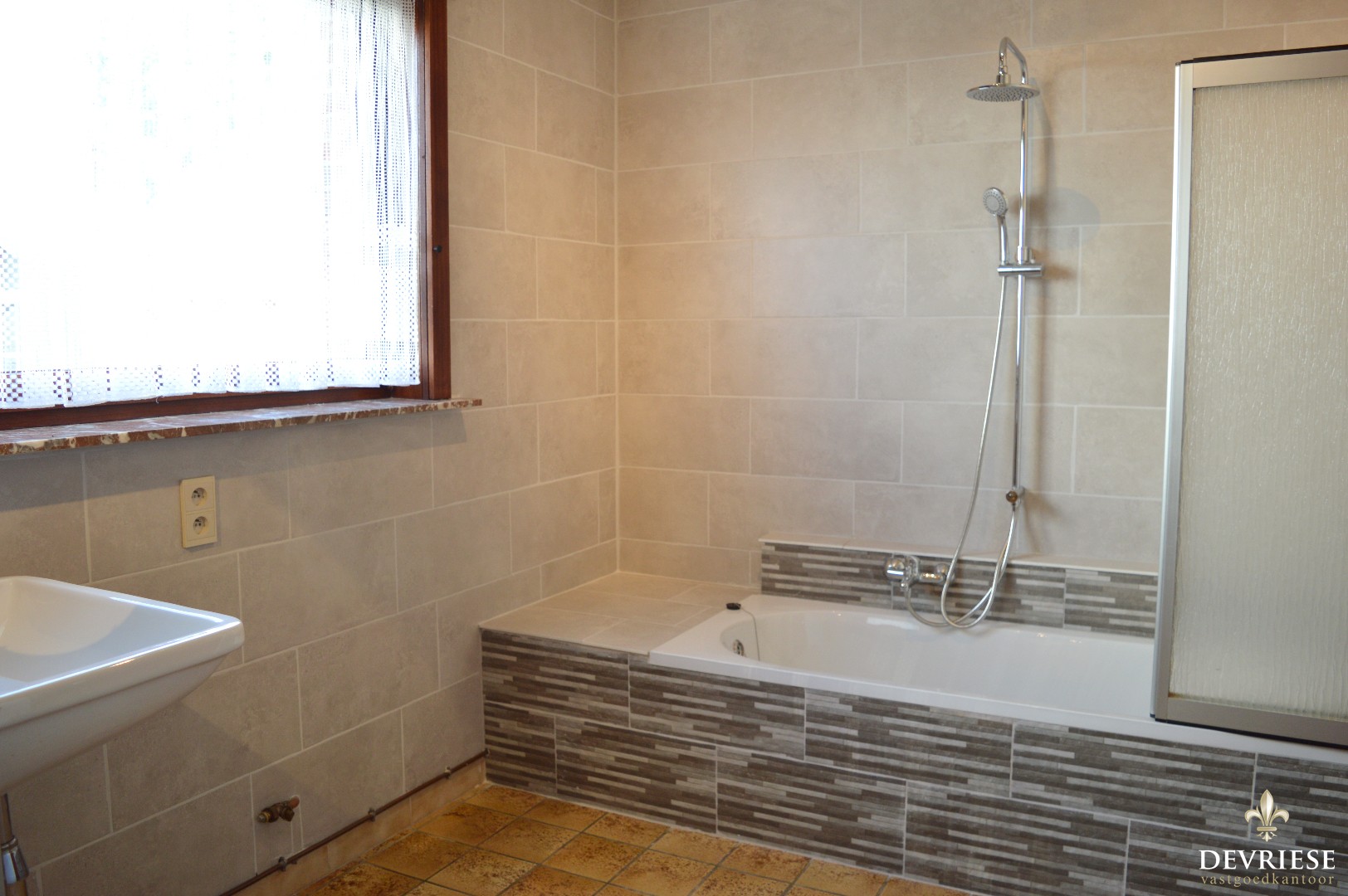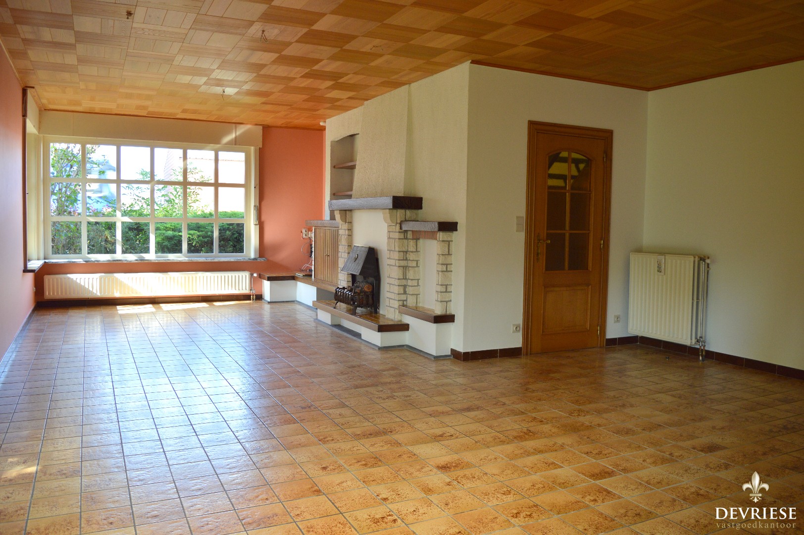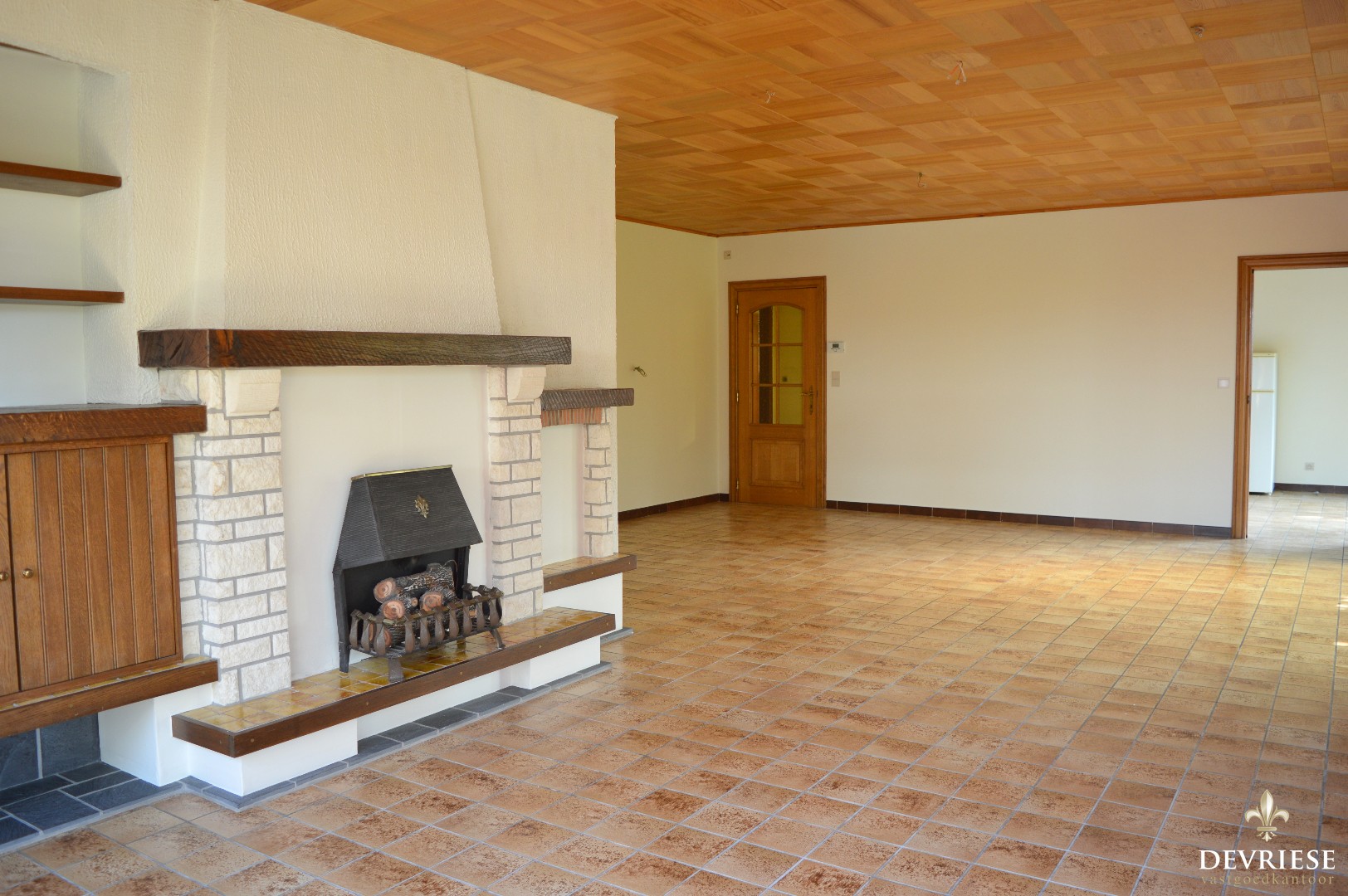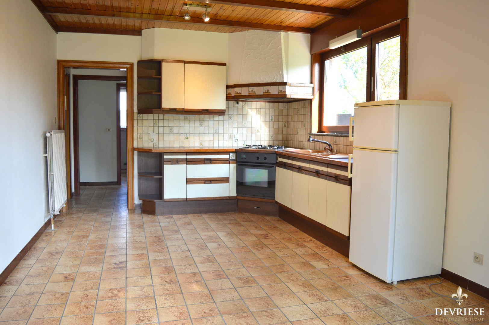 Inkomhal, ruime leefruimte met aansluitend de keuken voorzien van oven, frigo en gasvuur, ruime badkamer met combi bad/douche, kelder, apart toilet en de garage waar de aansluiting voor de wasmachine is voorzien.