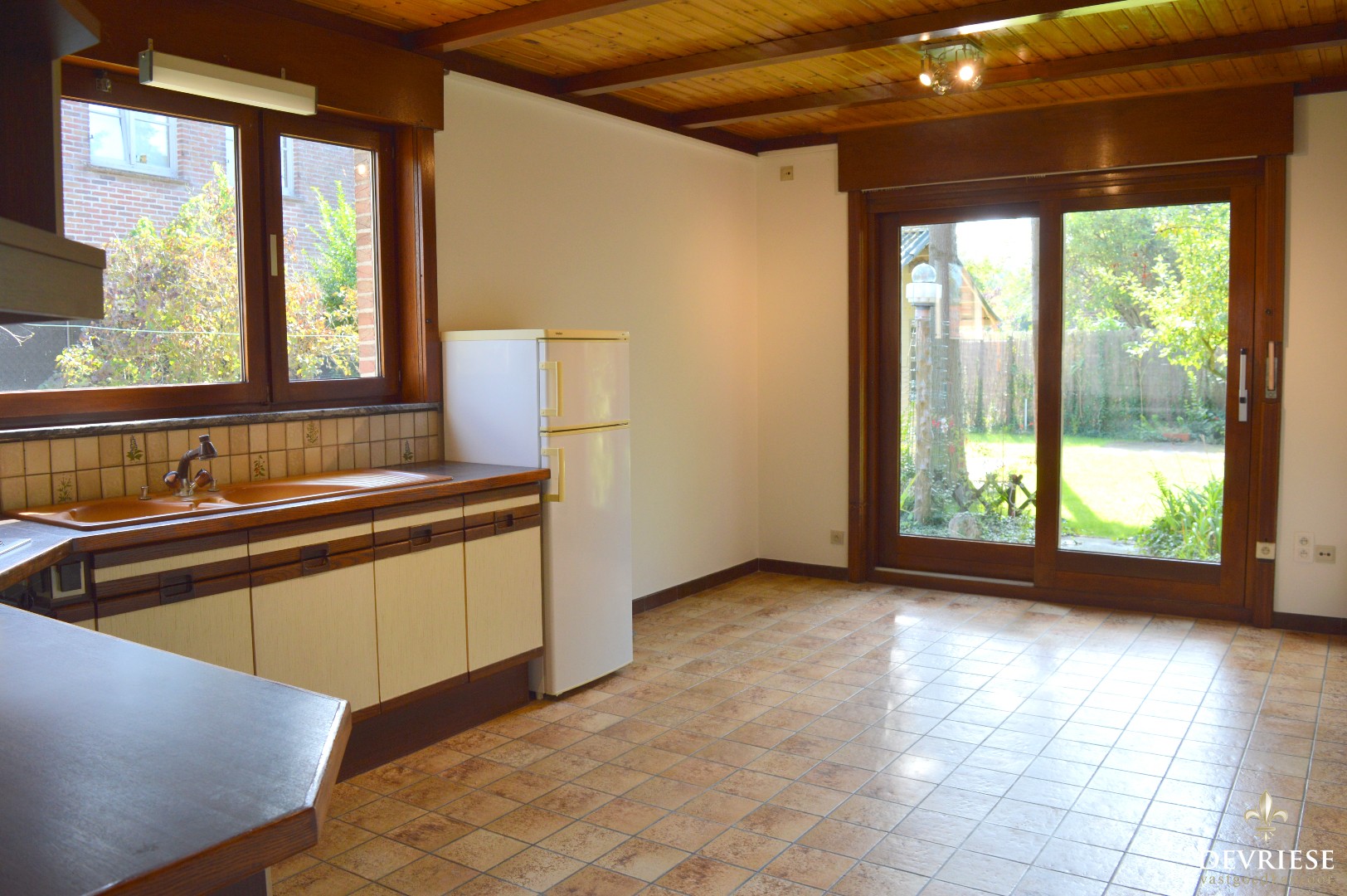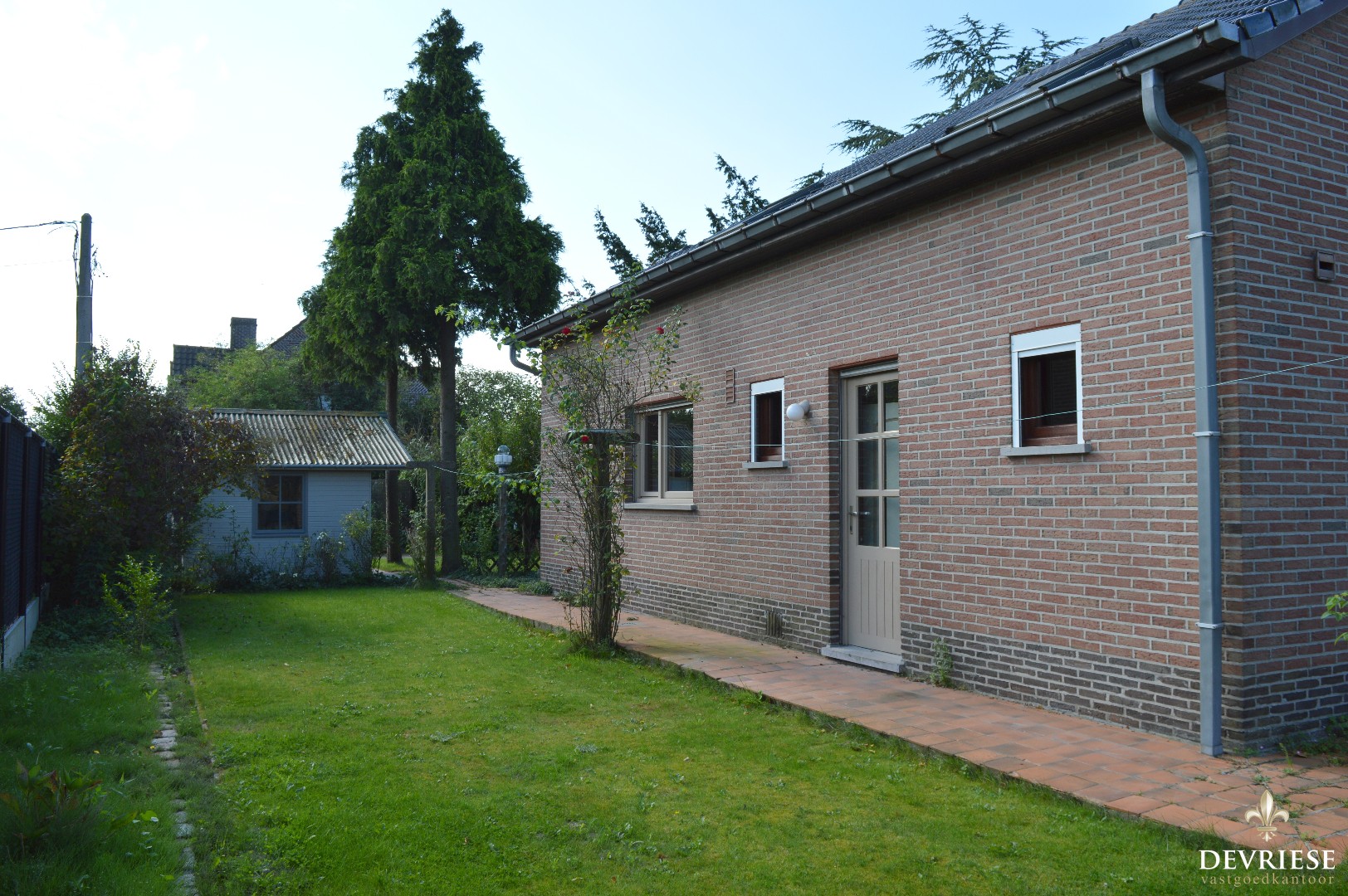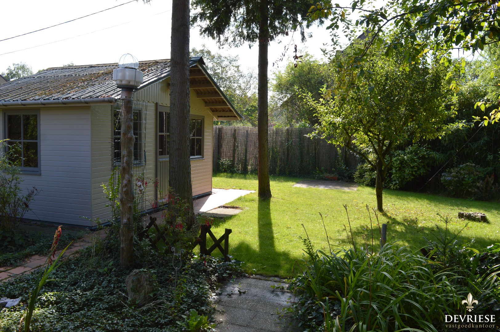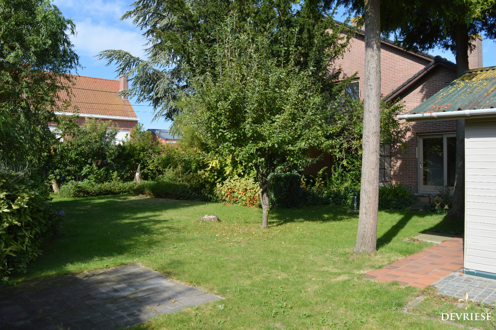 De tuin is toegankelijk via zowel de leefruimte als de keuken en de gang, daarbovenop is er een tuinhuis aanwezig en een overdekt terras.