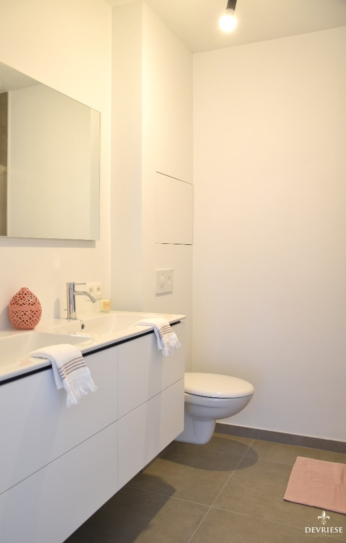 Op de eerste verdieping zijn er 3 slaapkamers alsook de badkamer met douche, dubbele lavabo en een 2de toilet.