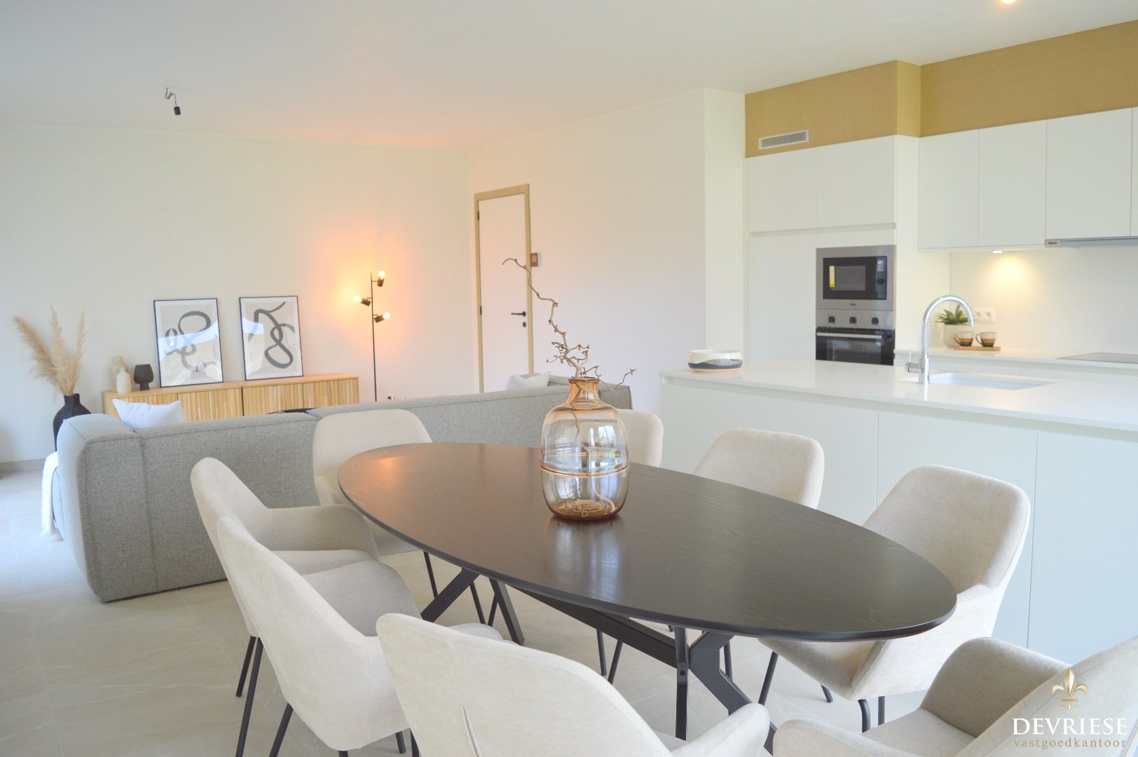 Inkomhal met apart gastentoilet, ruime leefruimte met aansluitend de lichtrijke keuken (voorzien van oven, microgolf, kookplaat, inbouwfrigo, vaatwasmachine).