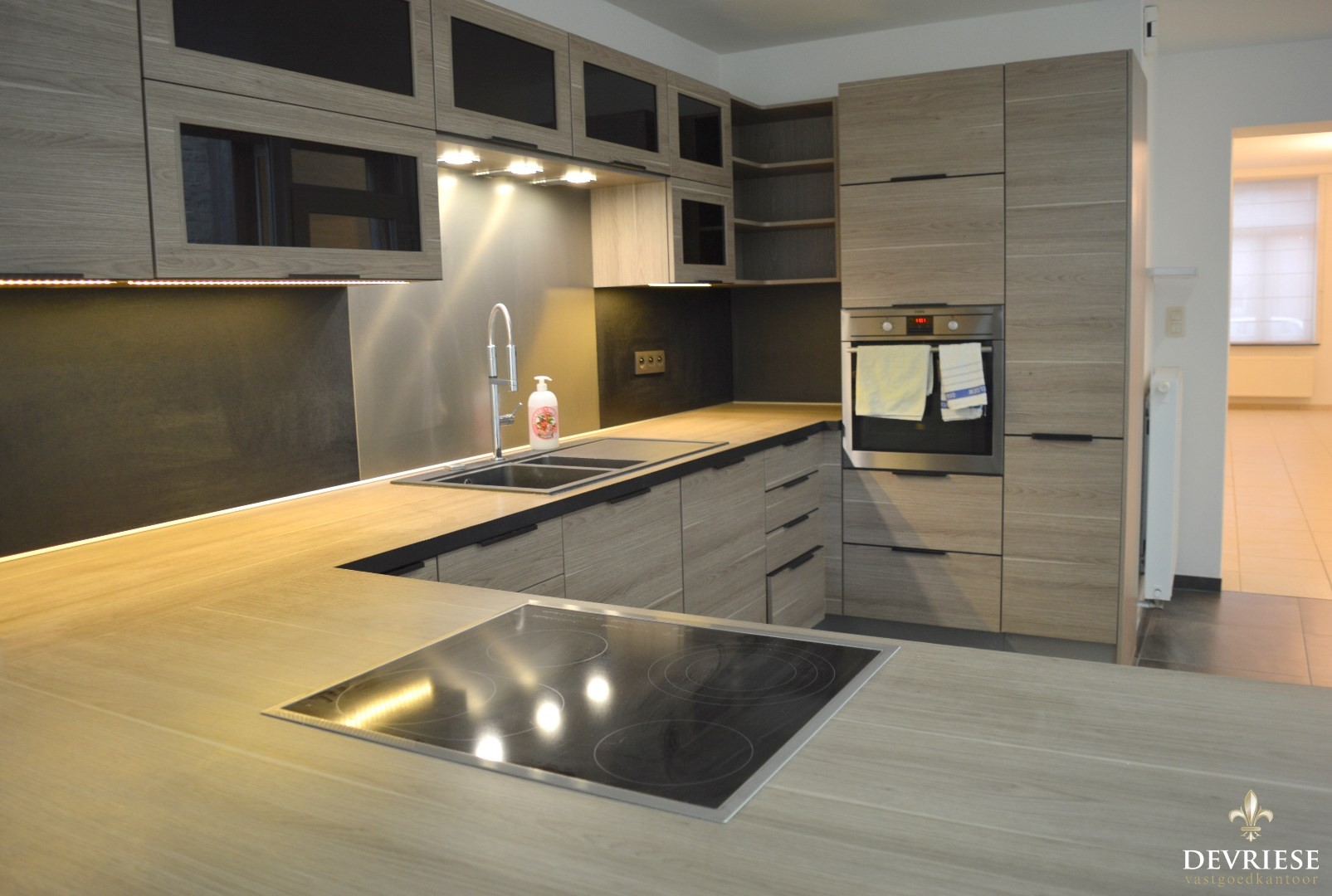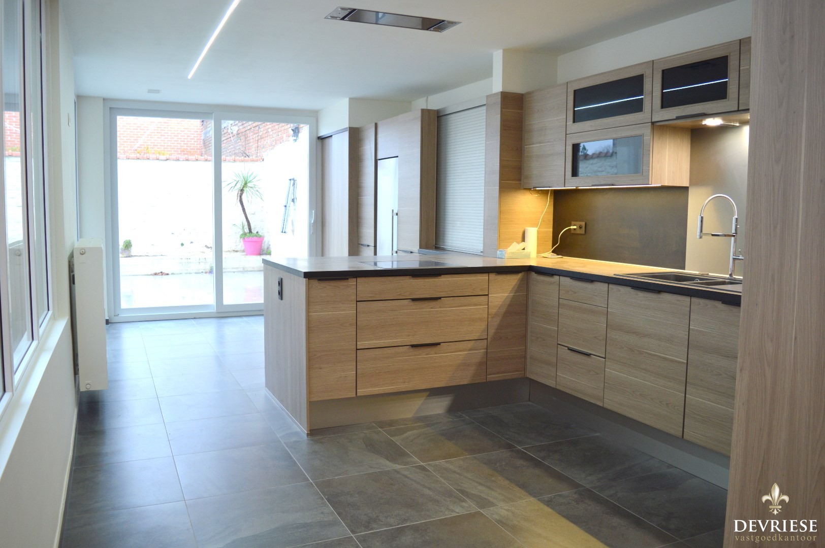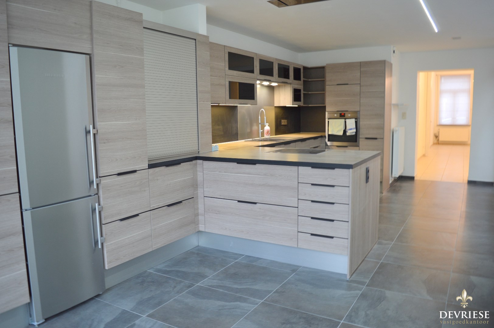 Royale leefruimte met aansluitend de zeer ruime en lichtrijke keuken (voorzien van oven, vaatwasmachine en combi koelkast en diepvries).