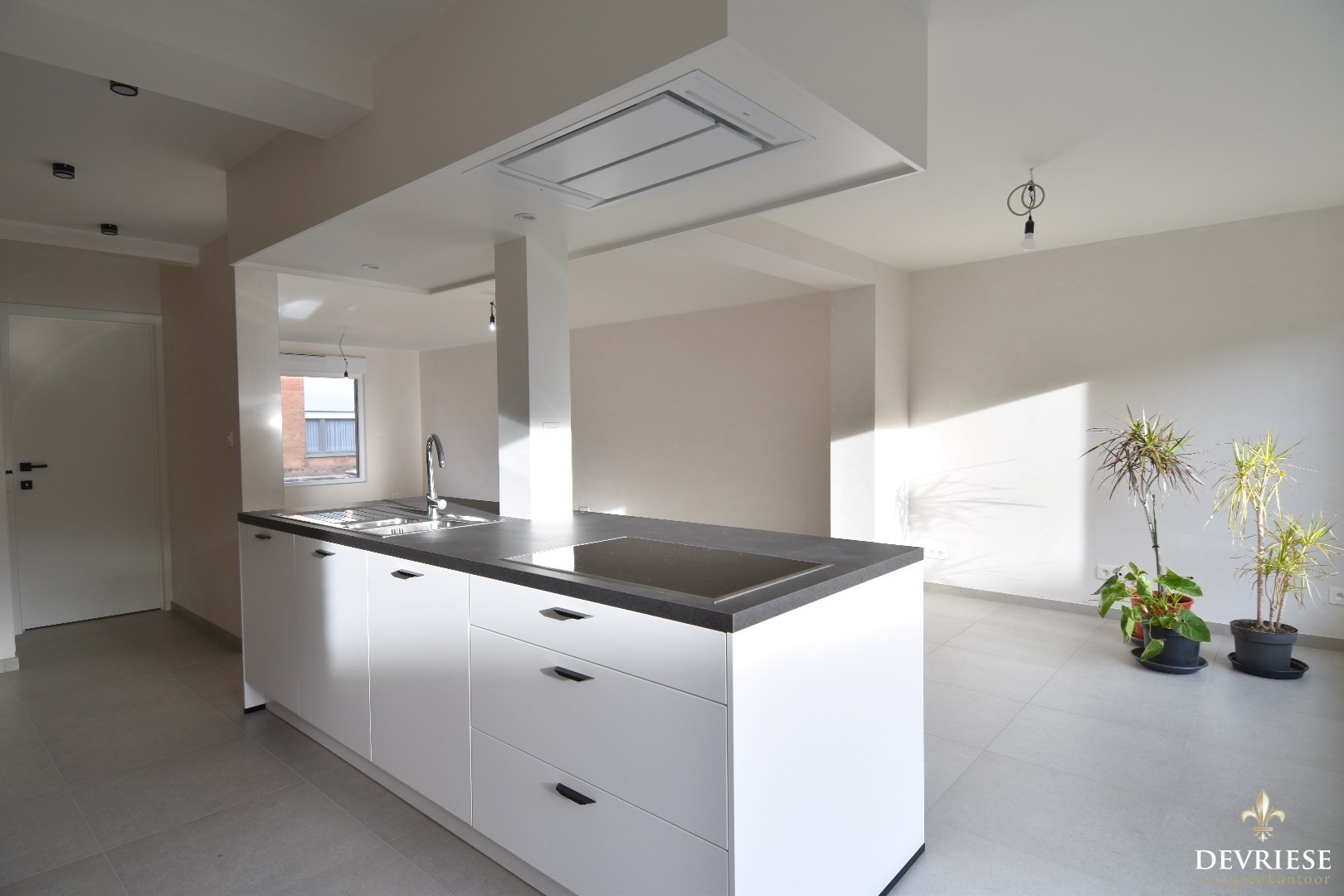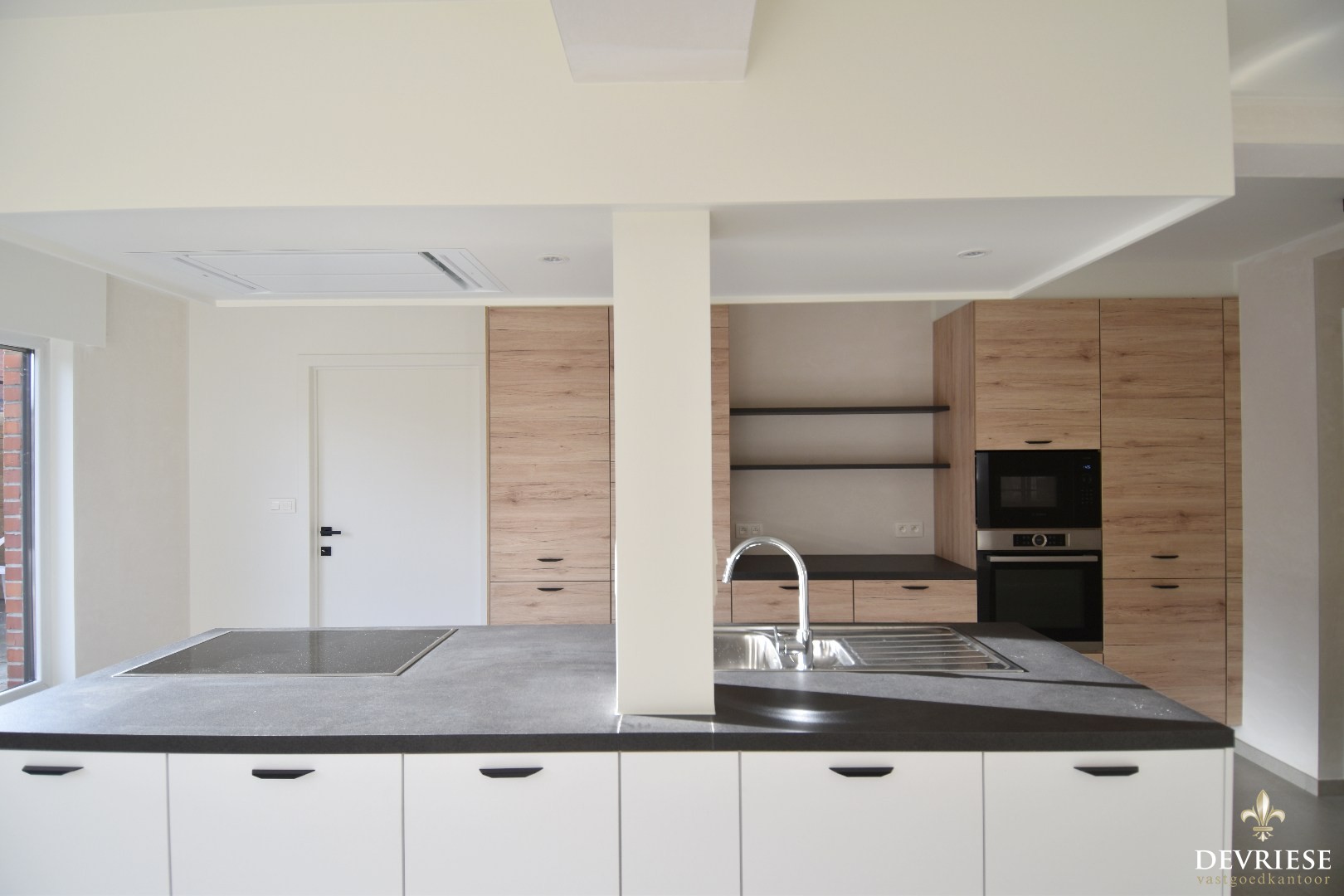 Ruime en lichtrijke living, aansluitend de open keuken met kookeiland en voldoende op maat gemaakte kasten.