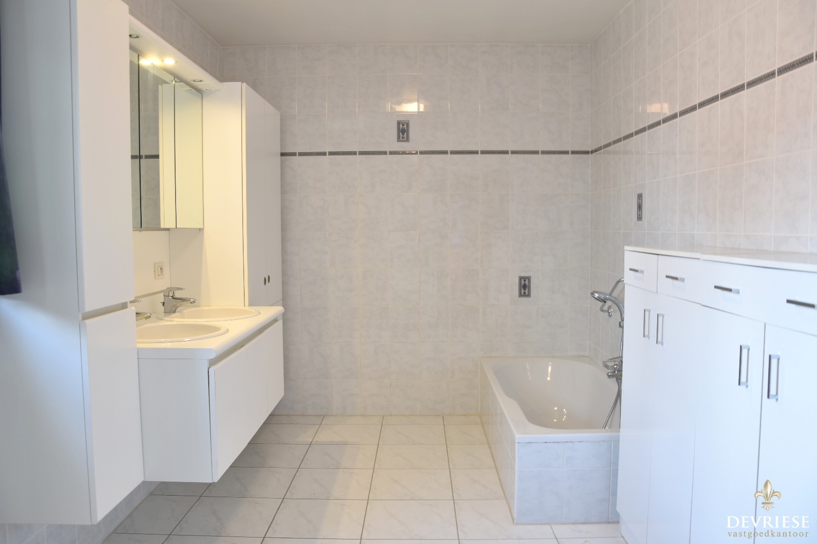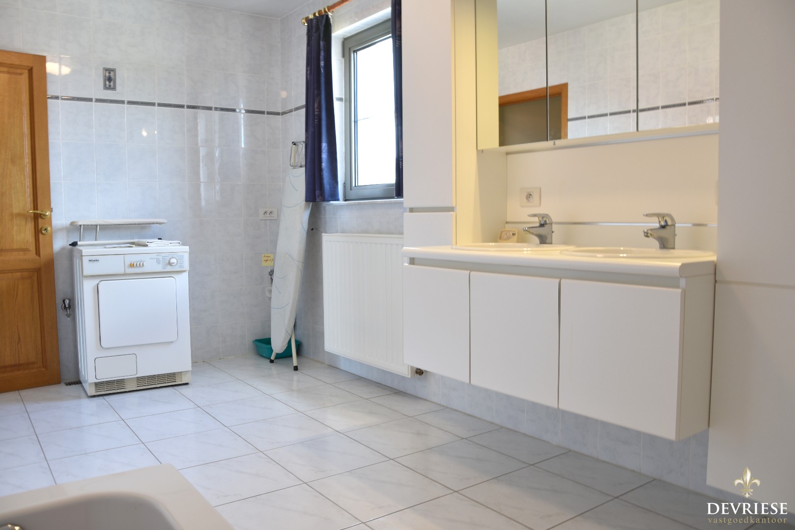 Vanuit de inkomhal is er nog toegang tot het aparte gastentoilet, de enorm ruime badkamer met bad en dubbele lavabo, een extra ruime bergplaats met aansluiting voor de wasmachine en 2 slaapkamers. Achteraan vanuit de hal is er toegang tot een tweede terras.