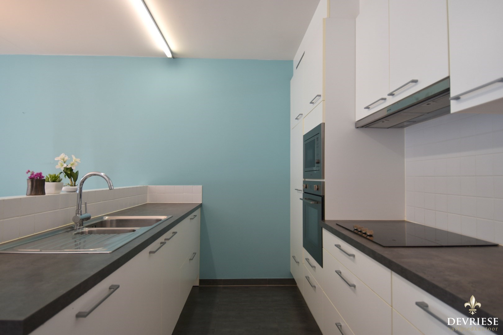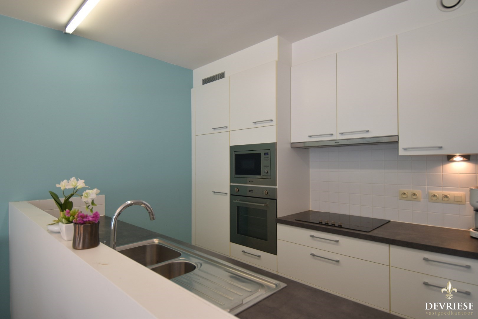 Bij binnenkomst betreed je een aangename leefruimte die bestaat uit een zithoek, eetplaats en een volledig geïnstalleerde keuken. De keuken is uitgerust met hoogwaardige Smeg-toestellen (vaatwasser, oven, ...) en biedt veel opbergruimte. Bijkomend ook nog een aparte berging.
