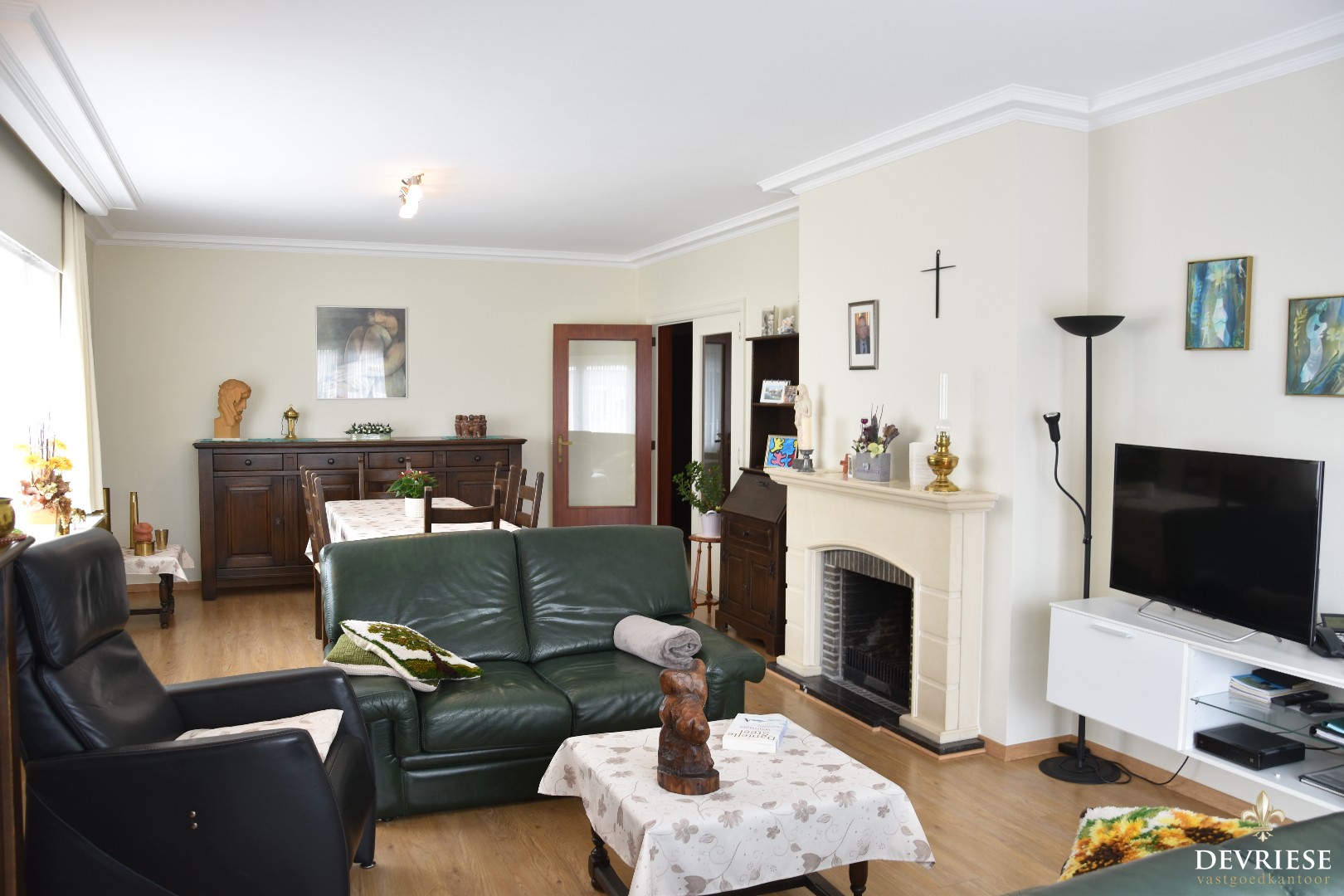 Via de inkomhal komt u in de ruime woonkamer die veel lichtinval geniet dankzij de grote raampartijen. Gezelligheid troef met een open haard die nog steeds functioneel is. Hier is er toegang tot het terras. De verzorgde keuken bevindt zich naast de woonkamer en biedt voldoende plaats om er apart te tafelen.