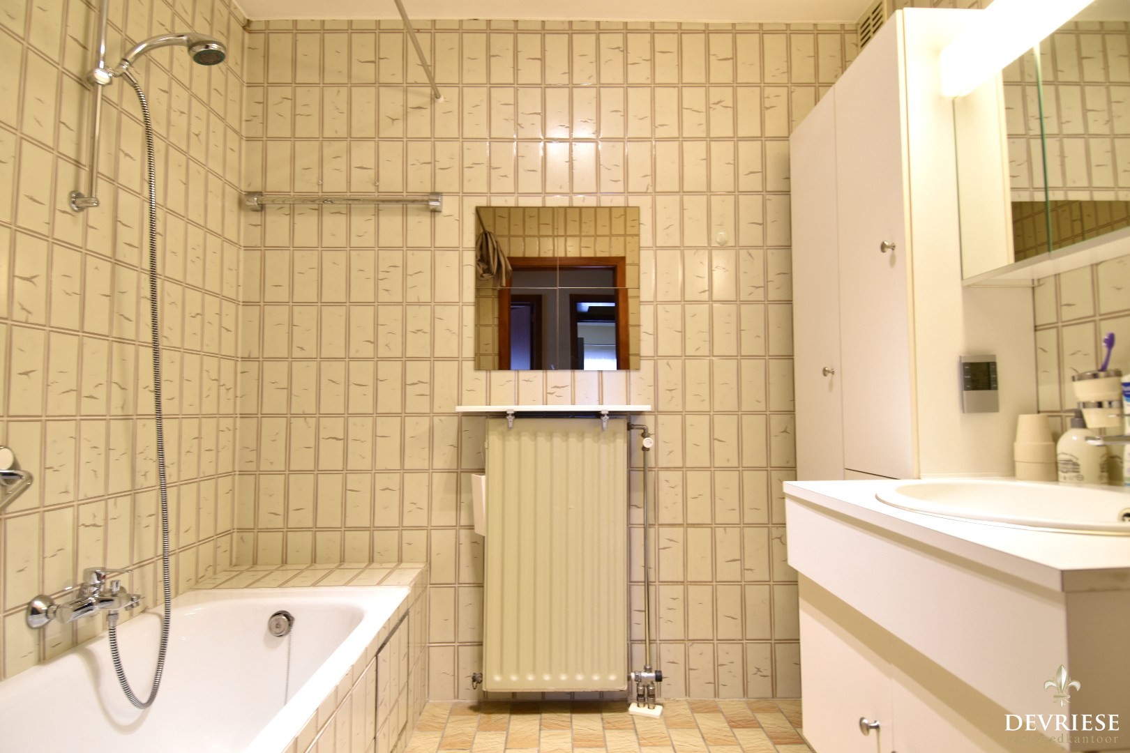 Aangename leefruimte met grote raampartijen en toegang tot het balkon aan de voorzijde van het appartement, geïnstalleerde keuken met gezellige ontbijthoek en aparte berging, een ruime badkamer uitgerust met ligbad en lavabo, 2 volwaardige slaapkamers, apart toilet en een bureauruimte/berging.