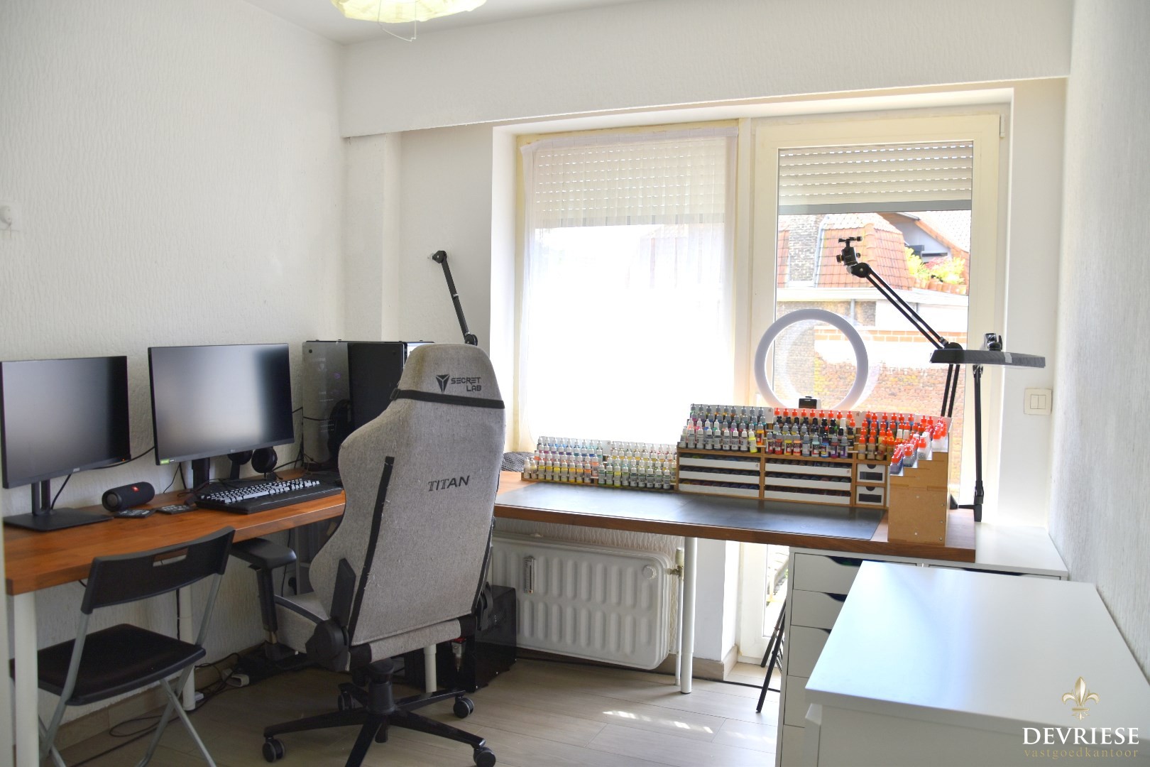 Een lichtrijk geheel bestaande uit eetplaats en salon. Hier treffen we eveneens een vernieuwde keuken, voorzien van alle hedendaagse snufjes.