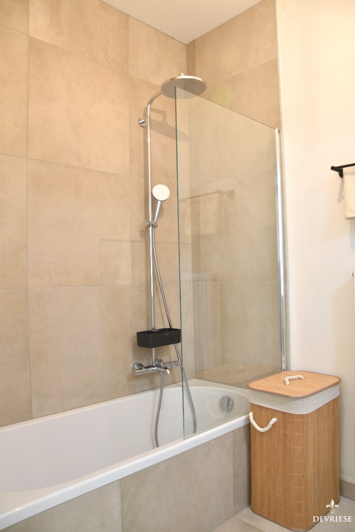 De badkamer is voorzien van een lavabomeubel en een ligbad met douchemogelijkheid