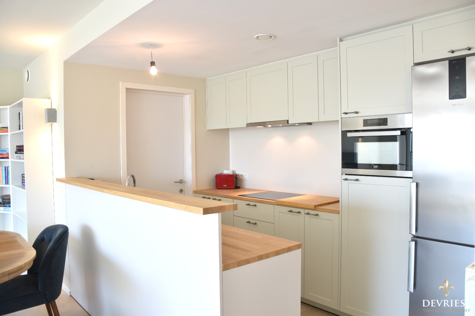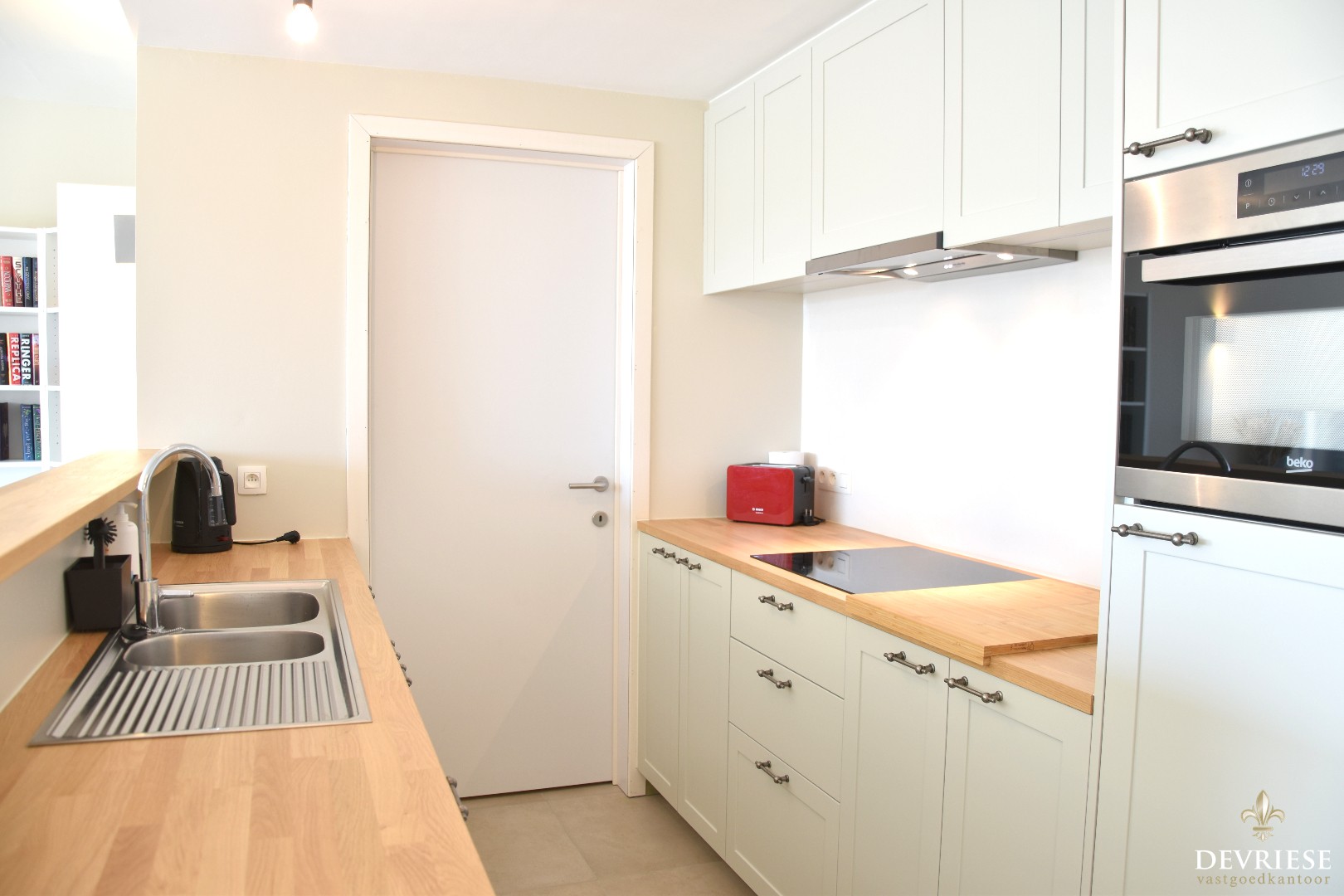 Een volledig geïnstalleerde keuken, voorzien van alle comfort met een aanpalende berg-/wasruimte.