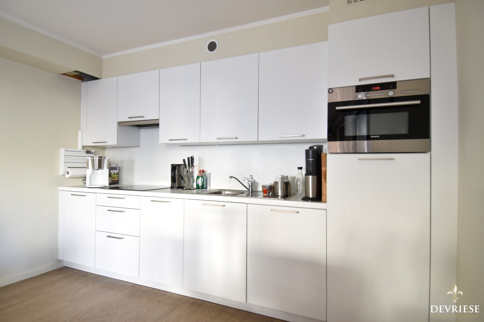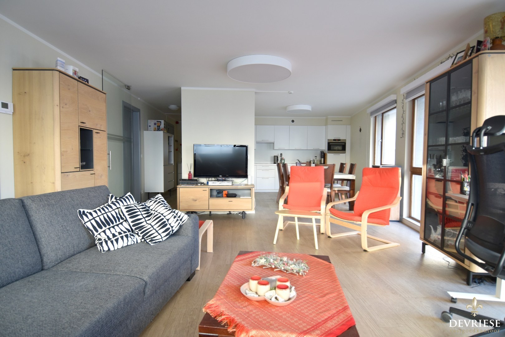 De zonnige leefruimte vormt het hart van het appartement en omvat een gezellige zitruimte met eetplaats en een volledig geïnstalleerde keuken.