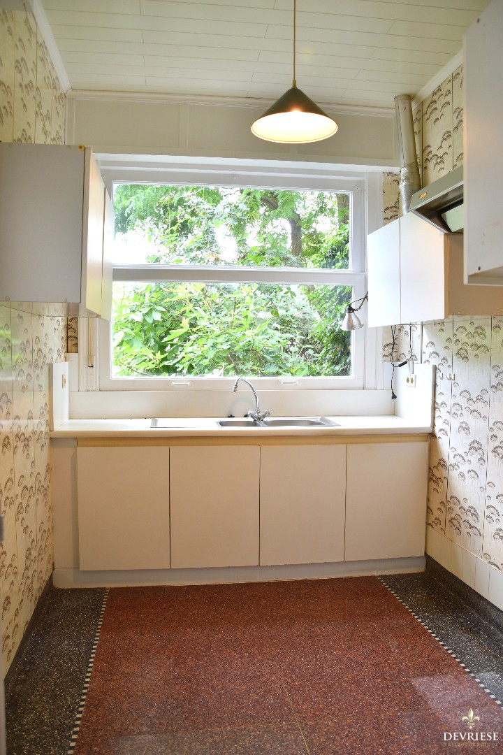 Een aparte inkomhal met van hieruit toegang tot de leefruimte. Op dit verdiep ook nog een apart gastentoilet en de keuken die uitkijkt op het groen in de tuin. Naast de keuken is een terras voorzien. Vanop dit terras is er via enkele treden toegang tot de leuke stadstuin.