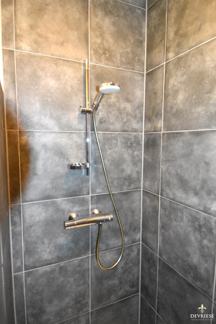 De badkamer is uitgerust met een inloopdouchedouche en stijlvol lavabomeubel.