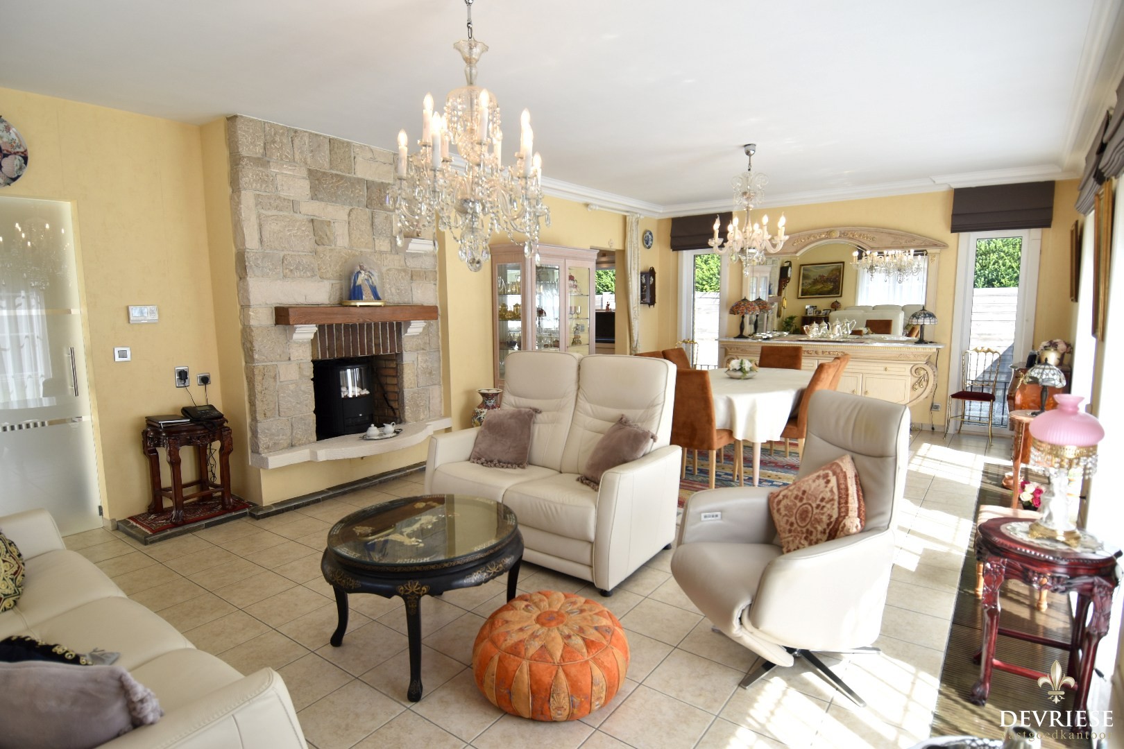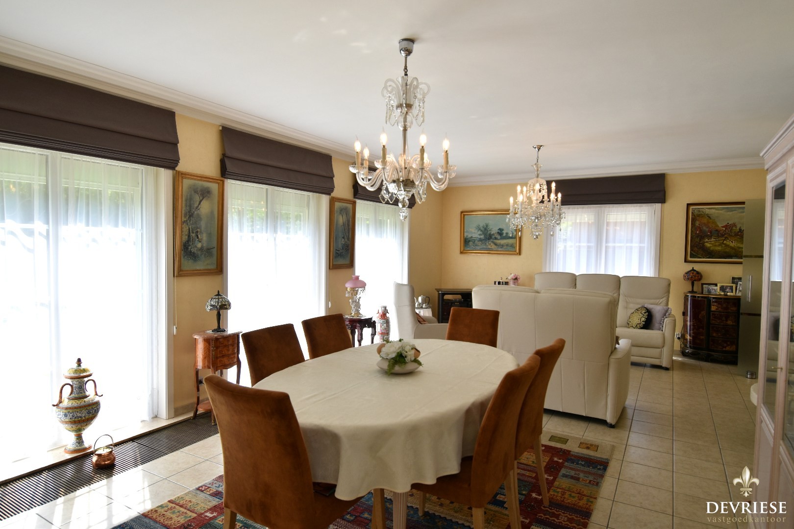 De lichtrijke leefruimte bestaat uit een gezellige zithoek en een eetplaats, met grote raampartijen die zorgen voor een aangenaam ruimtegevoel en veel natuurlijk licht.