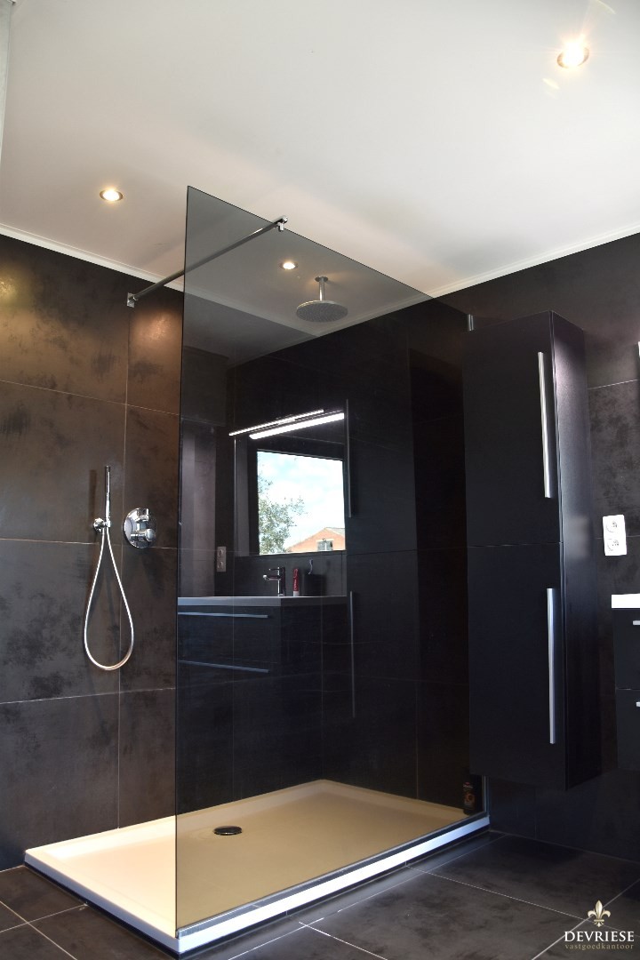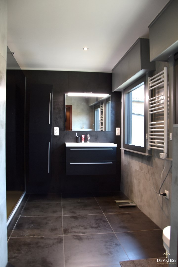 De vernieuwde badkamer omvat een ruime inloopdouche, lavabomeubel en een tweede toilet.