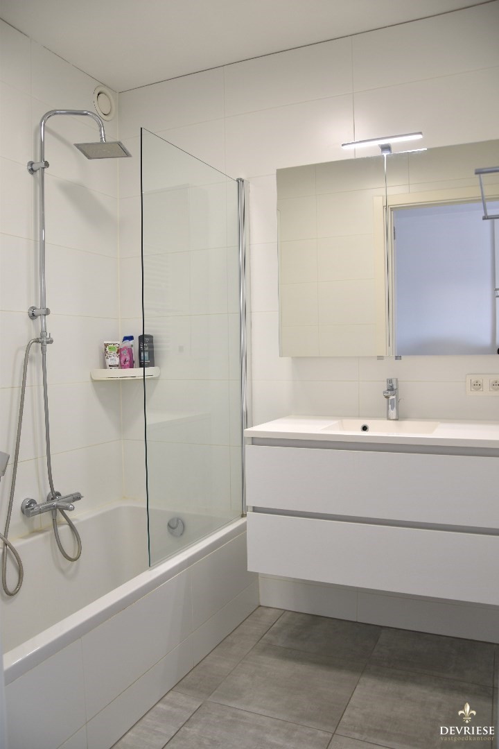 Badkamer met ligbad/douche en lavabomeubel. Apart toilet en een aanpalende wasplaats met extra opbermogelijkheden.
