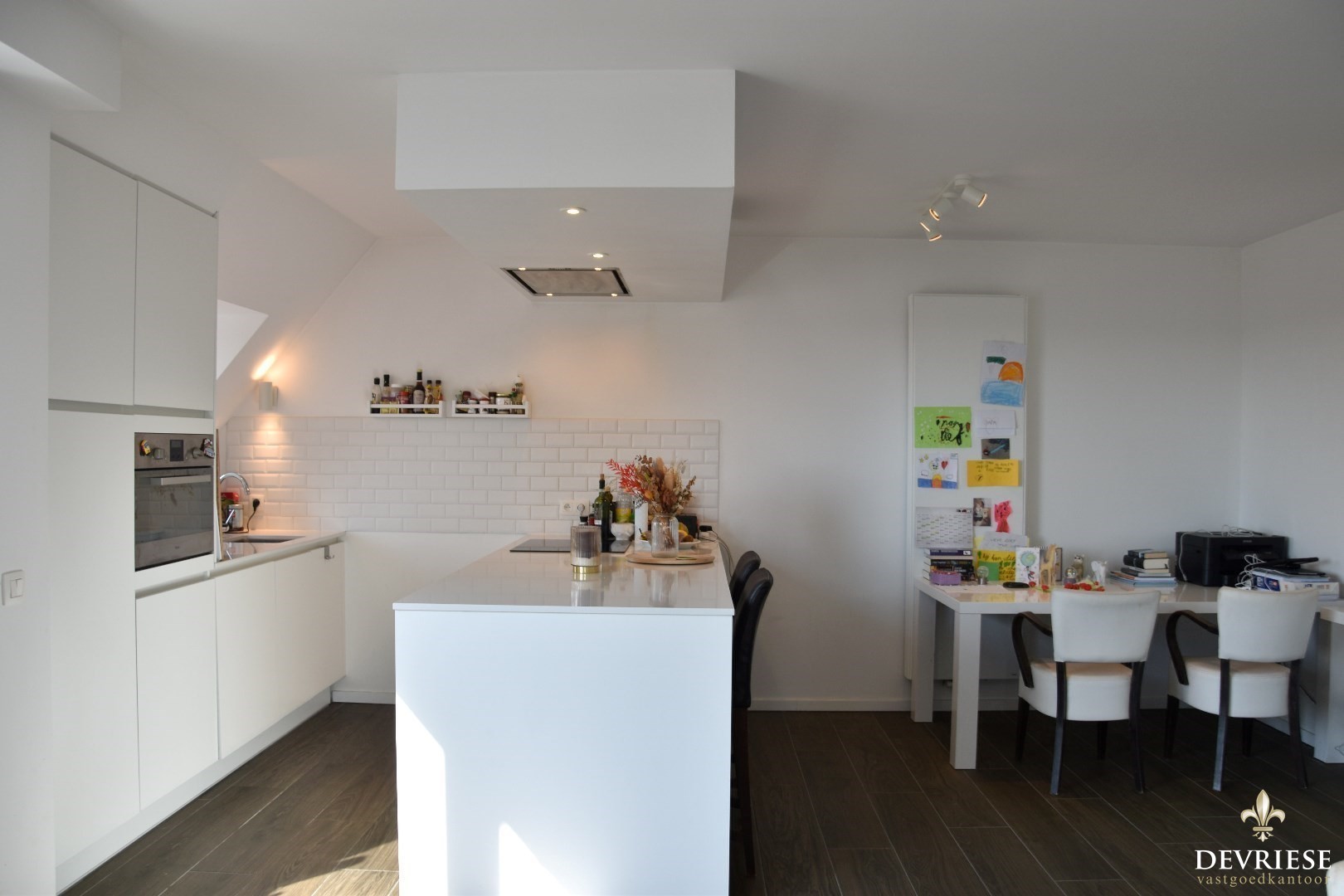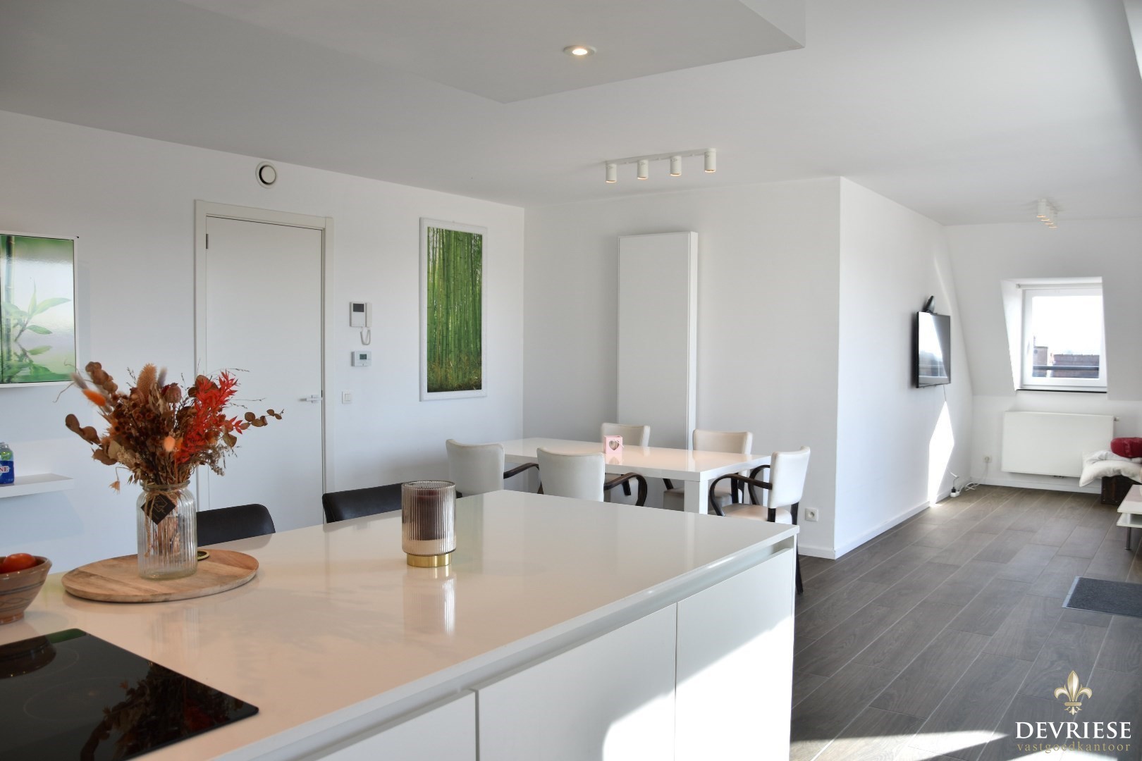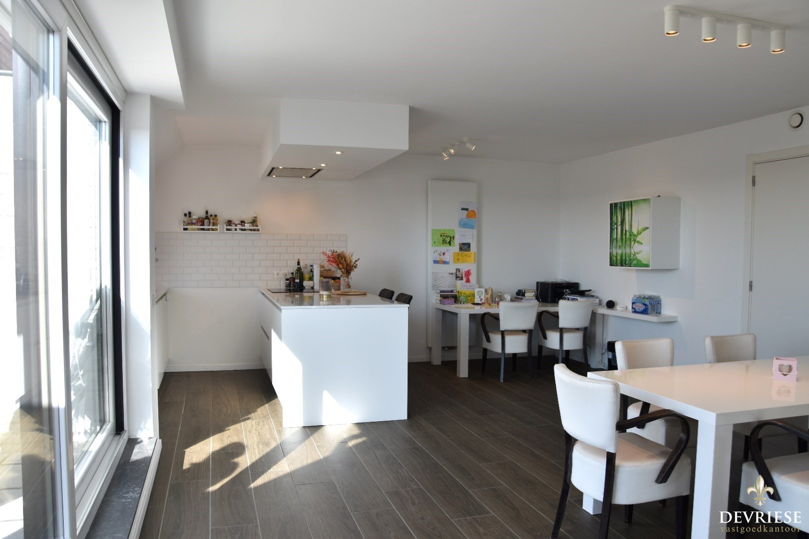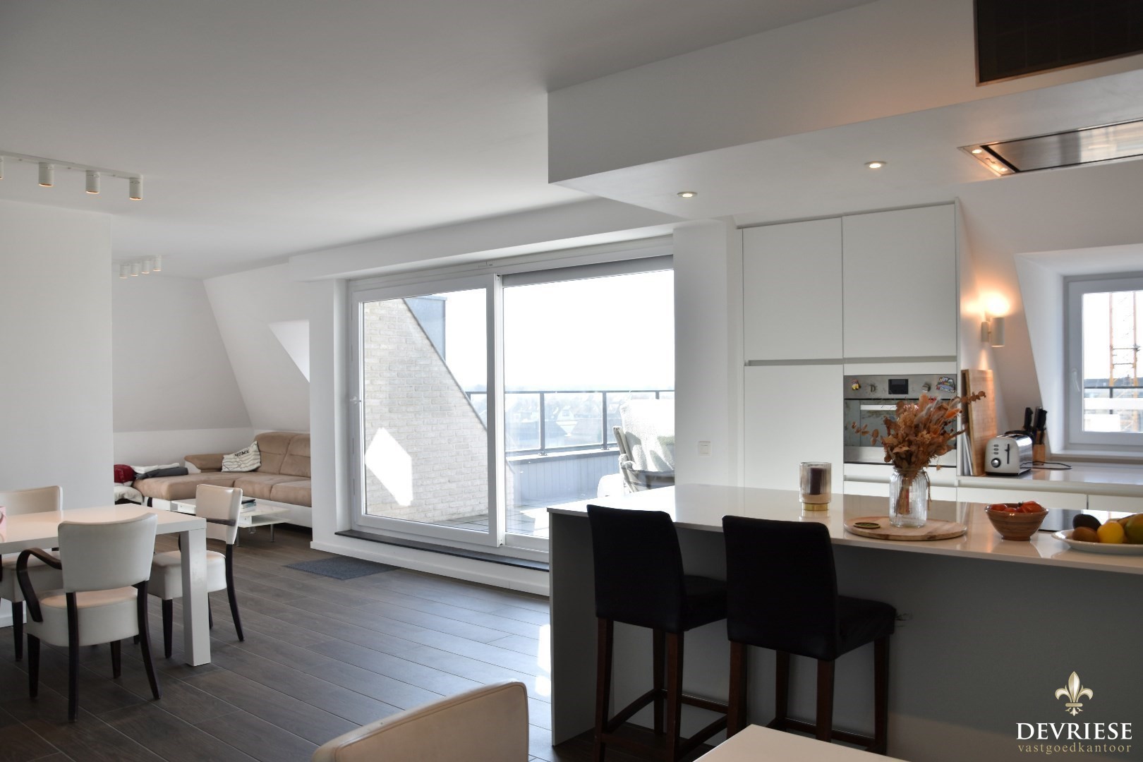 Lichtrijke leefruimte met volledig geëquipeerde keuken, eetplaats en een gezellige zithoek. De leeftruimte geeft, via het schuifraam, uit op zonnige terras.
