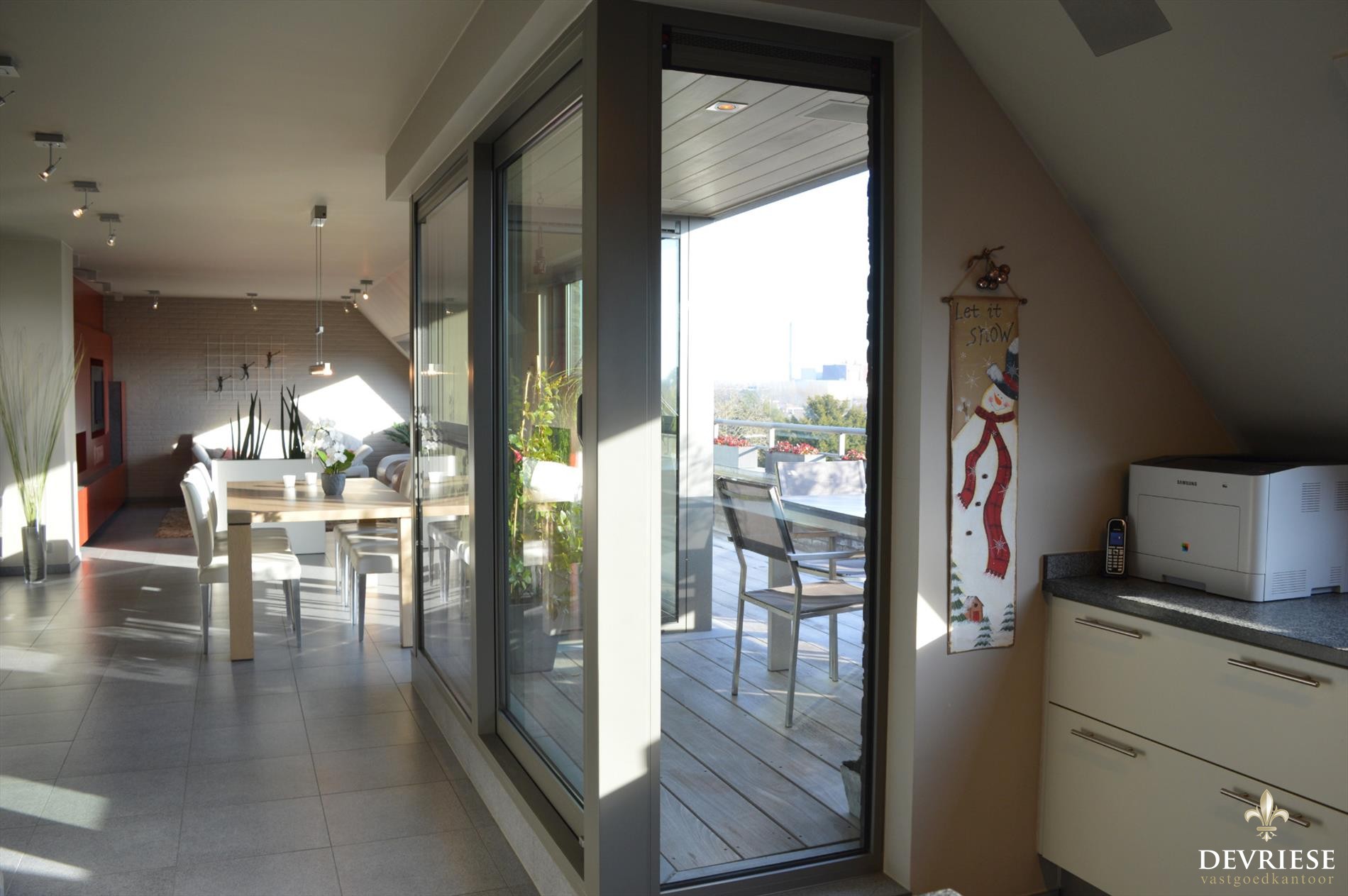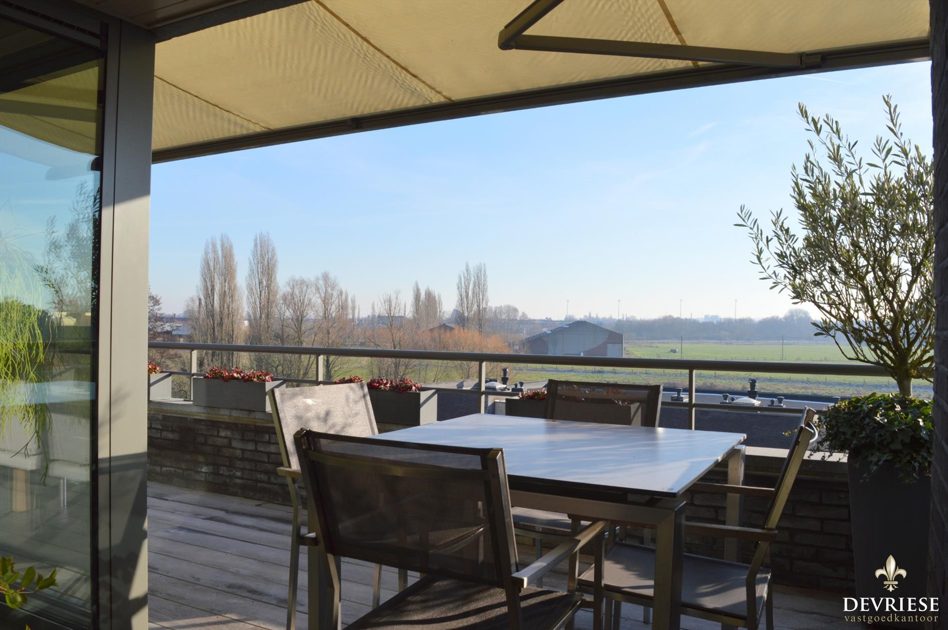 Via het schuifraam in de ... woonkamer komen we op het groot, zuid-oostgericht dakterras van 17m².