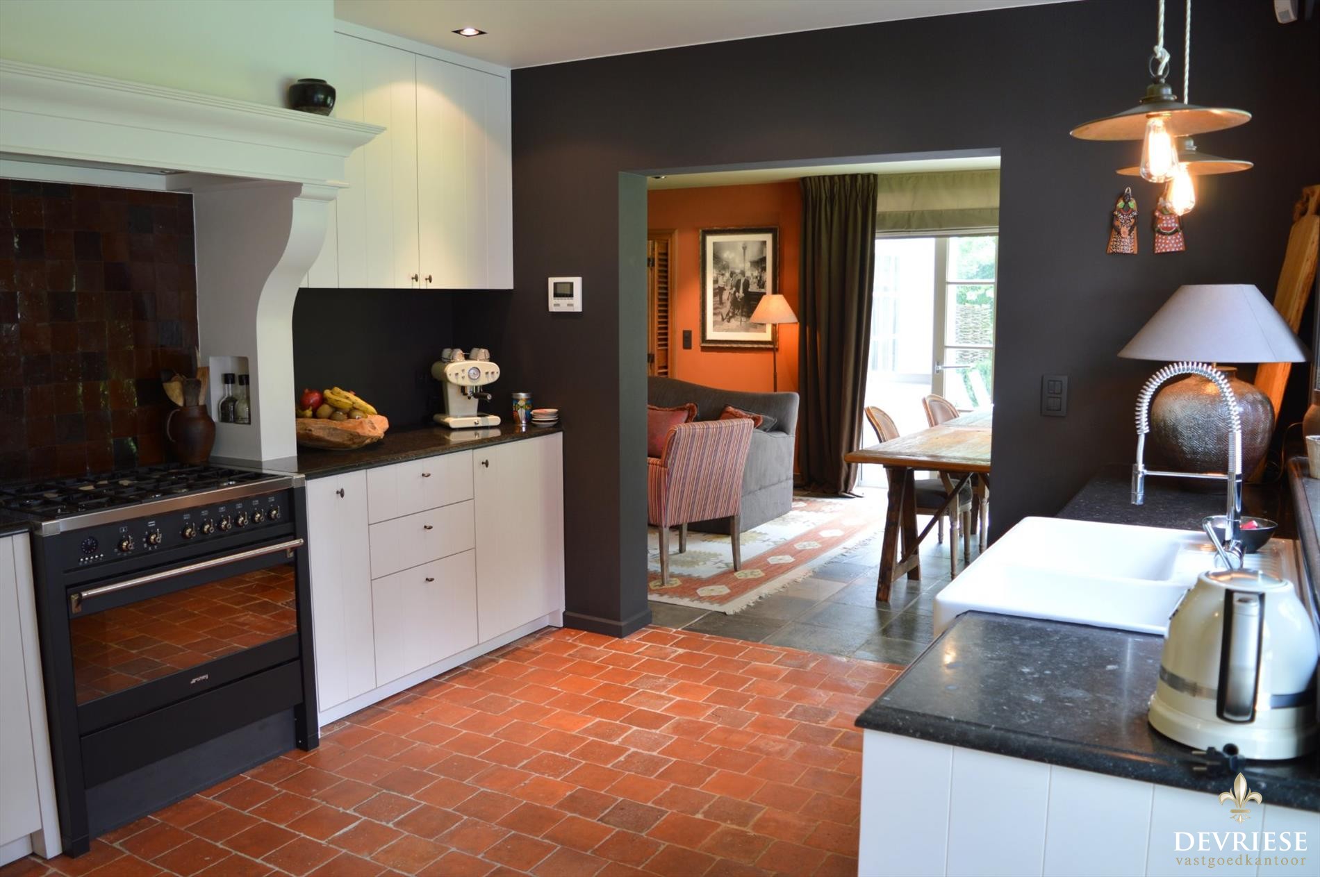 U betreedt de gezellige woonkamer, die toegang biedt tot de eetkamer en aansluitend de recente smaakvol vernieuwde keuken. Vanuit deze ruimtes is er telkens zicht op de prachtig aangelegde tuin rondom de woning. Op de gelijkvloerse verdieping treffen we een ruime bureauruimte met afzonderlijke archiefruimte, wasplaats en een garage (nu ingericht als polyvalente ruimte) met bijhorende carport die volledig afgesloten kan worden. Daarenboven ook toegang tot de praktische voorraadkelder.
