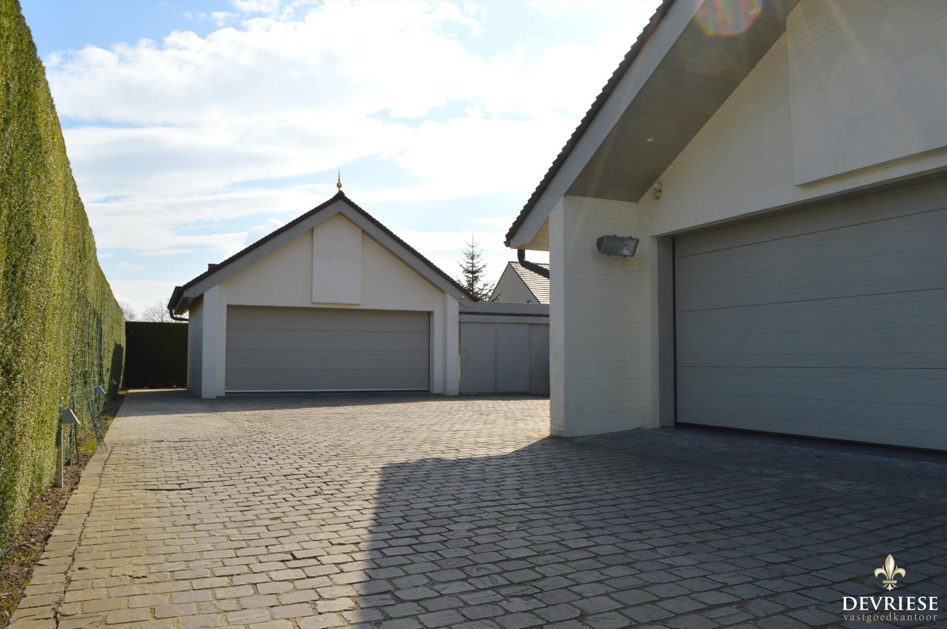 Aan parkeerruimte geen gebrek door de dubbele garage in de woning en de aparte garage achteraan de eigendom. Zowel onder de woning als onder de aparte garage is er een praktische kelderruimte te vinden.