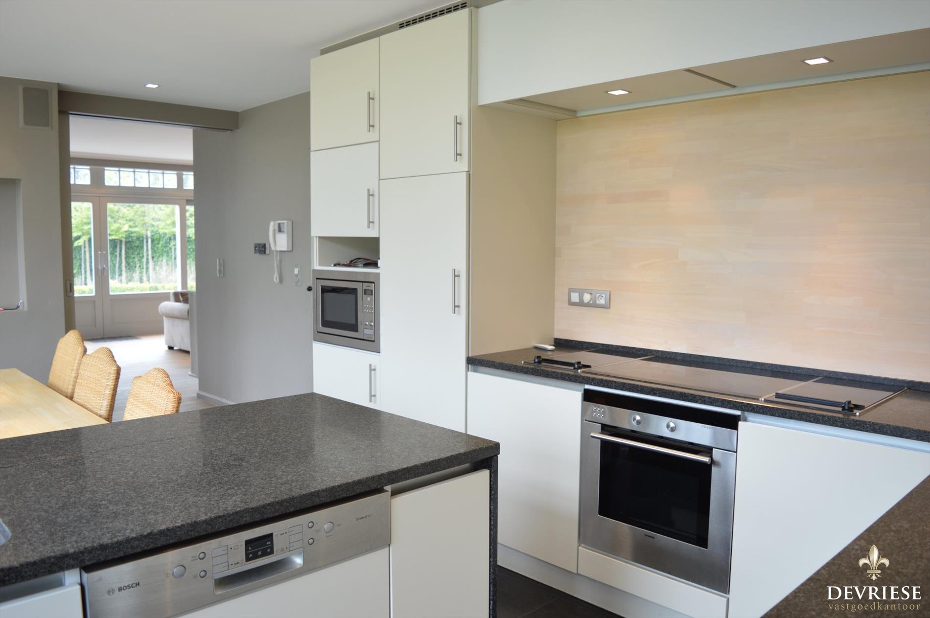 Aparte inkomhal met gastentoilet die toegang geeft tot de gezellig ingerichte leefruimte met open haard en mooi zicht op de tuin door de vele glaspartijen. Daarnaast is er de volledig ingerichte keuken met bijhorend 2 bergruimtes. Vanuit de ene bergruimte is er toegang tot de zolder.