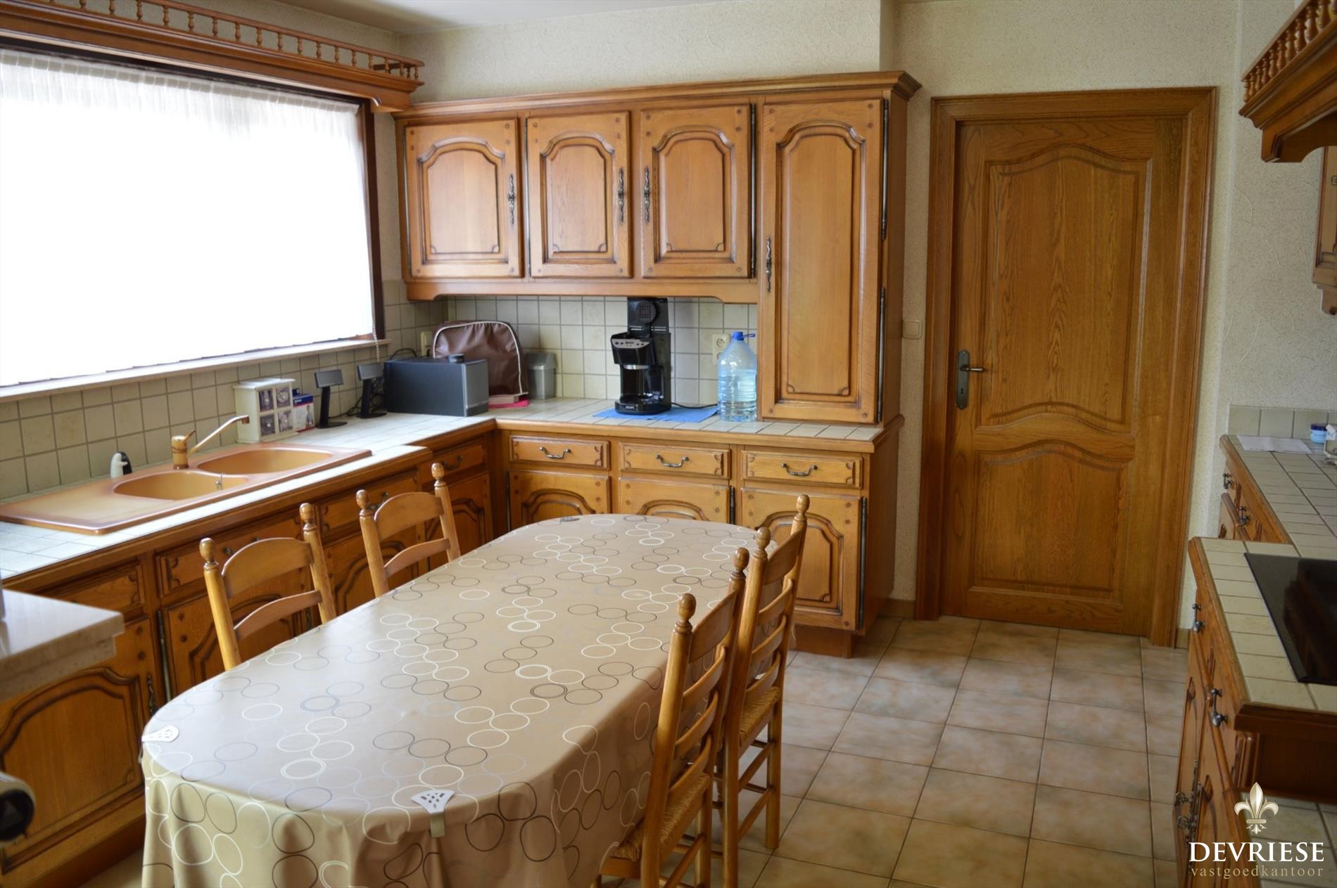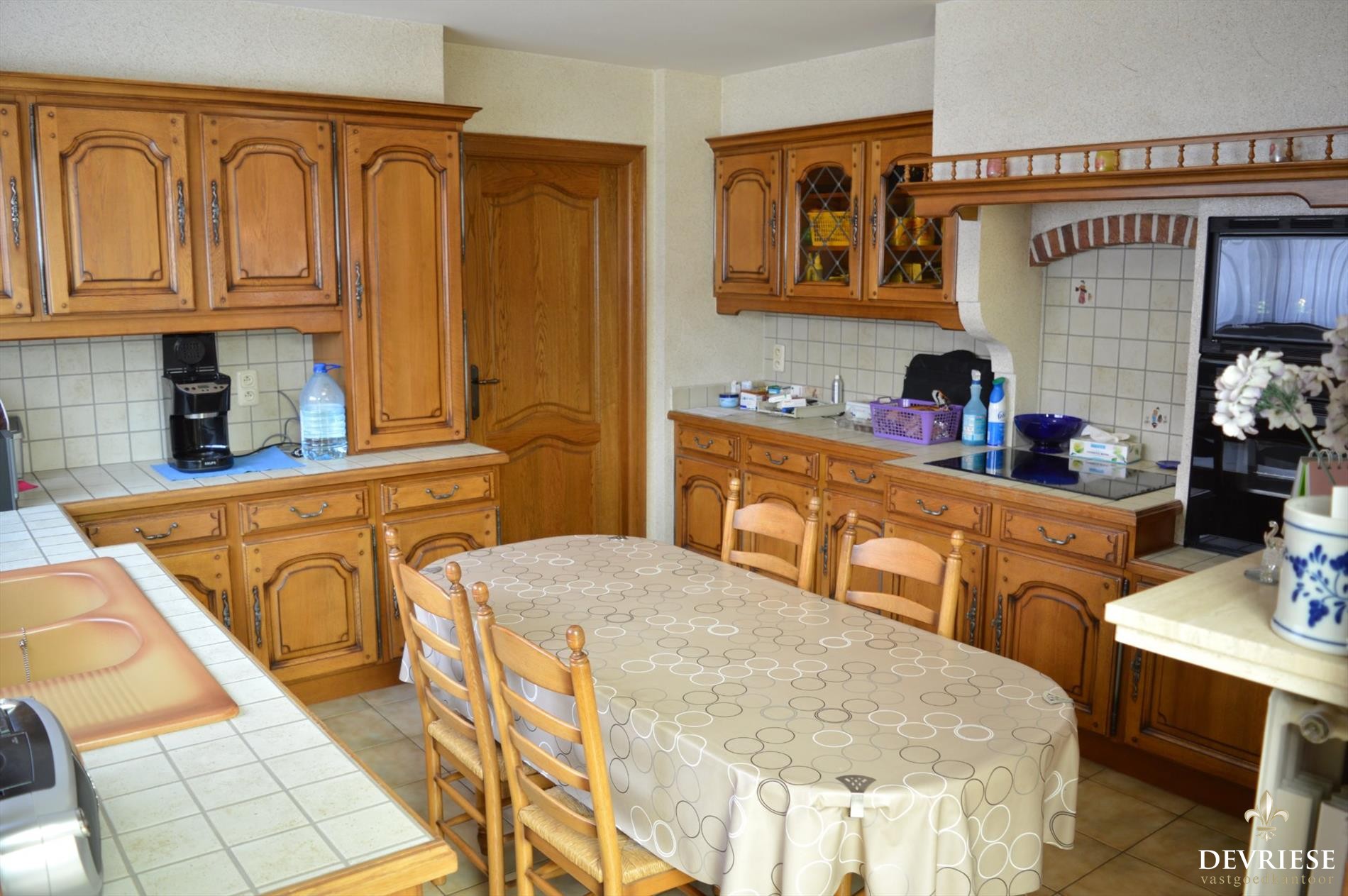 Ook de keuken kijkt uit op de tuin met visvijver en biedt voldoende plaats om met het volledige gezin te tafelen.