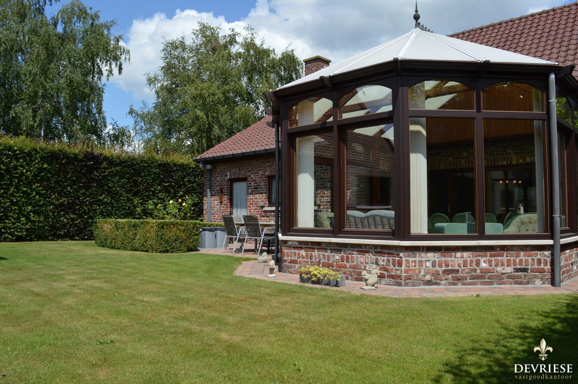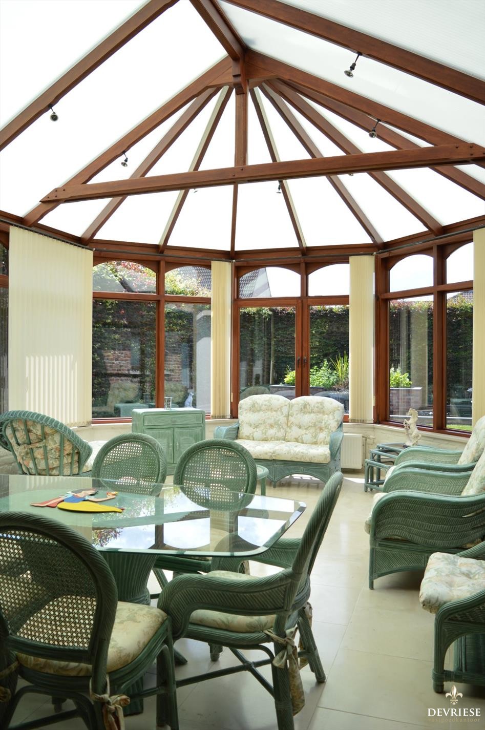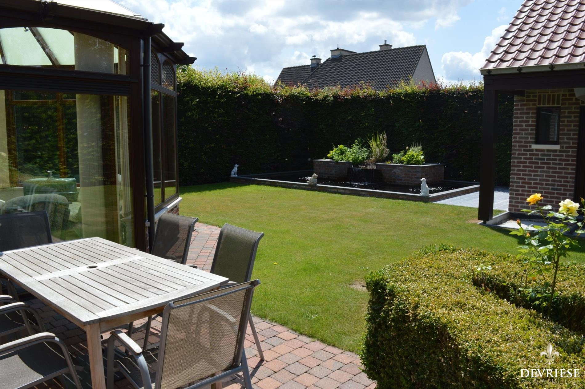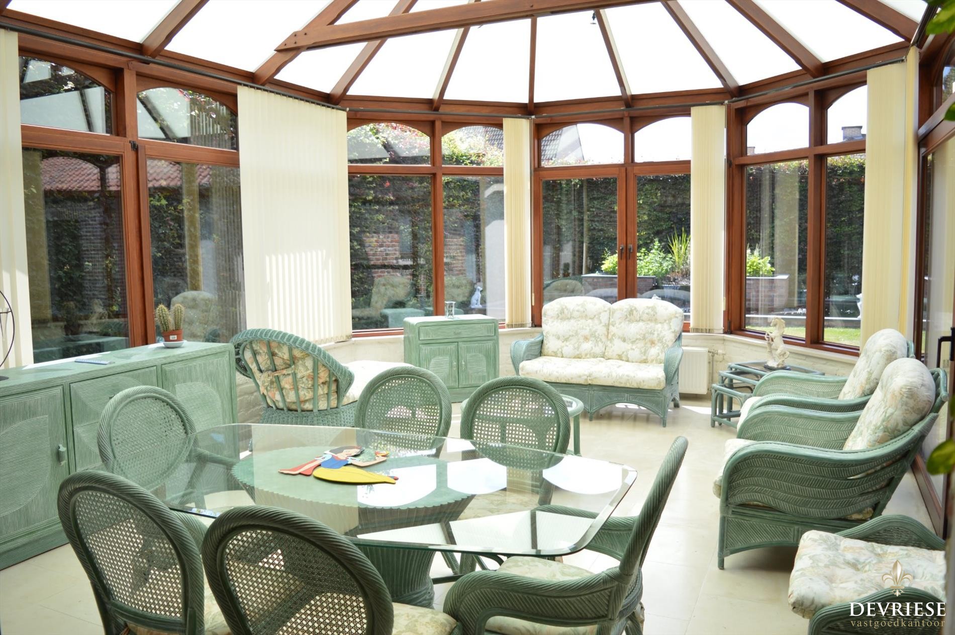 De veranda die is aangebouwd draagt bij aan het grote bewoonbare oppervlak van deze woning en het is er in elk jaargetijde zeer fijn vertoeven gezien de enorme lichtinval en zicht op de fraai aangelegde tuin. Deze tuin ligt er zowel voor als achteraan onberispelijk bij en is uitermate verzorgd.