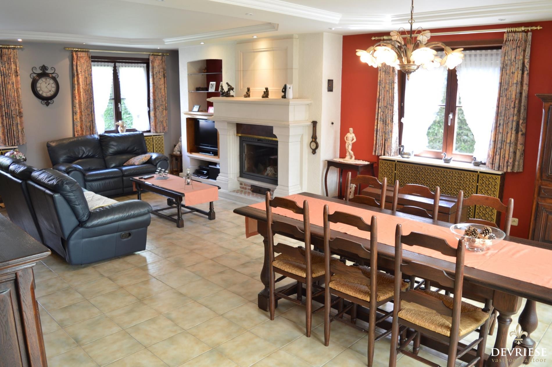 Via de ruime inkom met gastentoilet komen we in de woonkamer waar de luxueuze afwerking ons meteen opvalt. De speciale spuittechnieken in de hal maken hier plaats voor textielbehang. Verder een prachtige schouw met ingebouwde houtcassette en een uitgewerkt plafond met inbouwspots.