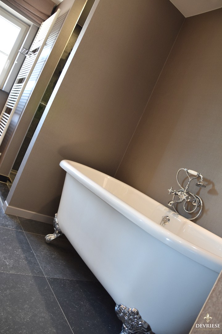 Zalige badkamer mét luxueus ligbad, onderhoudsvriendelijke inloopdouche en een dubbel lavabomeubel.