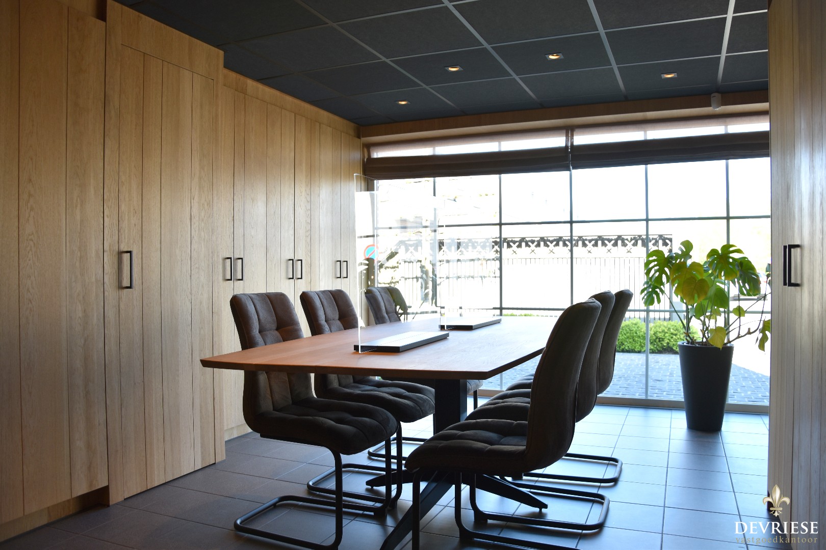 De oorspronkelijke garage werd omgebouwd tot een knappe vergaderzaal, met op-maat-gemaakte kasten.