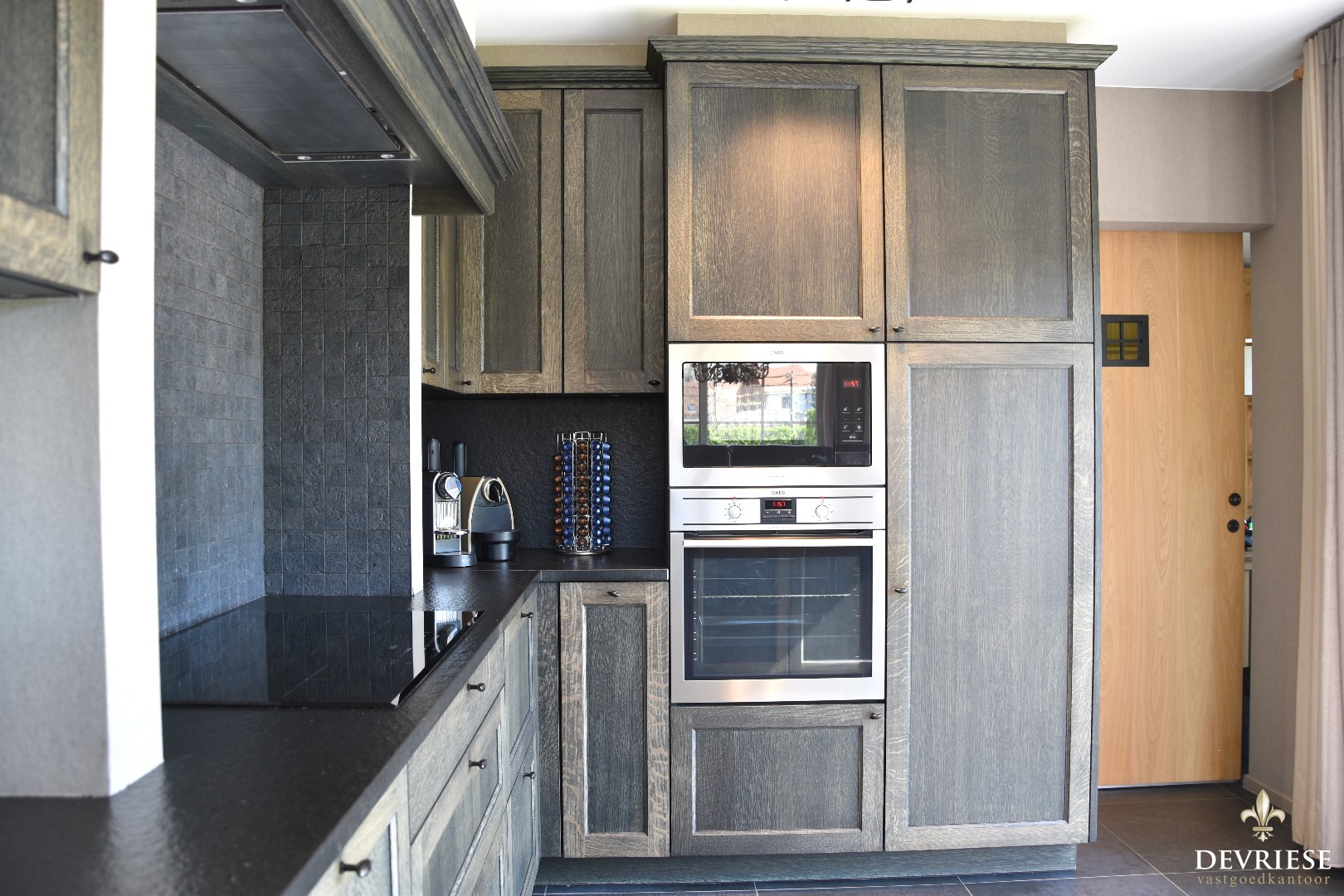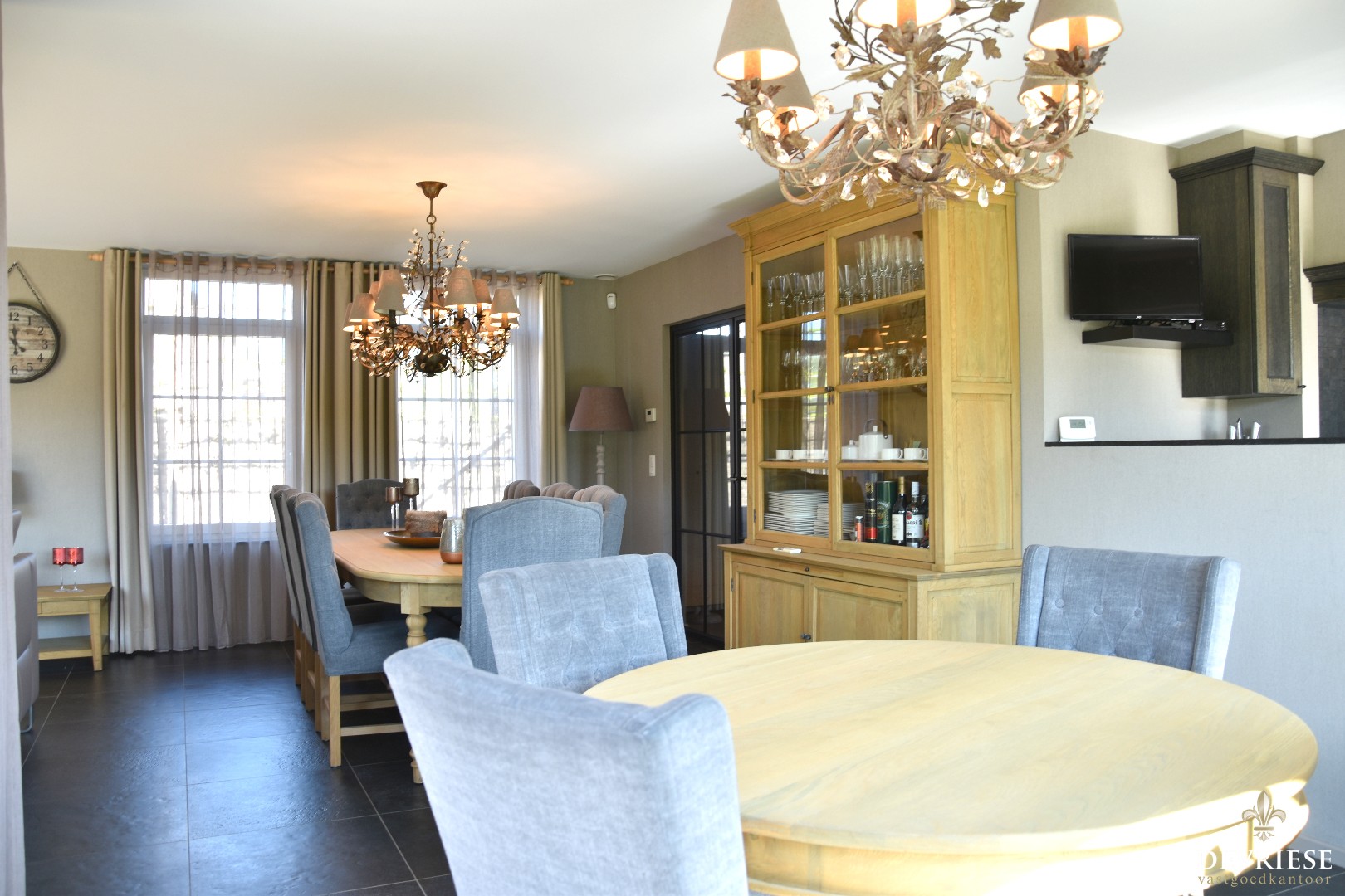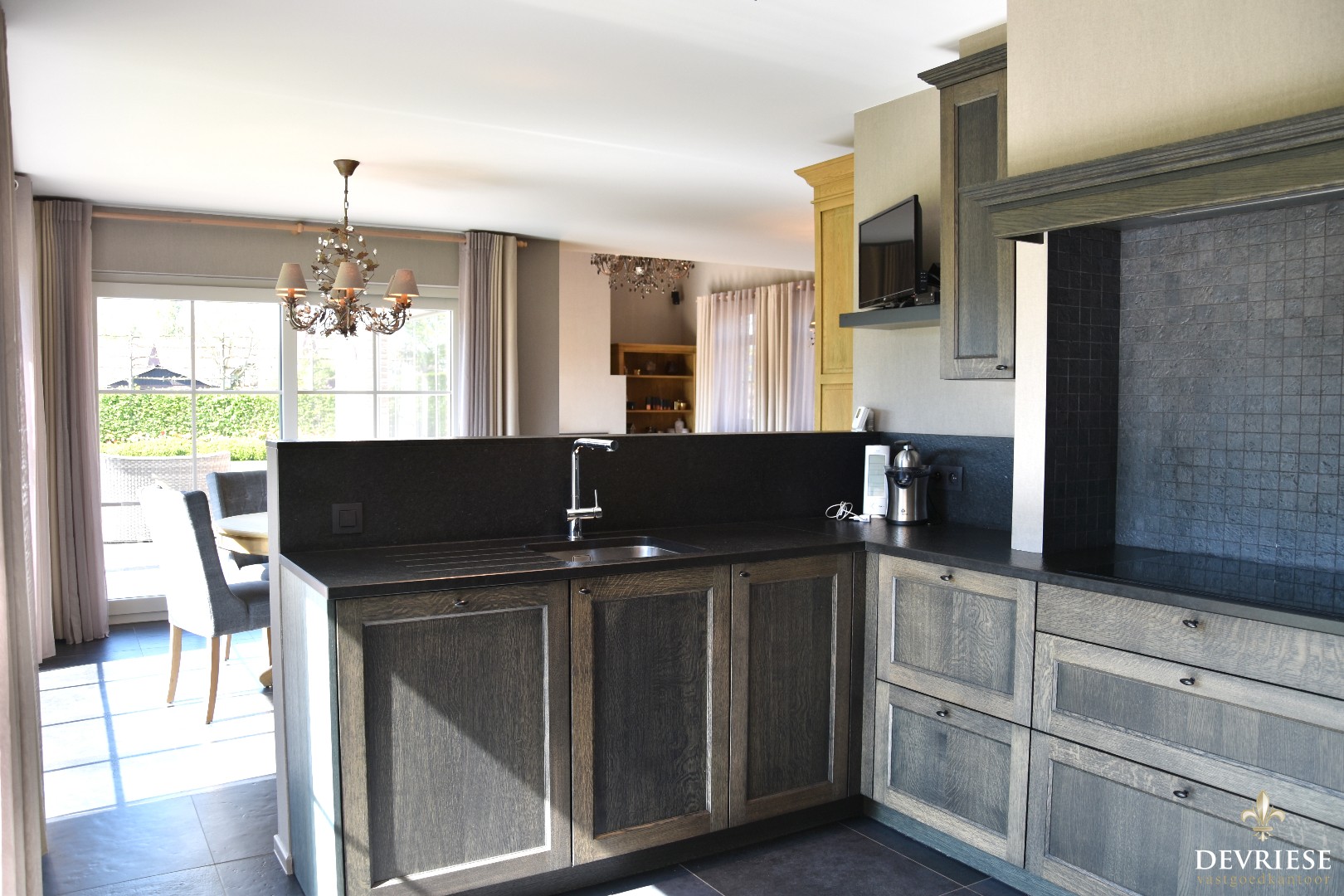 Een open leefruimte bestaande uit ontbijthoek, eetgedeelte en een geïnstalleerde keuken (massief eik - werkblad in gebrande natuursteen) met kwalitatieve toestellen van het merk AEG.