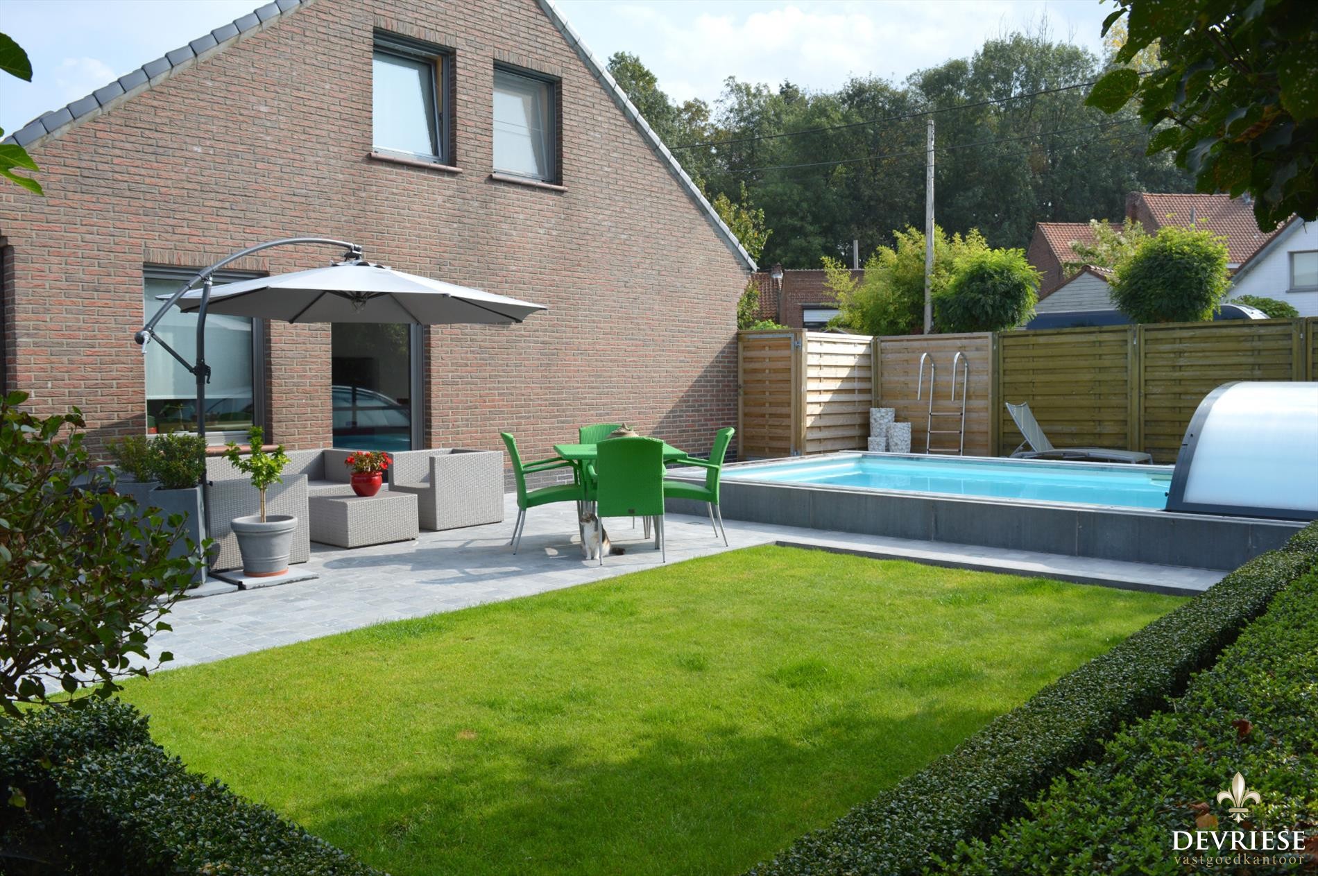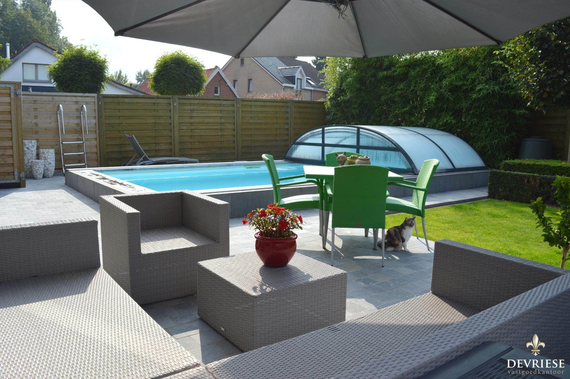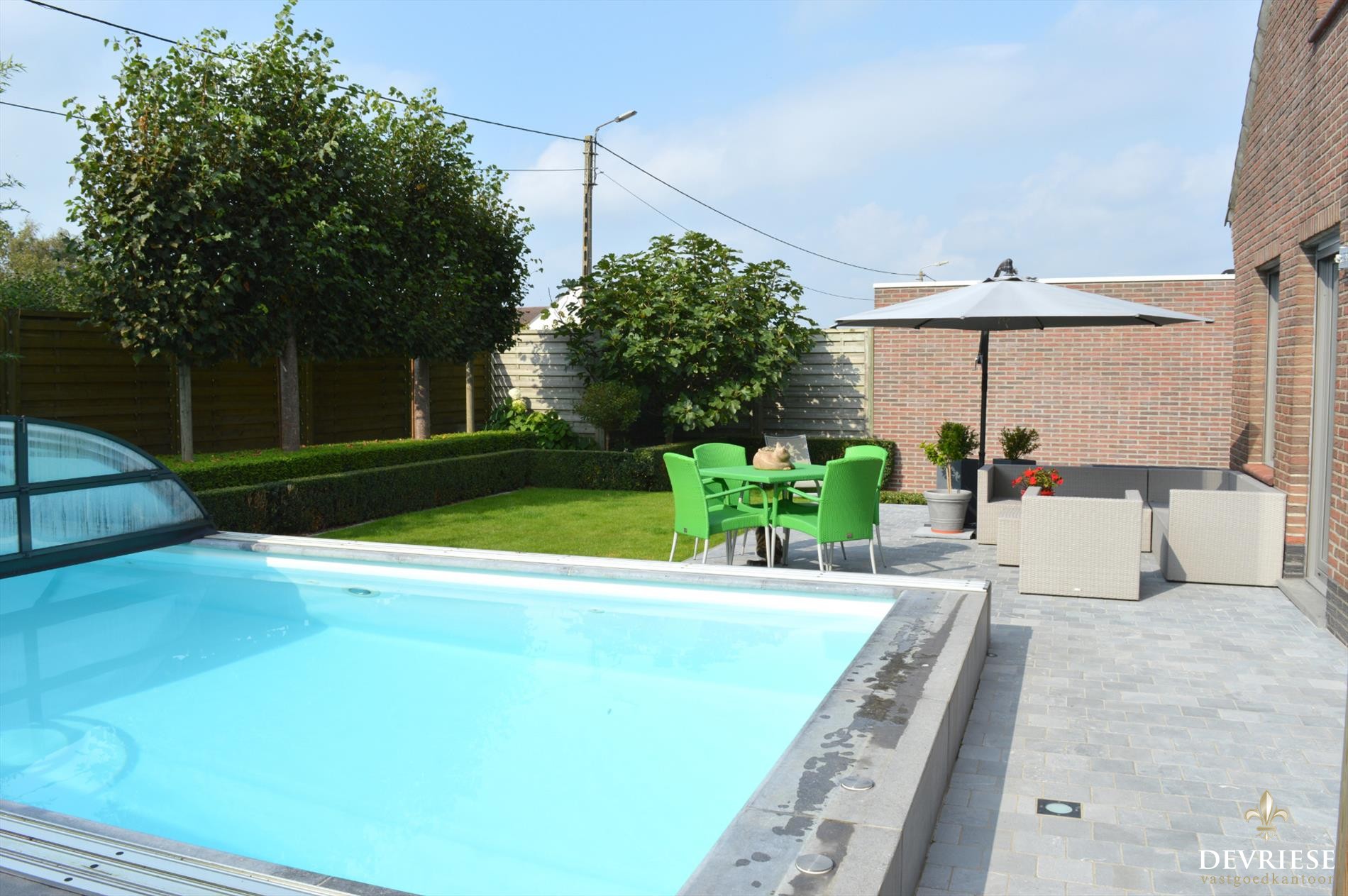 De tuin is heel fraai aangelegd met zwembad, zonneterras,... en werkelijk een streling voor het oog. Ook de voortuin straalt en ligt er perfect bij.
