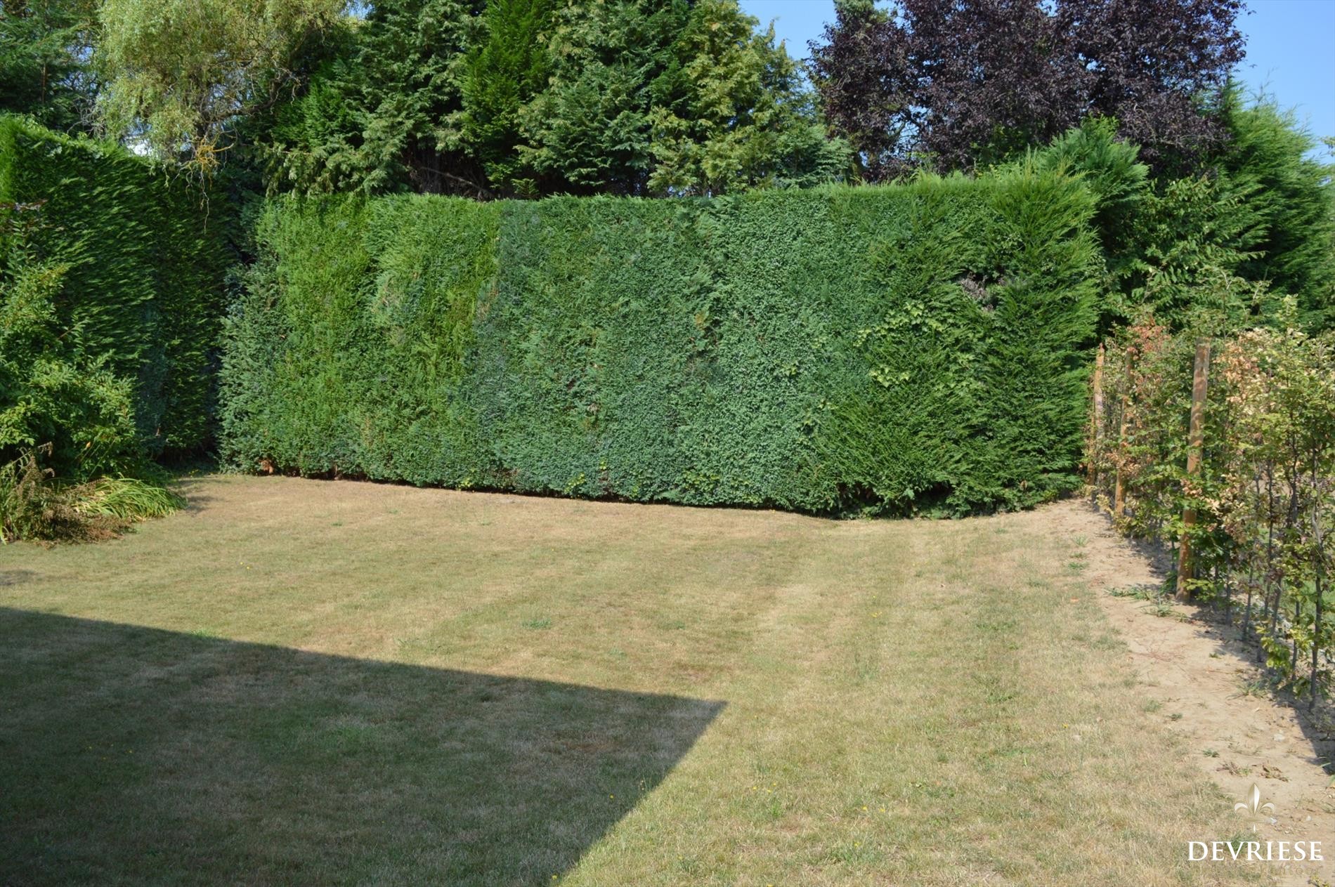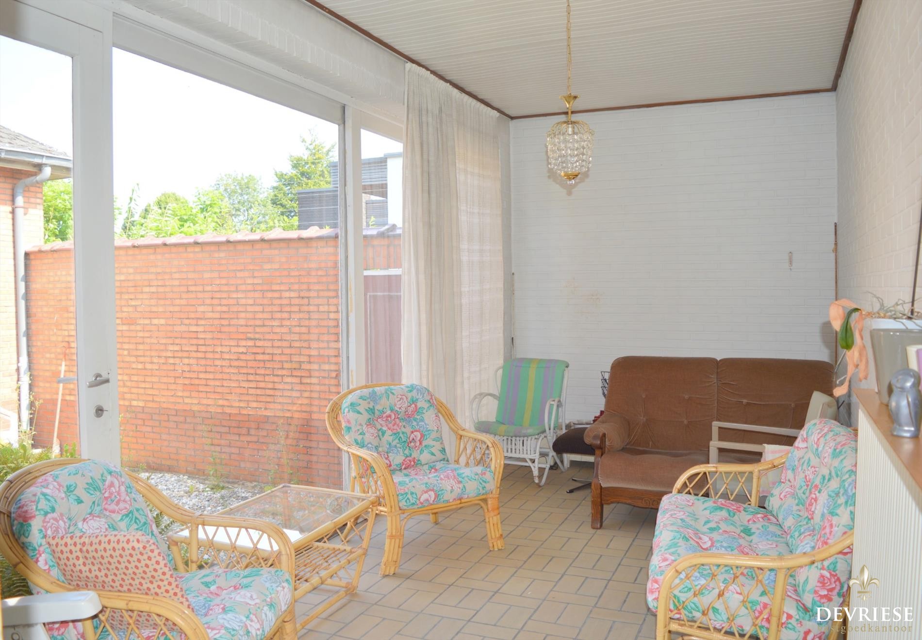 Aanpalende veranda met vol zicht op de patio en voorzien van vijver. Afzonderlijke leefkeuken met van hieruit toegang tot het terras, de tuin, alsook de garage met een aparte bergruimte.