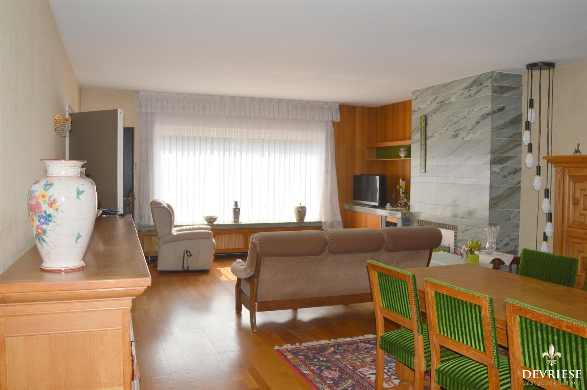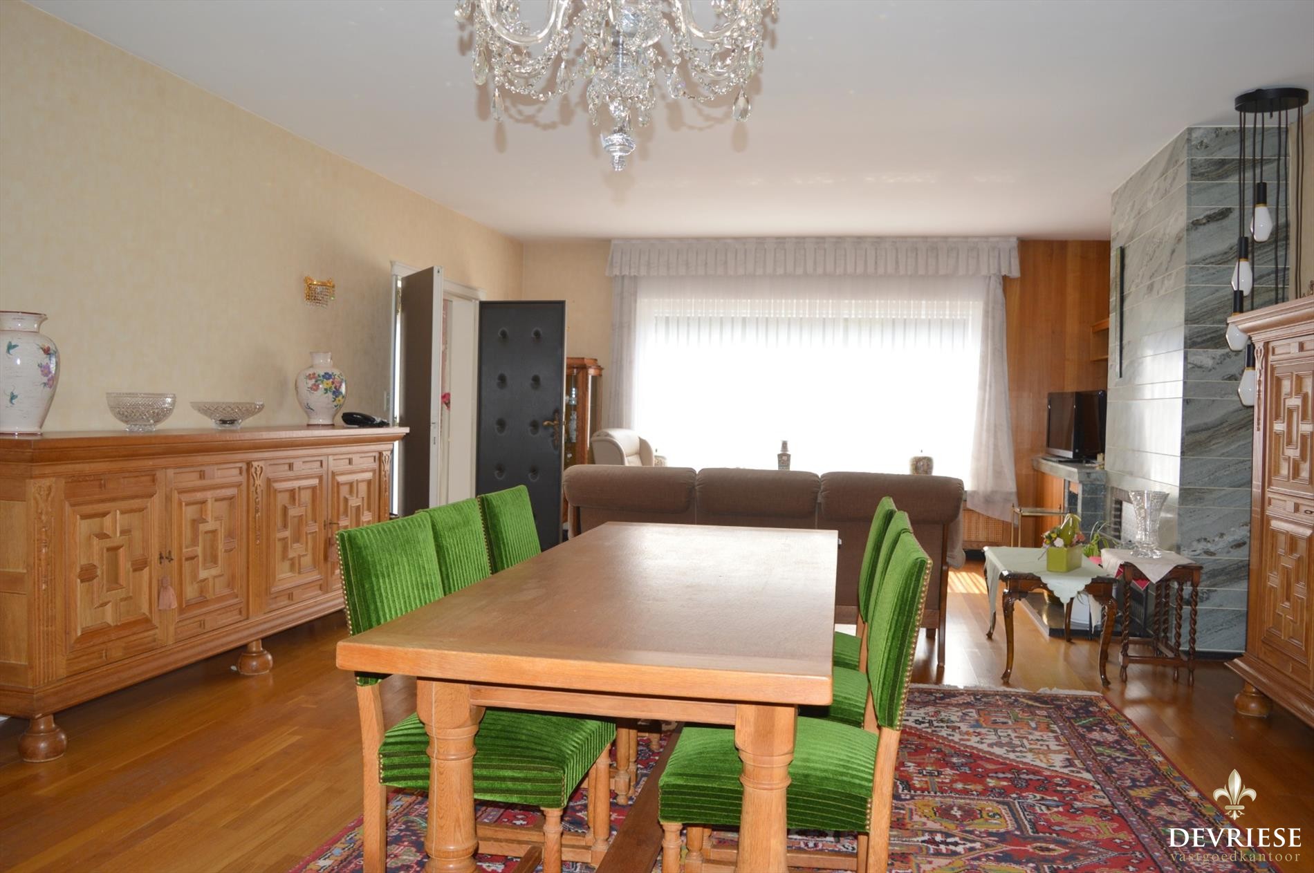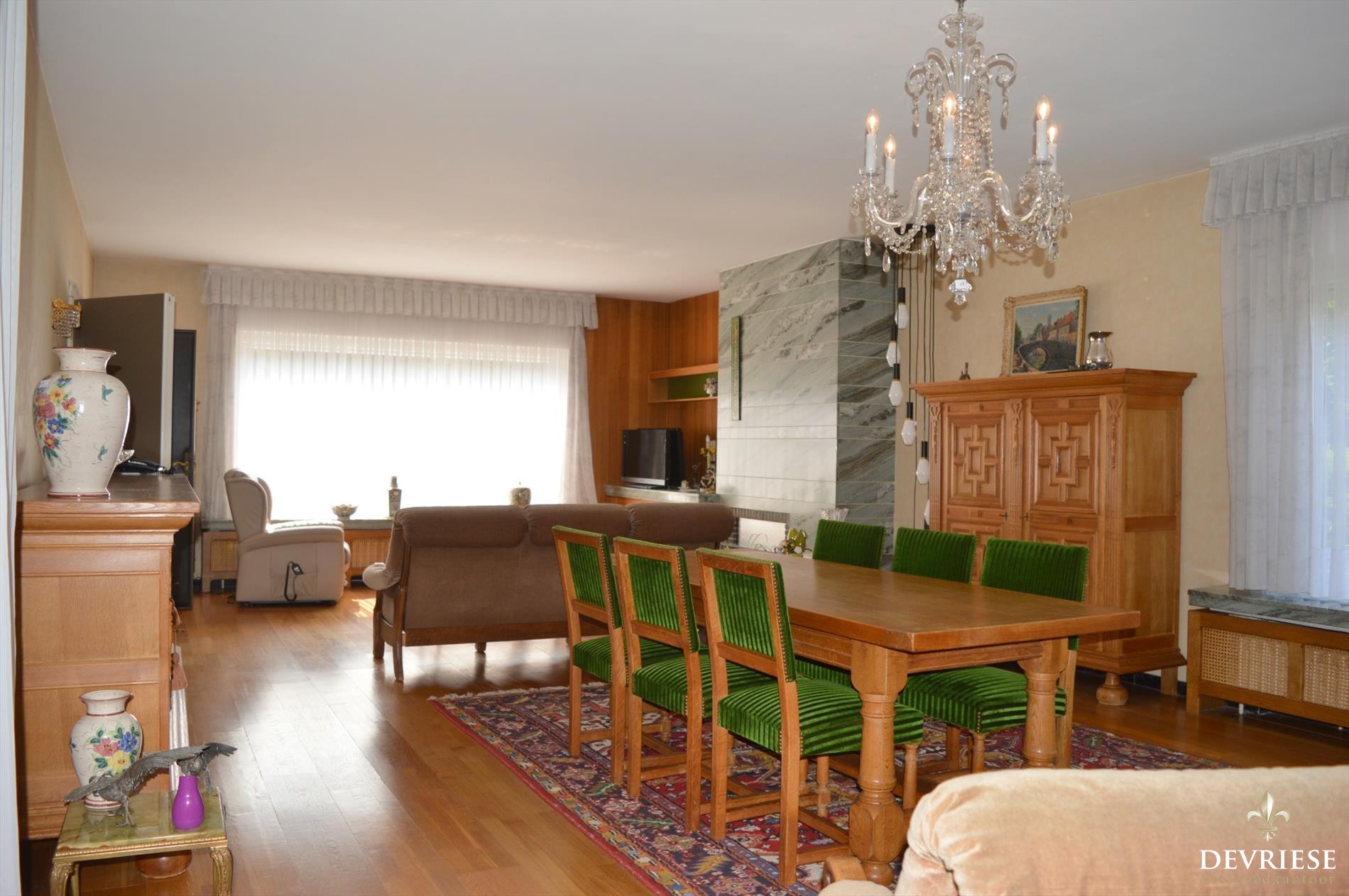Zeer ruime prachtige leefruimte met authentiek parket en open haard, genietend van heel wat lichtinval.