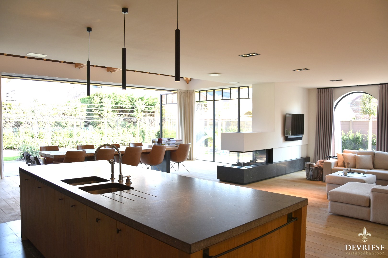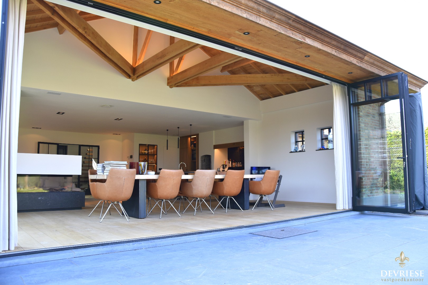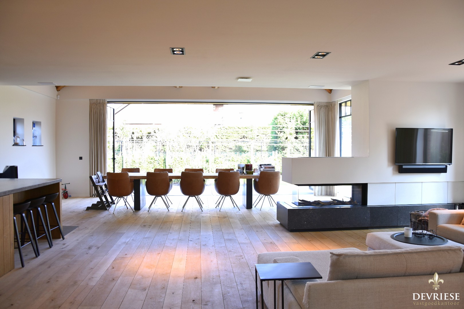 In de leefruimte werd er gewerkt met grote raampartijen waardoor u kan genieten van veel lichtinval en een mooi zicht op de tuin, wat zorgt voor een ultieme beleving! Het gelijkvloers is één grote belevingsruimte en gezien de volledig te openen achterwand (glazen harmonicadeuren) breng je buiten binnen.