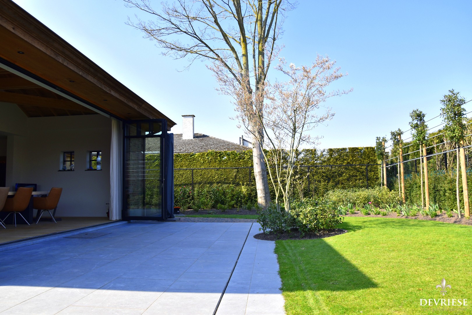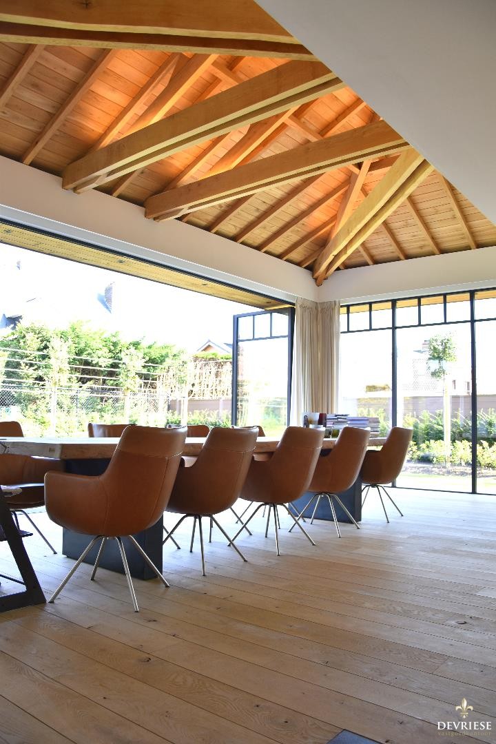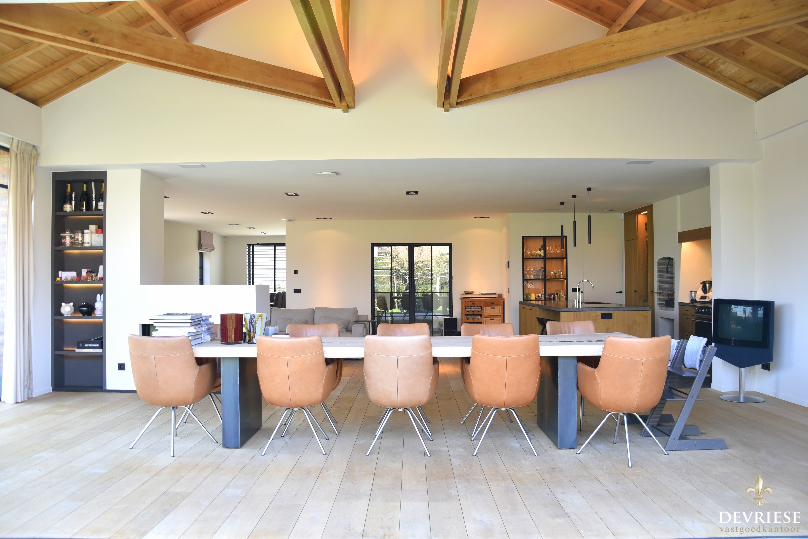 In de leefruimte werd er gewerkt met grote raampartijen waardoor u kan genieten van veel lichtinval en een mooi zicht op de tuin, wat zorgt voor een ultieme beleving! Het gelijkvloers is één grote belevingsruimte en gezien de volledig te openen achterwand (glazen harmonicadeuren) breng je buiten binnen.