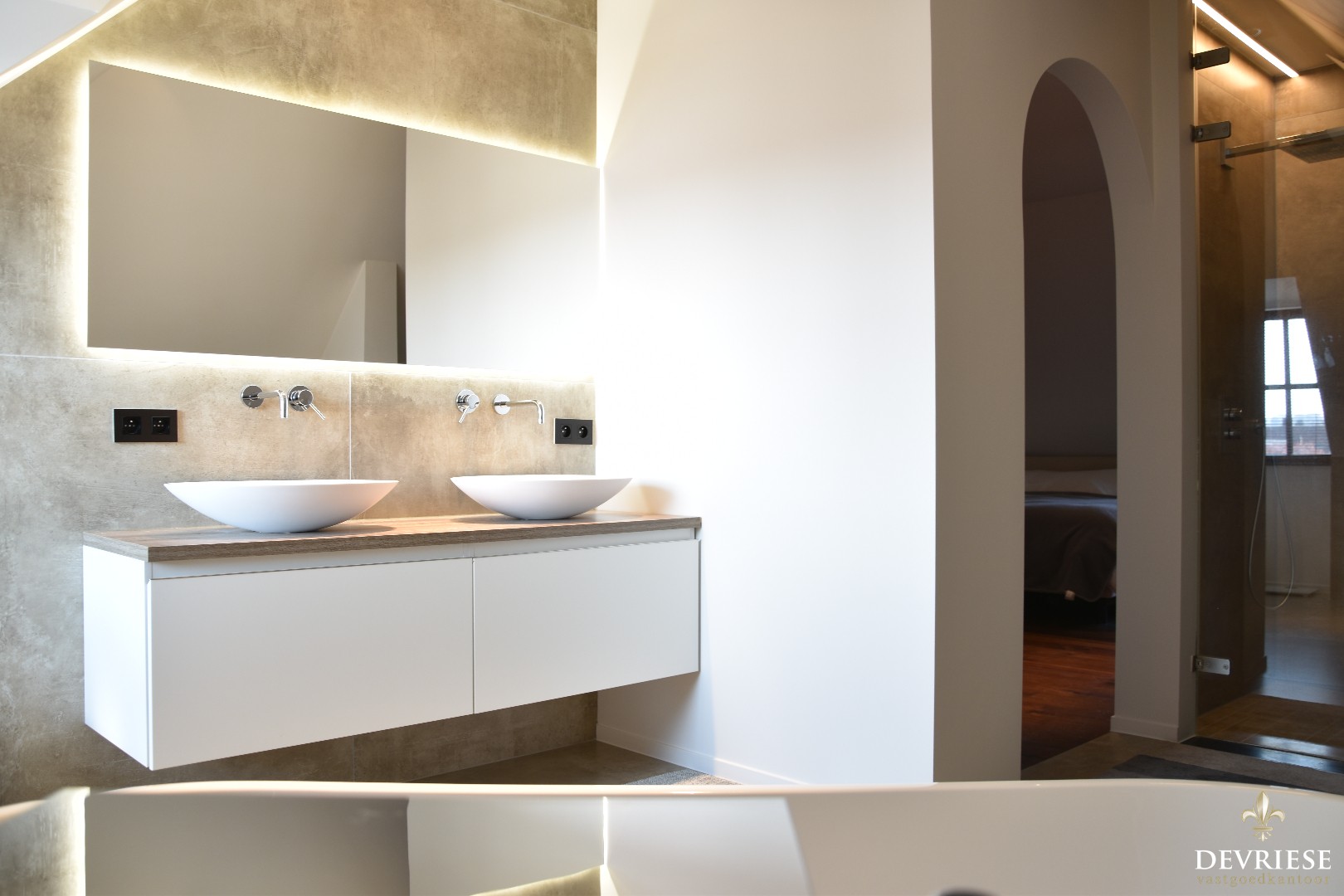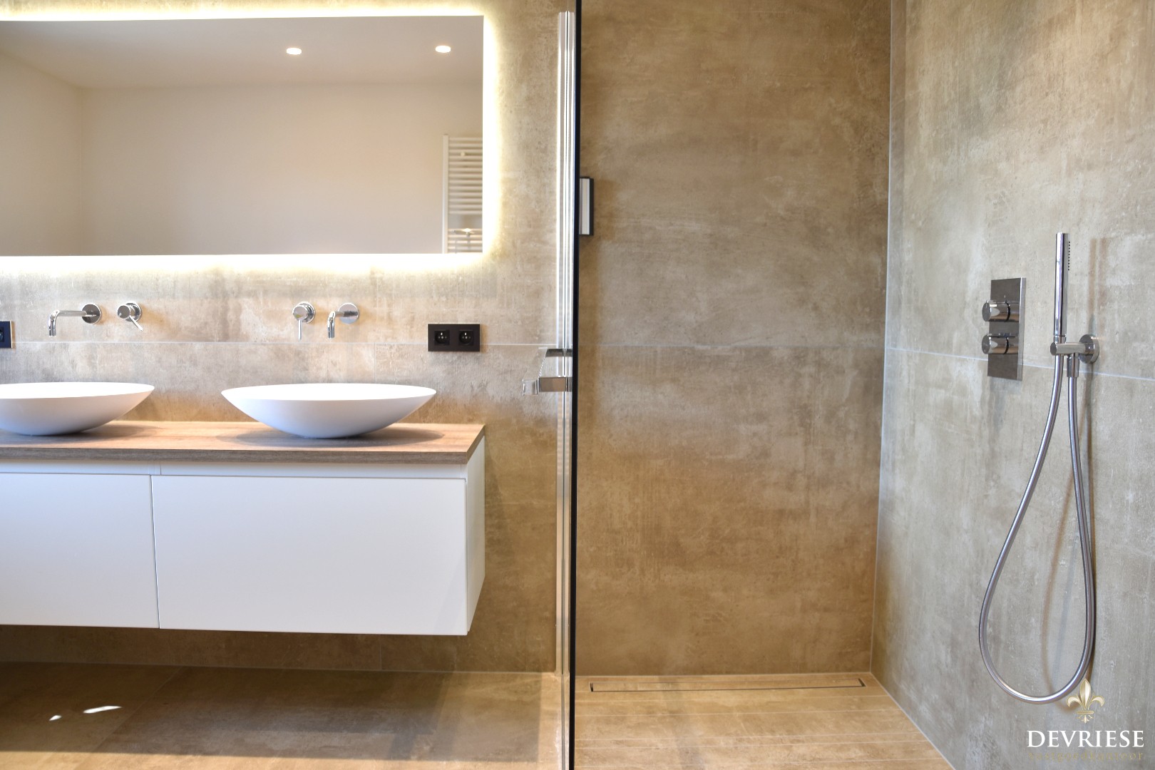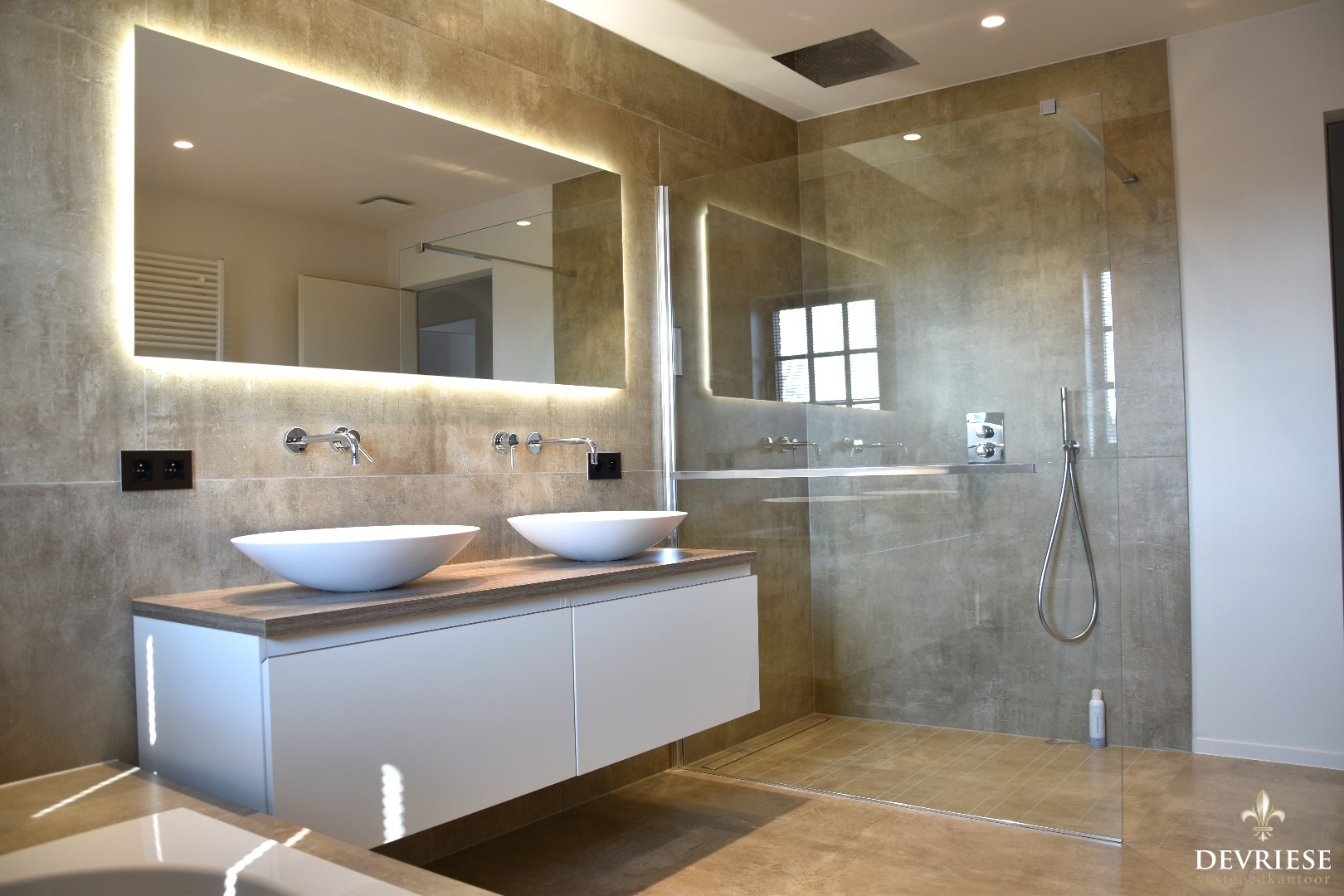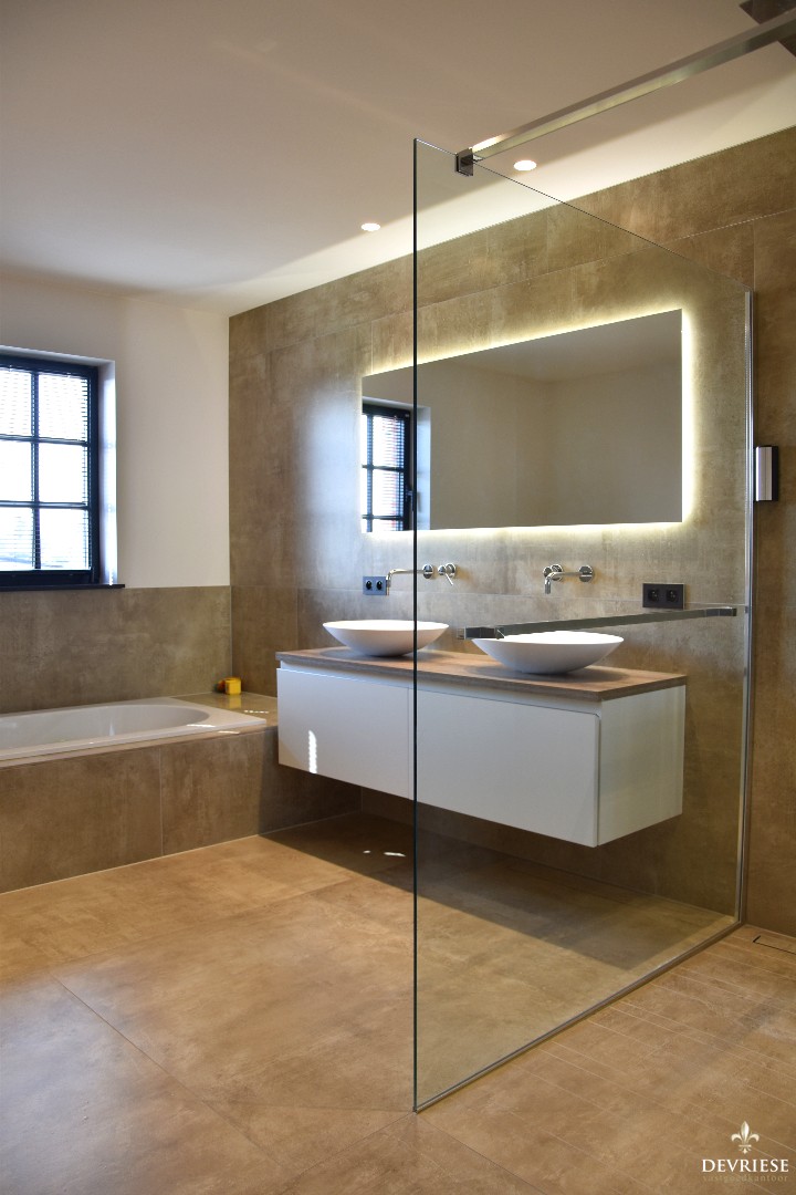 Verder treffen we 3 ruime slaapkamers (16,7 - 18,2 en 19,4 m²) op de eerste verdieping. De luxueuze badkamer ... op de eerste etage is voorzien van een dubbel lavabomeubel, ligbad en zalige inloopdouche.