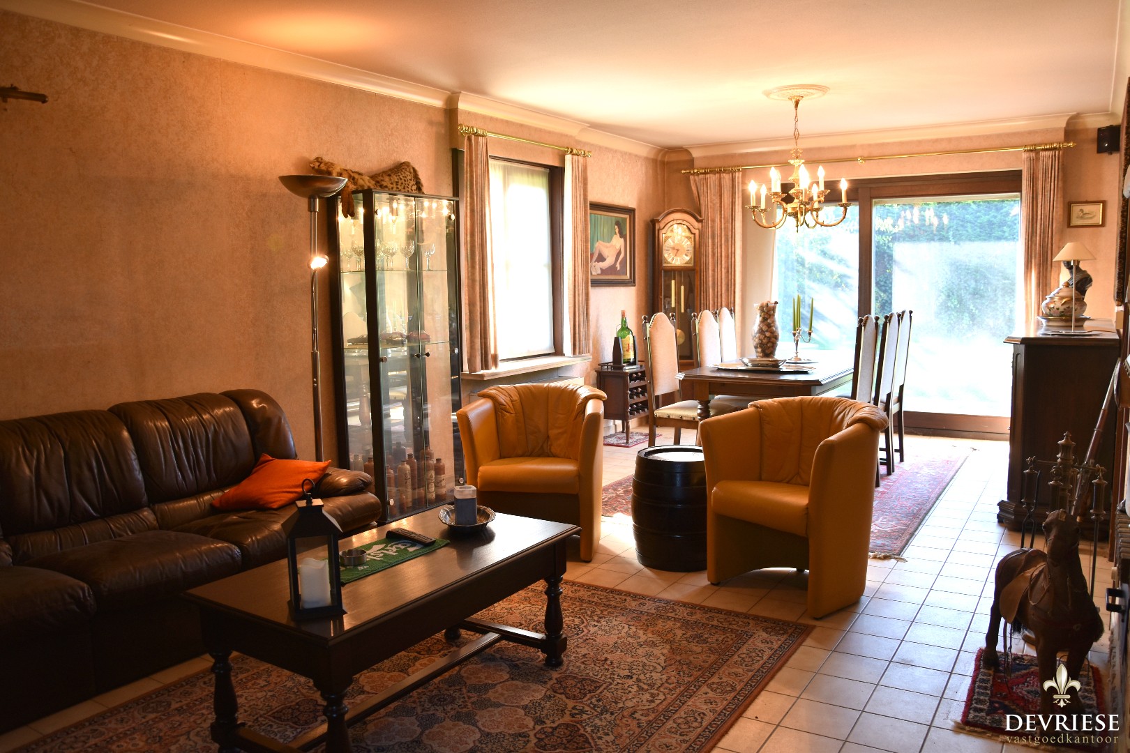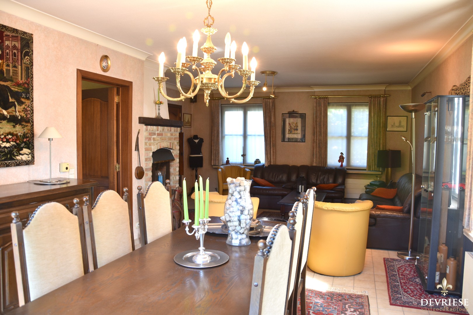 Een uitnodigende inkomhal met vestiaire en gastentoilet. De leefruimte omvat een gezellige zithoek met eetplaats. Tijdens de winterdagen zult u kunnen genieten van een knetterend vuurtje dankzij de houthaard.