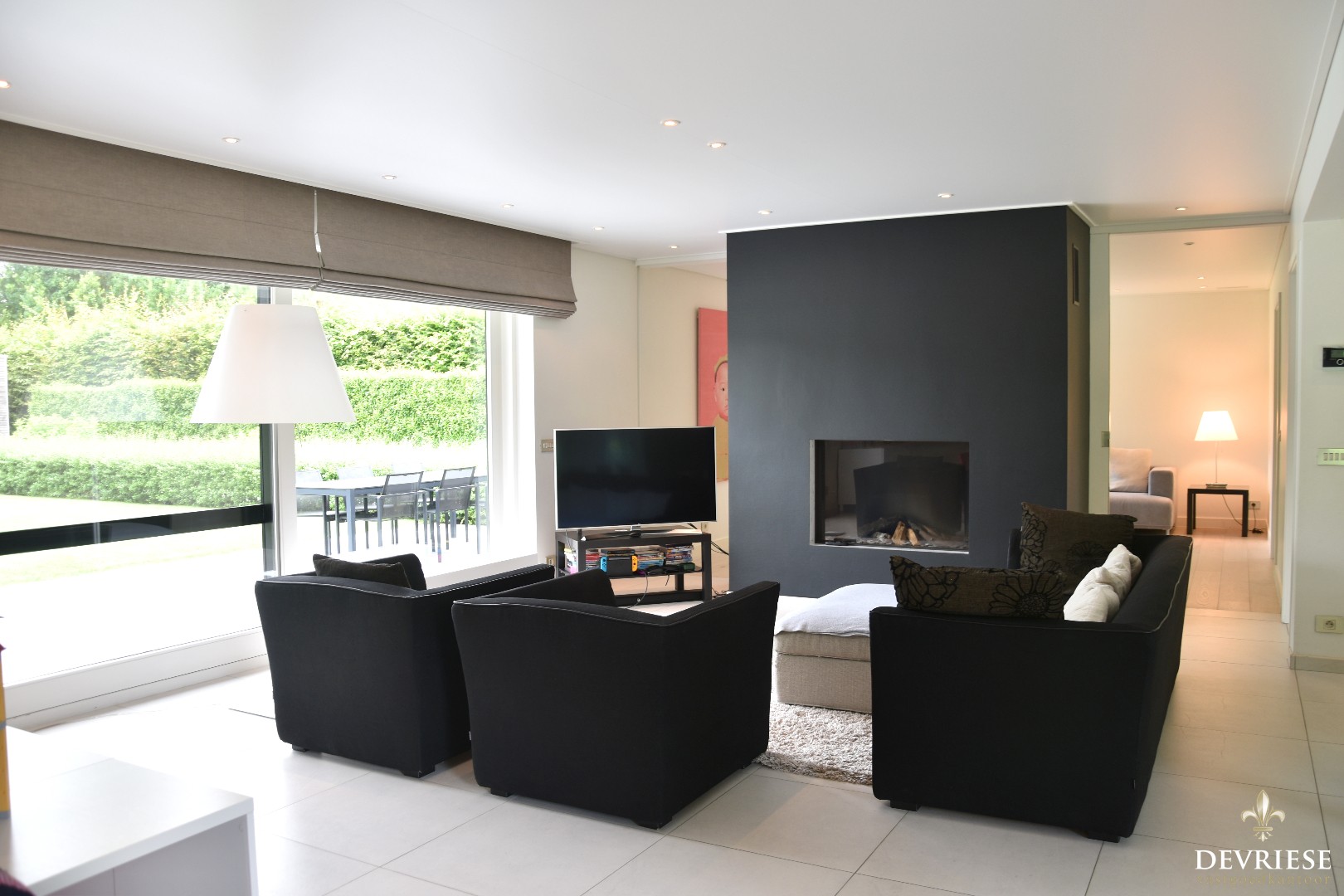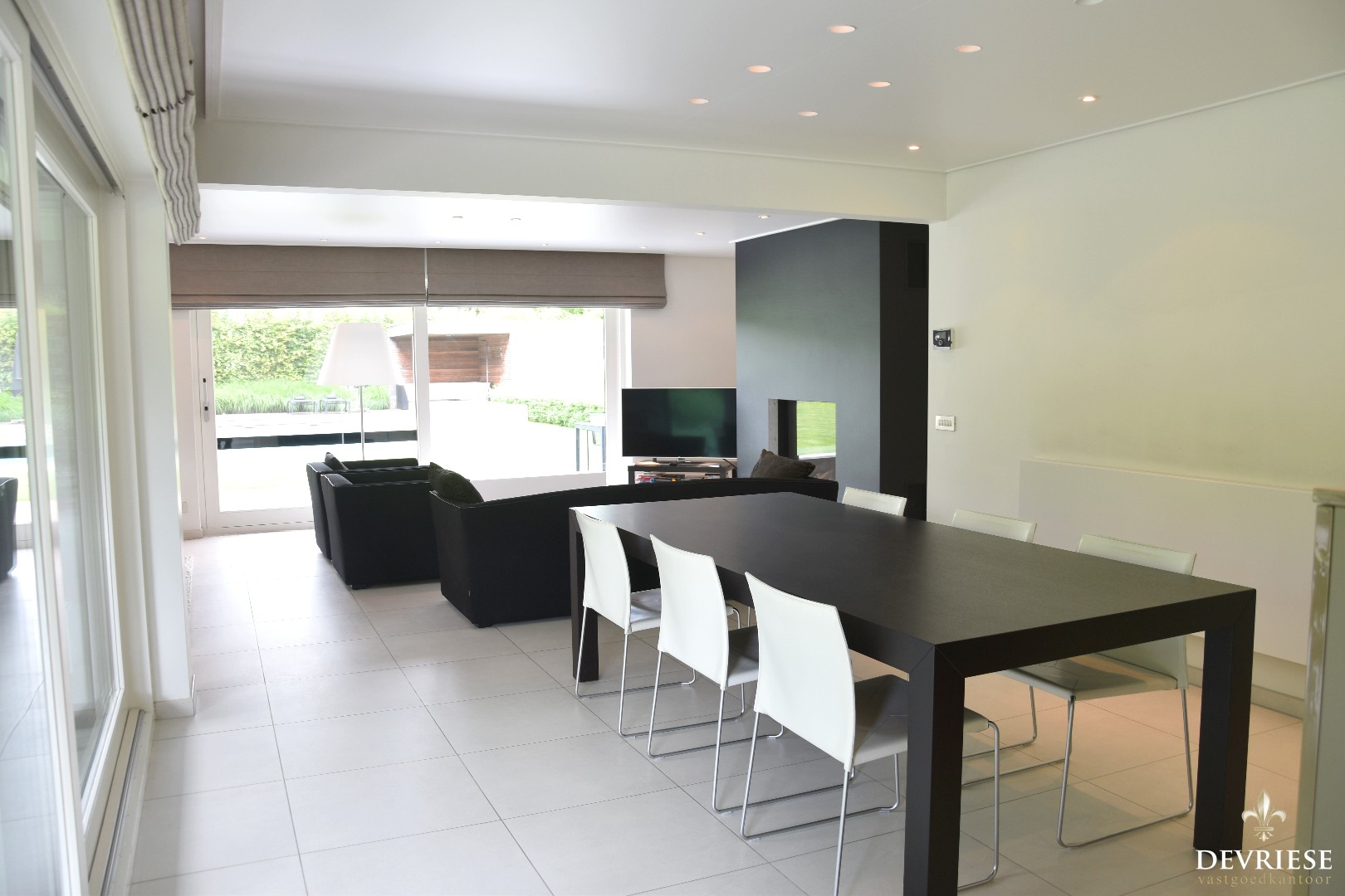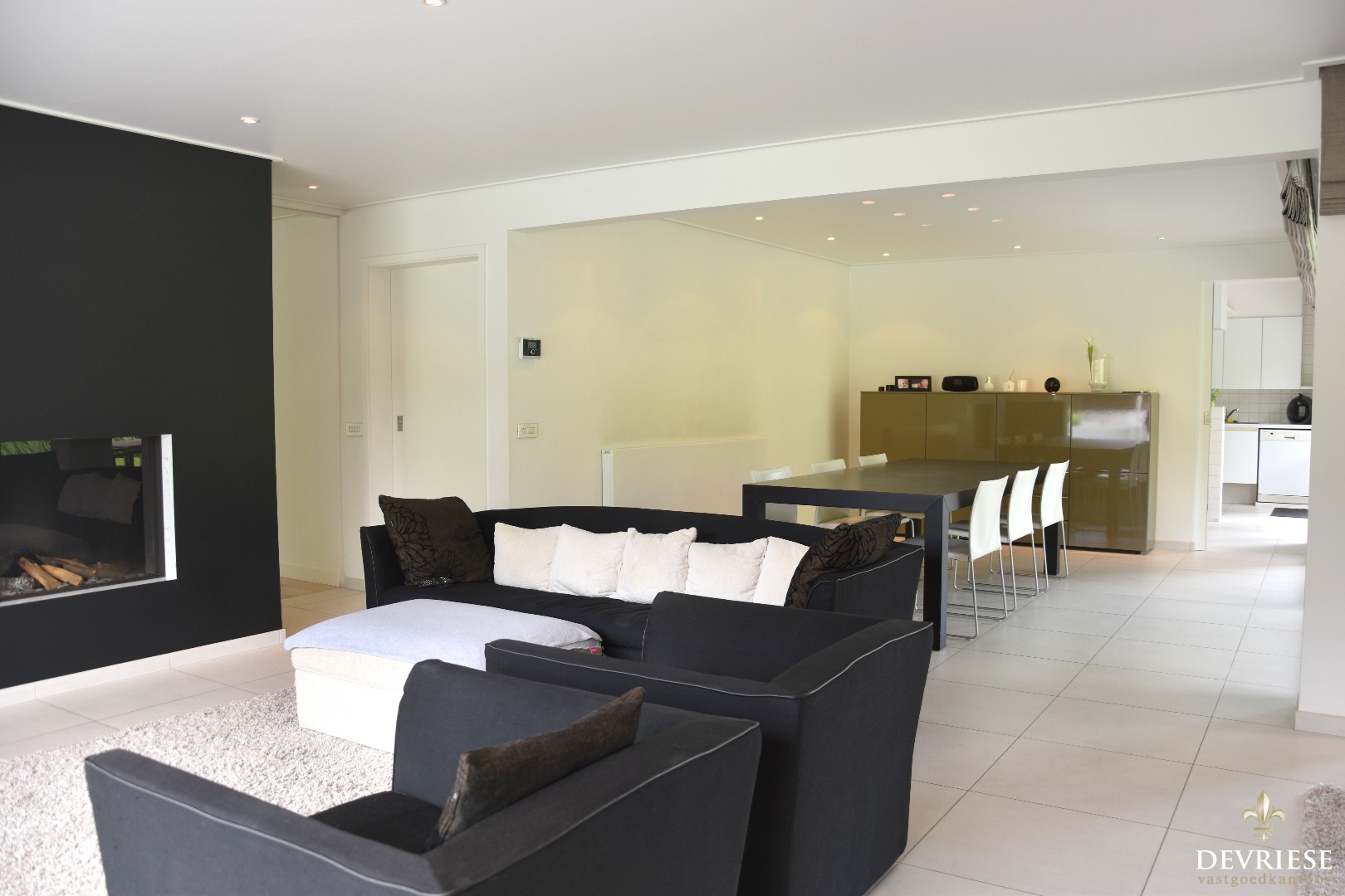 Al bij het binnenkomen in de hal wordt de toon gezet. Van hieruit is er toegang tot de stijlvol ingerichte leefruimte, opgedeeld in een aparte zitruimte met hiernaast nog een tweede leefruimte met aanliggend de eetkamer. Een recente gashaard is aanwezig. Geniet er volop van het groene zicht op de tuin rondom.