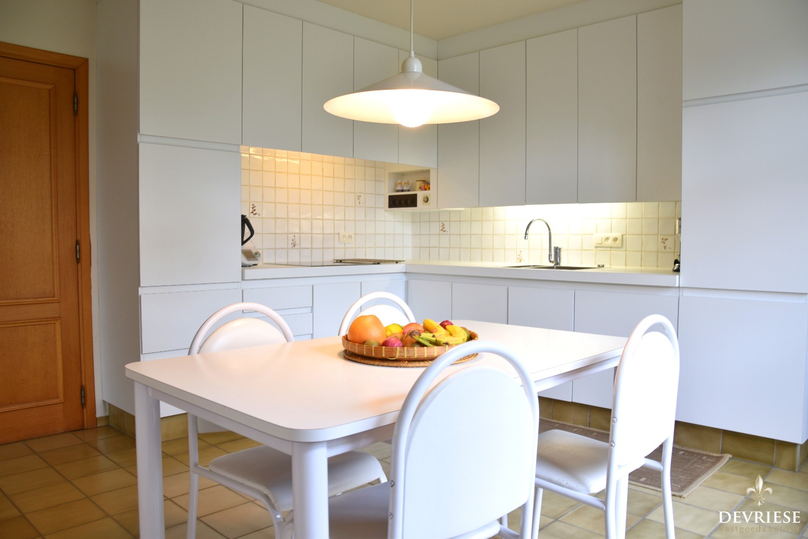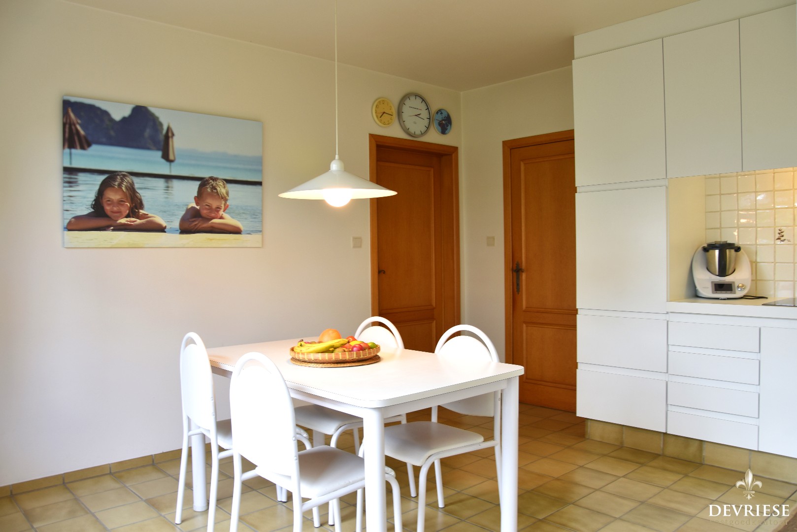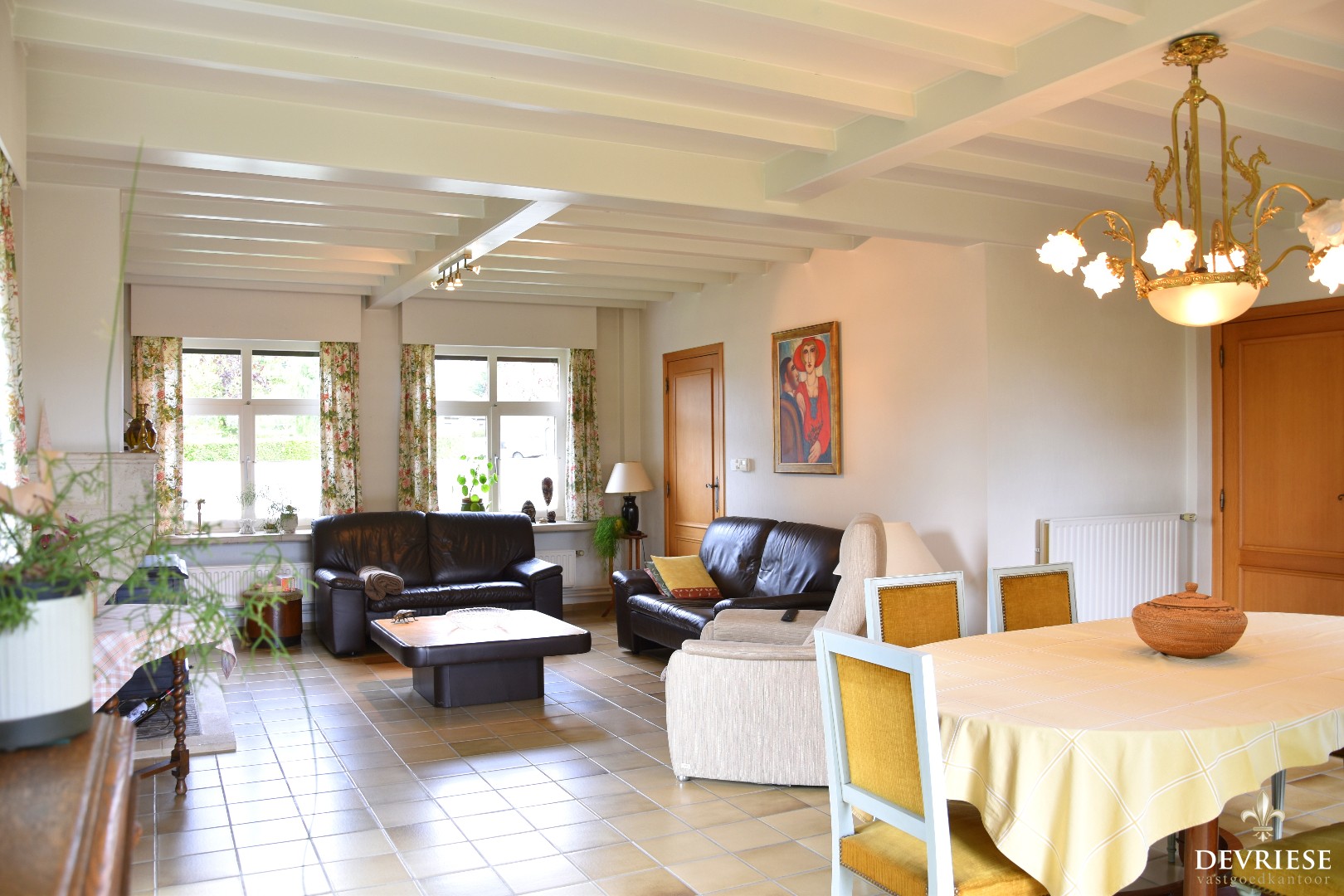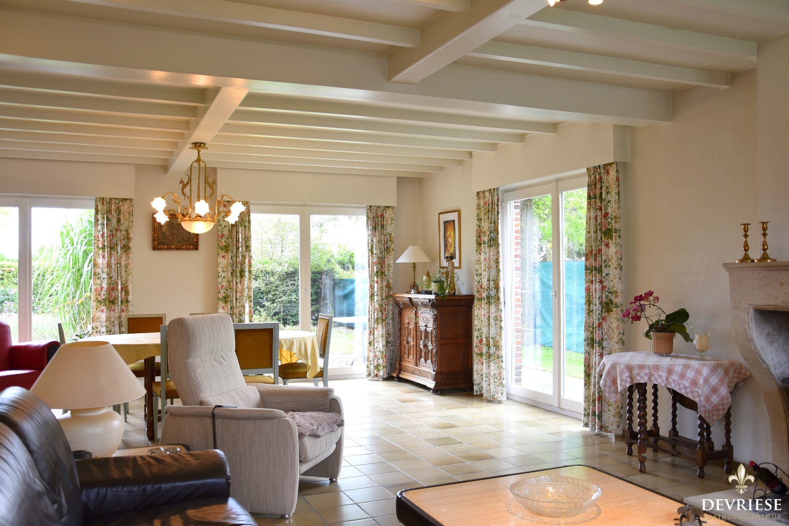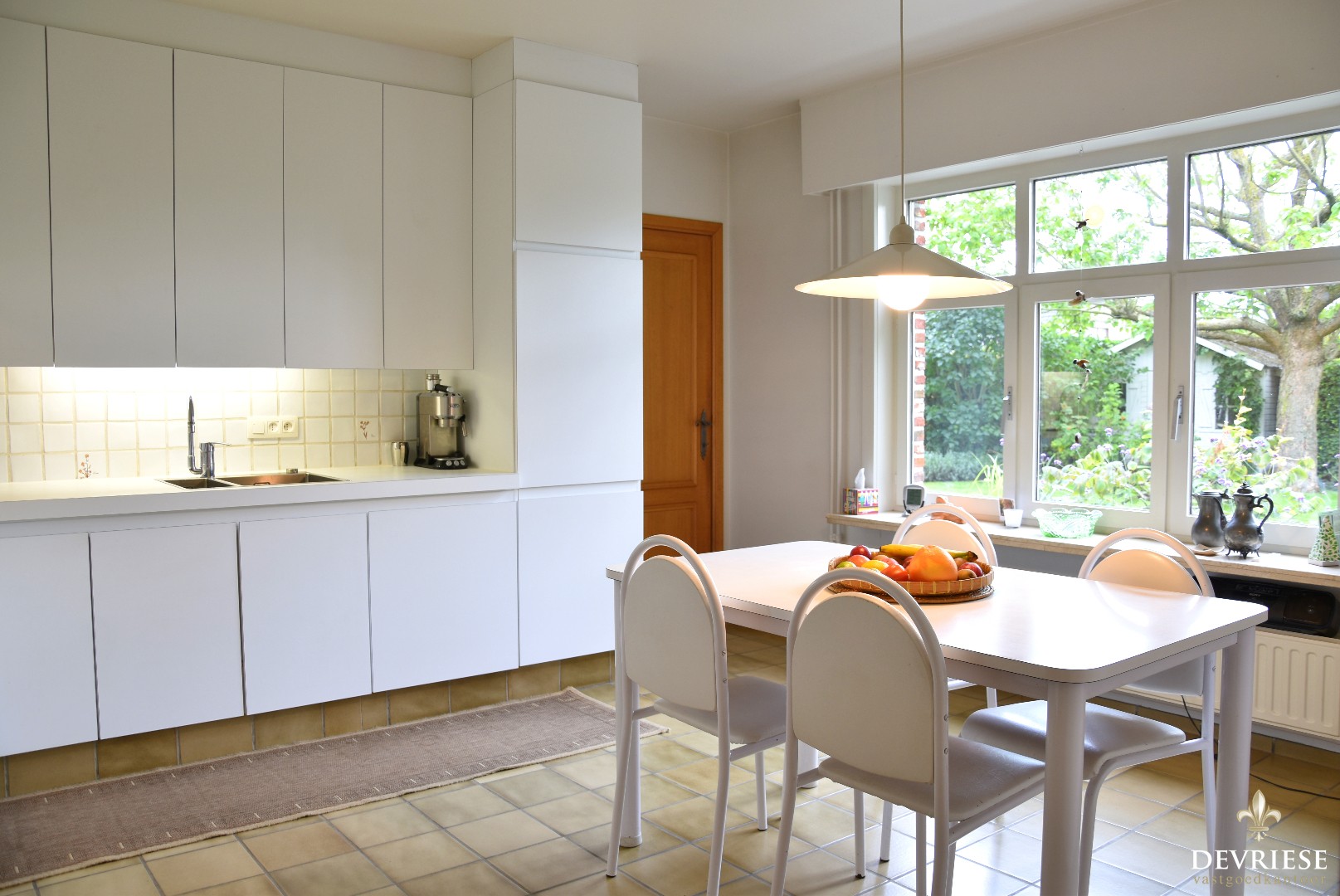 Inkomruimte met gastentoilet en toegang tot de aparte bureauruimte en tevens toegang tot de gezellige leefruimte met houtkachel. Heel wat lichtinval door de zuidoost-oriëntatie en vol zicht op de tuin. Aangrenzend de ruime praktische leefkeuken. Via de keuken is er toegang tot de berging, de handige wasplaats met daarachter de ruime garage die tevens een extra bergruimte voorziet.