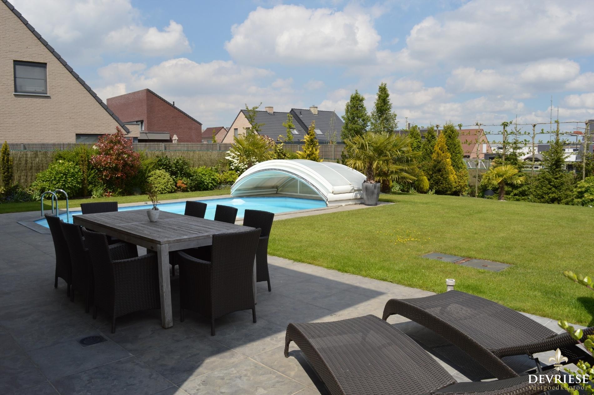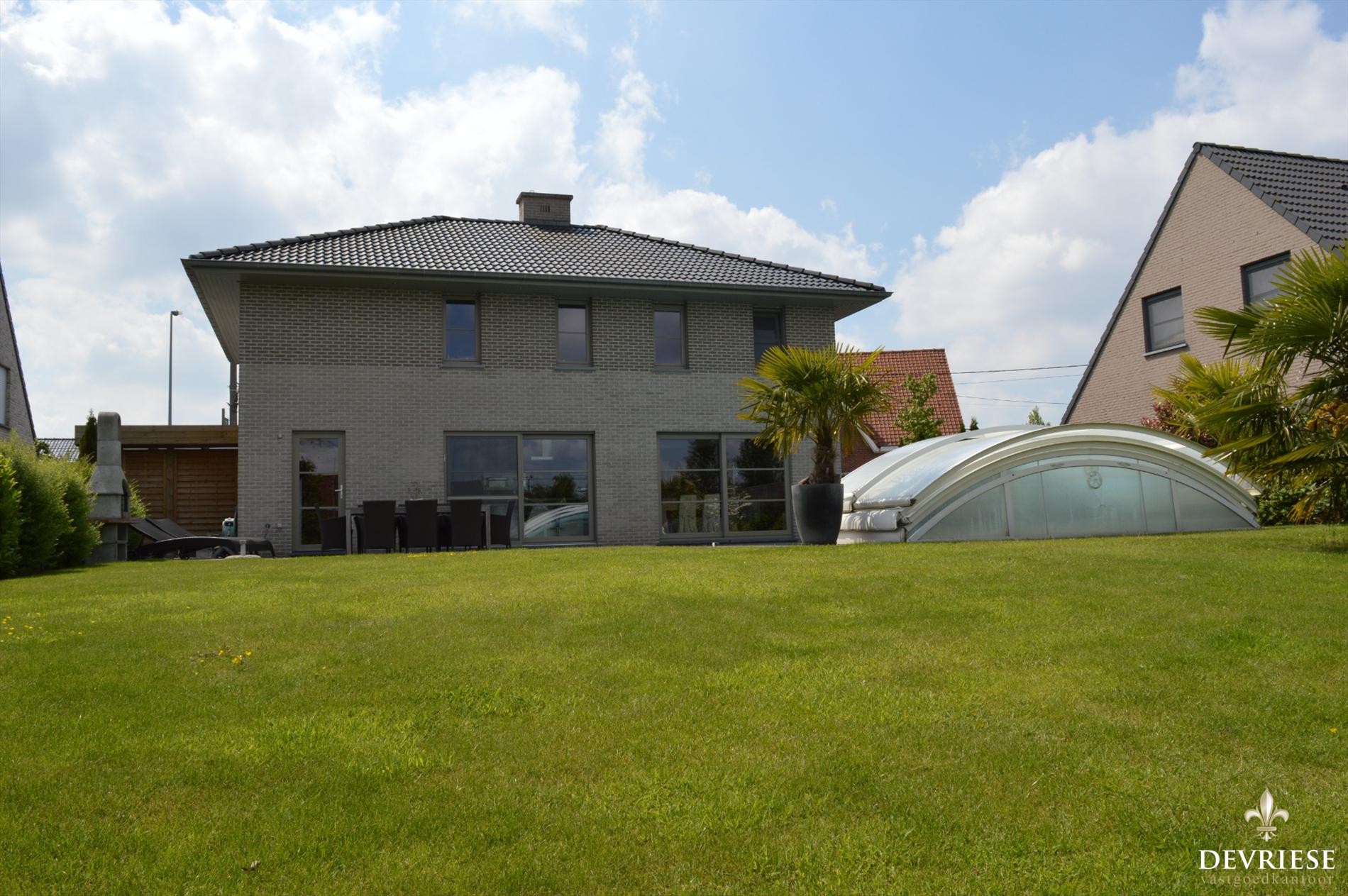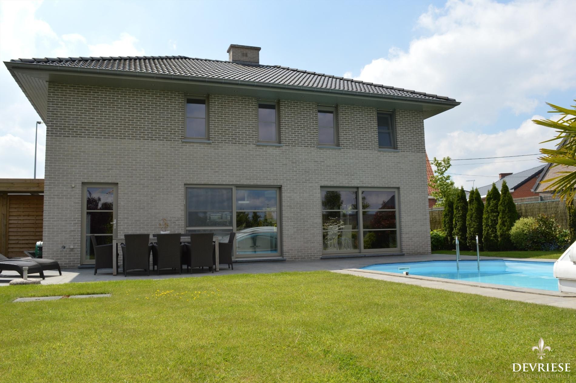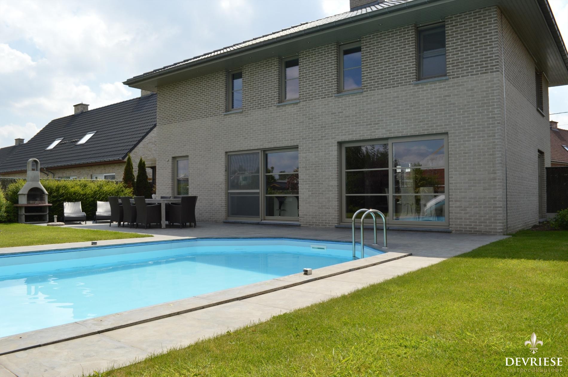 Magnifieke moderne villa met verfijnde afwerking en gebruik makende van top materialen. Al van bij het openen van de poorten doet deze woning tot de verbeelding spreken. Via de open inkomhal kom je in de ruime leefruimte die geniet van enorm veel lichtinval en aansluitend is er de kwalitatieve open keuken van waaruit je volop zicht hebt op de tuin en zwembad.