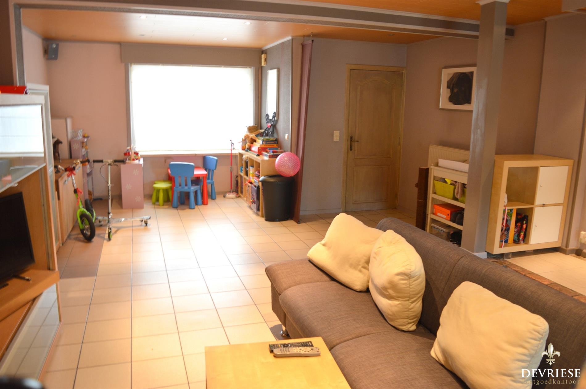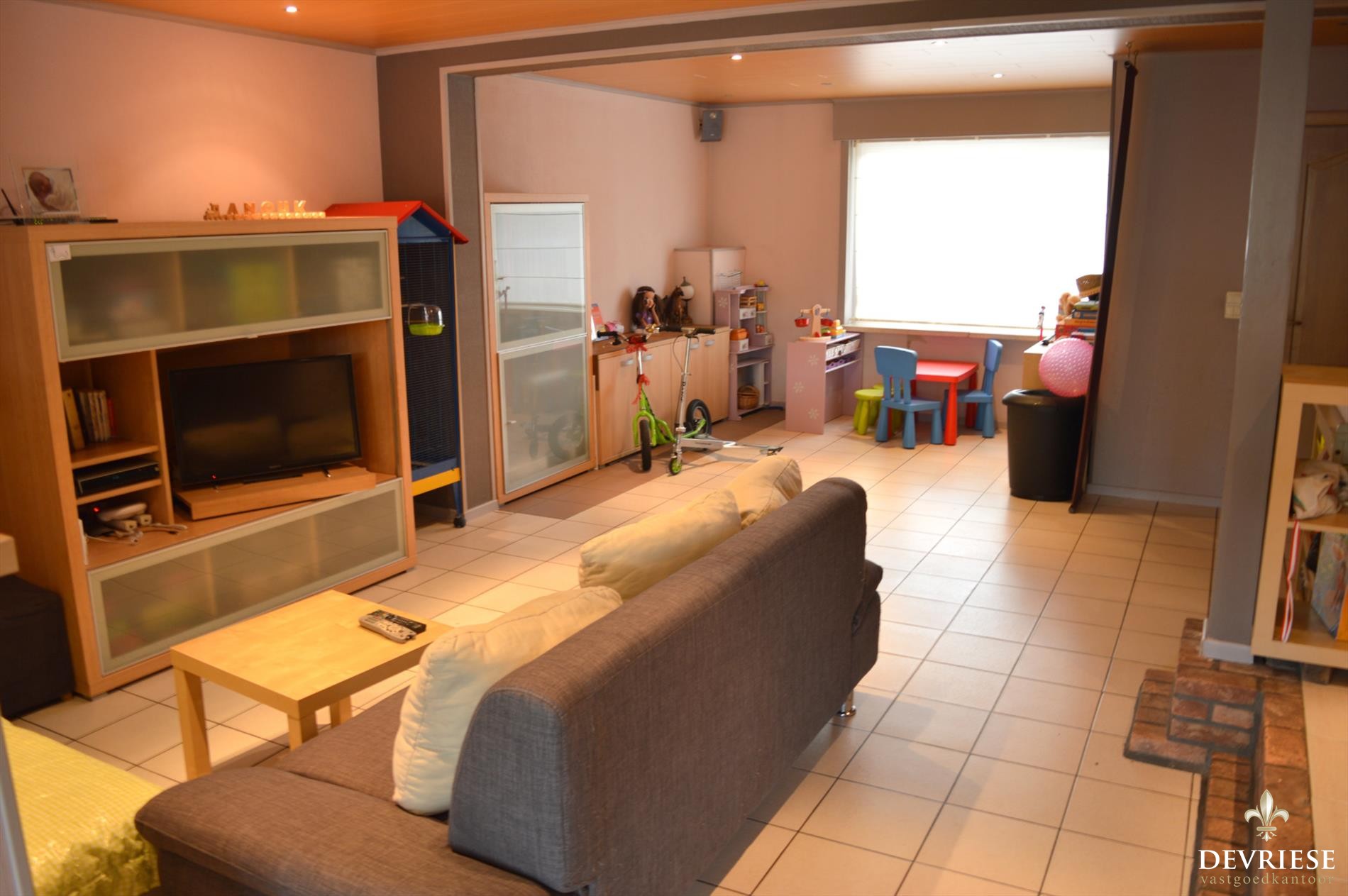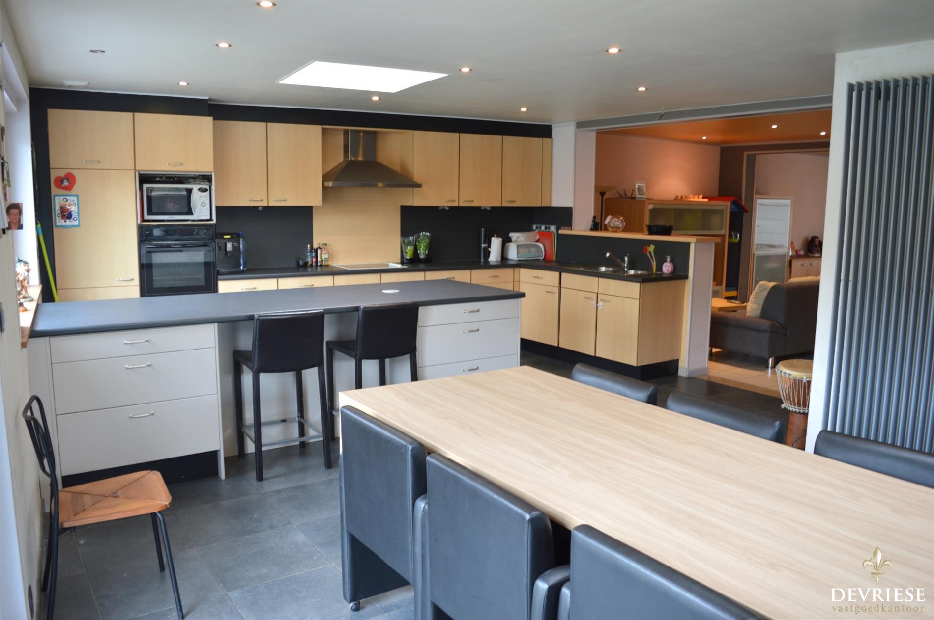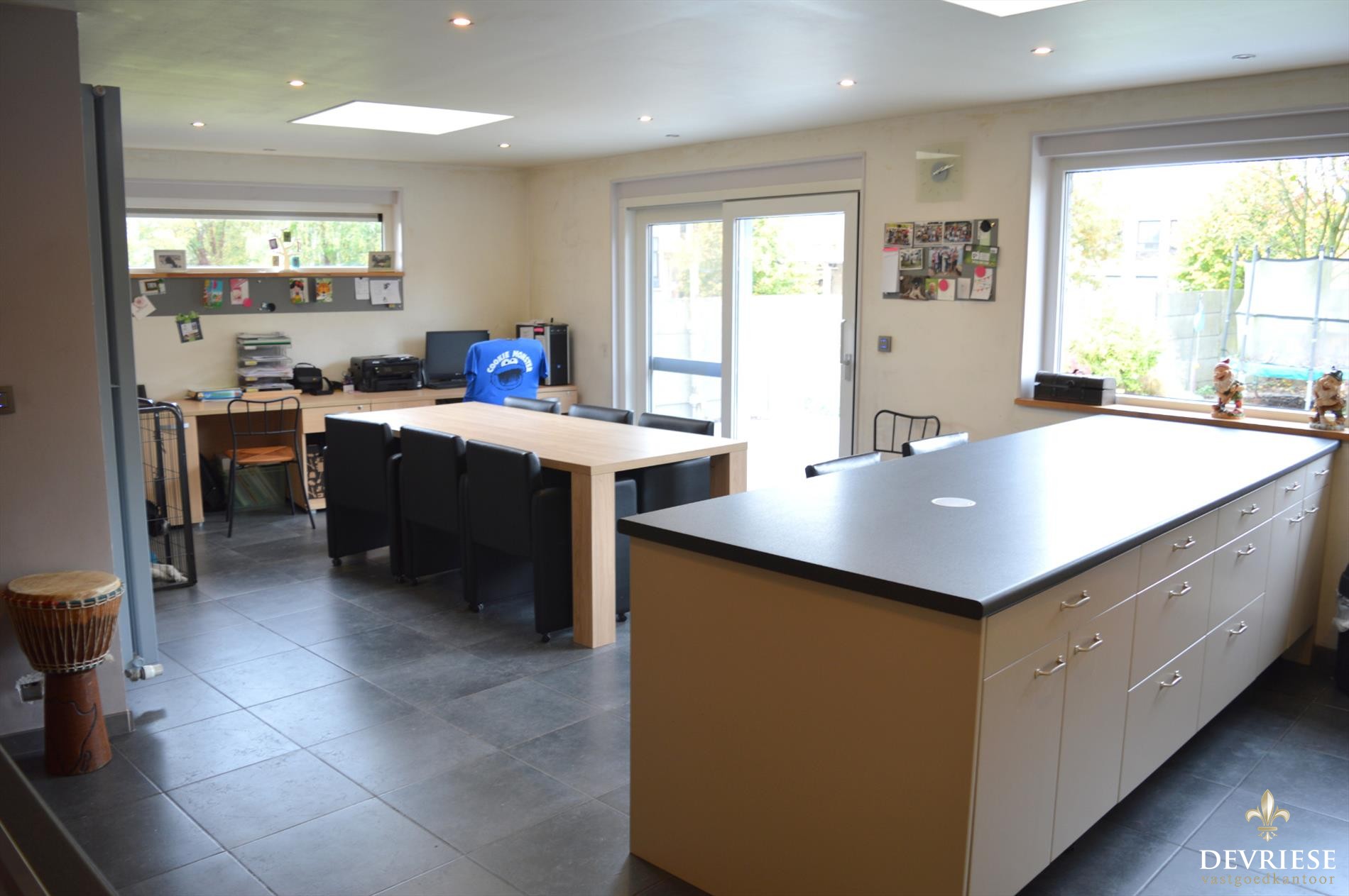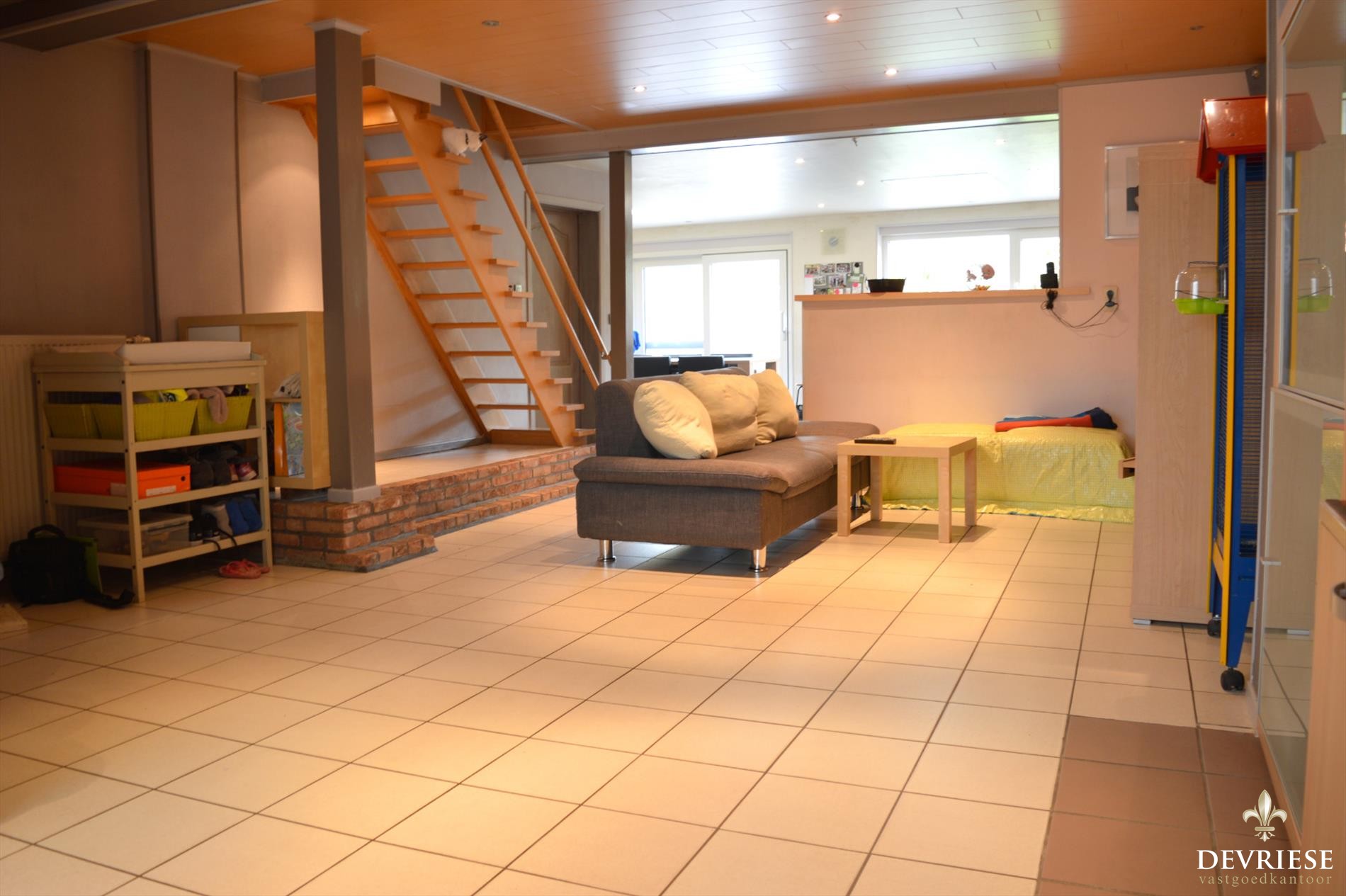In de ruime leefruimte is het aangenaam binnenkomen en deze gaat over in de recente open keuken. Deze eigentijdse keuken bevindt zich in een recentelijk geplaatste achterbouw en kan echt als een 'leefkeuken' gezien worden. Het is er fijn vertoeven door de lichtinval alsook het zicht op de tuin. Daarnaast beschik je over een ruime garage met aparte bergplaats en zeker handig is ook de uitweg naast de woning.
