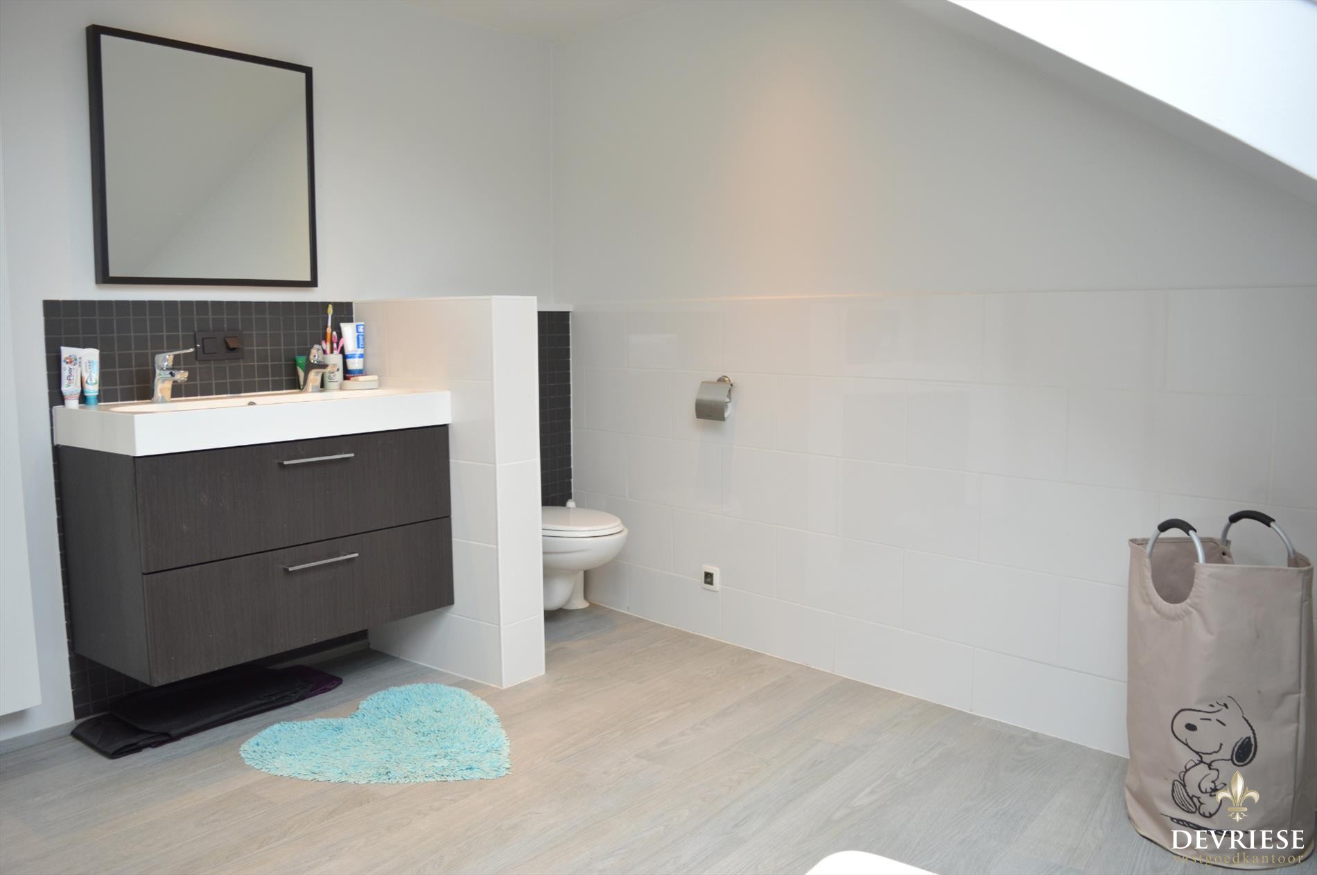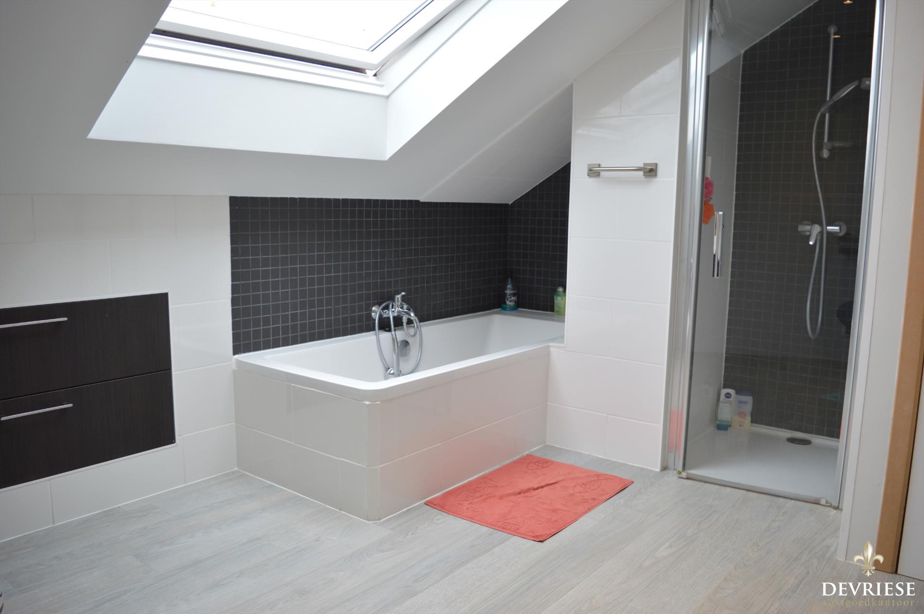 Op de eerste verdieping zijn er 3 slaapkamers en de pas vernieuwde badkamer met bad en douche. De vaste trap geeft toegang tot de geïsoleerde zolder die ofwel kan dienst doen als extra bergruimte maar die ook wel om te vormen is tot fijne extra slaapkamer of hobbyruimte.