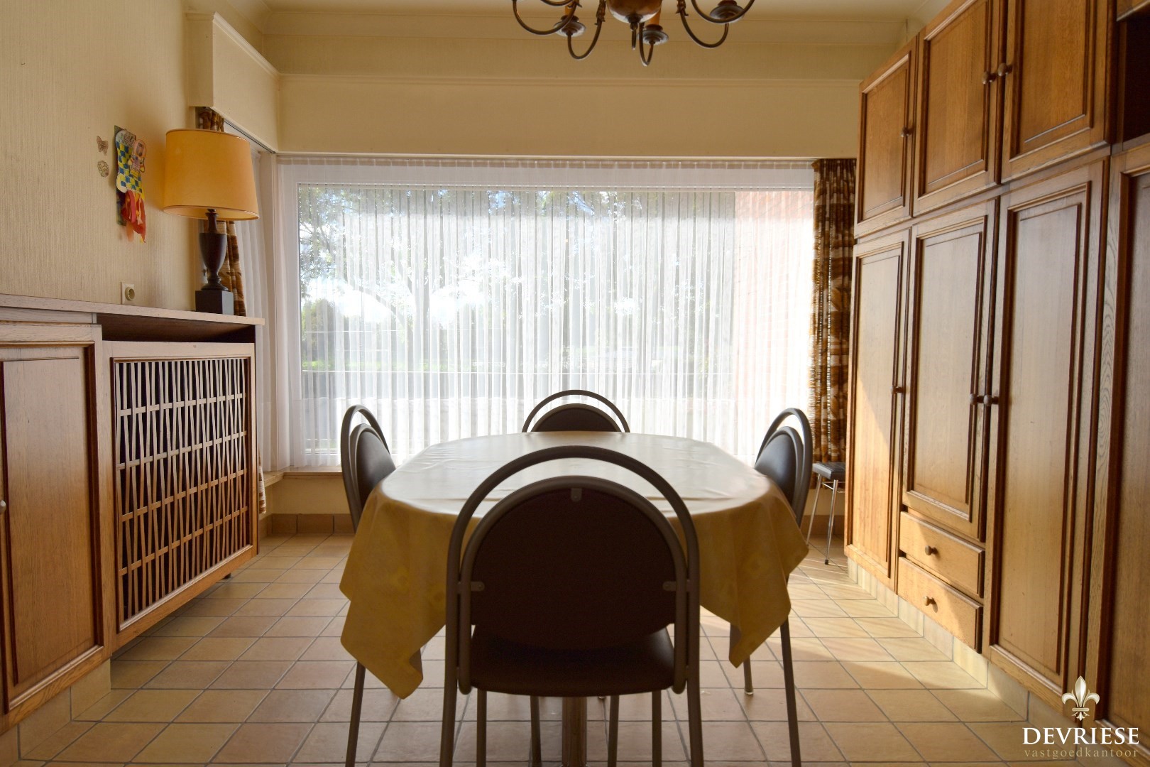 De leefruimte ademt sfeer en gezelligheid uit met heel wat natuurlijk lichtinval door de vele raampartijen en de open haard. Aanpalend de keuken met naastliggend een gezellige eetplaats met ingemaakte kastenwand.