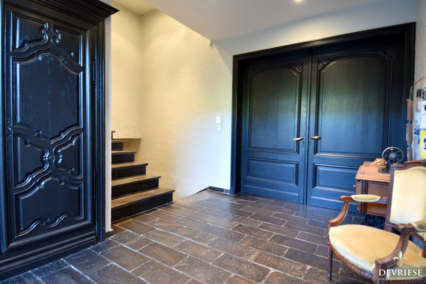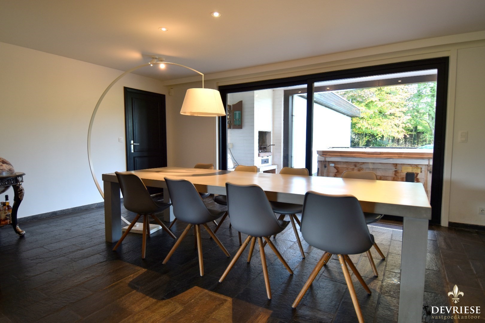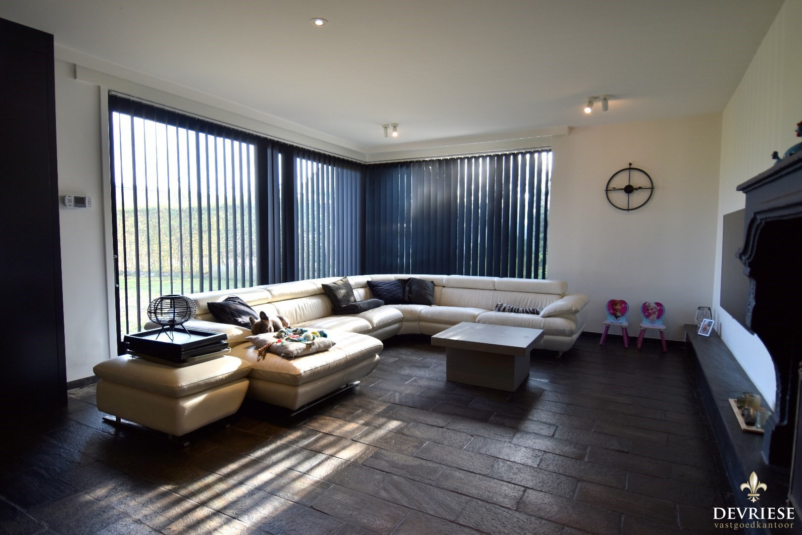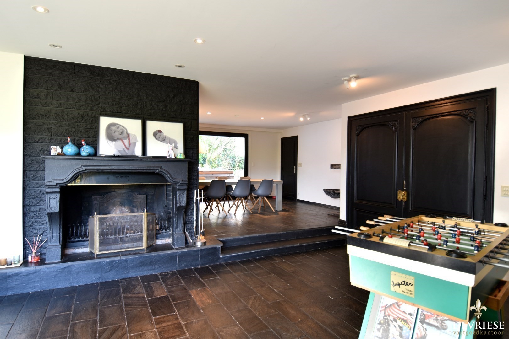 Bij binnenkomst word je verwelkomd in een ruime inkomhal met een elegante dubbele deur die toegang geeft tot de lichte en ruime leefruimte. Deze gezellige ruimte is perfect ingedeeld met een zithoek, waar je kan ontspannen bij de knusse open haard, en een royale eetplaats voor onvergetelijke diners met vrienden en familie. Ingemaakte kasten voorzien.