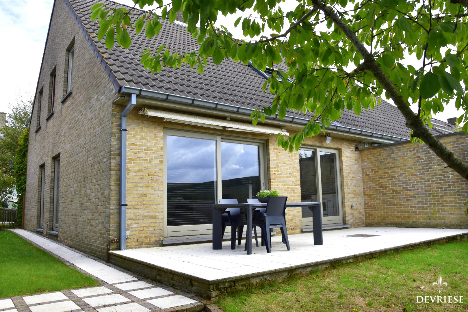 Groene tuin en een aangelegd terras met zonneluifel. Uren buitenplezier verzekerd!