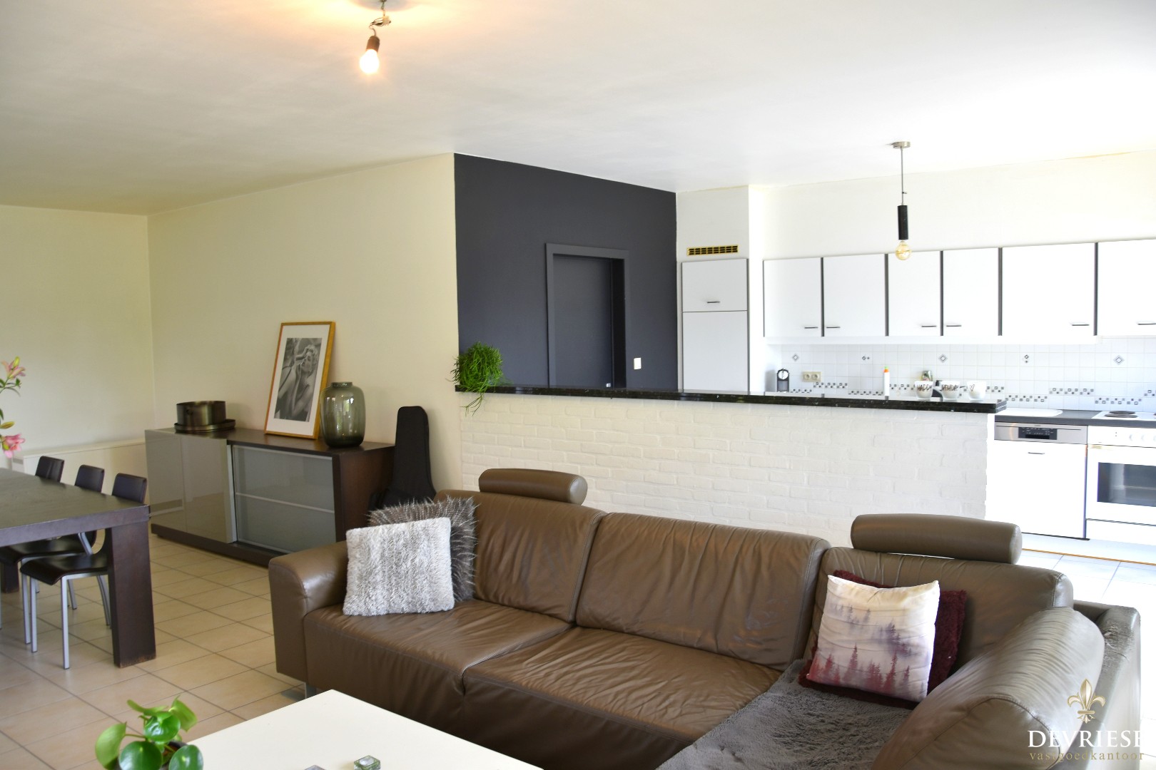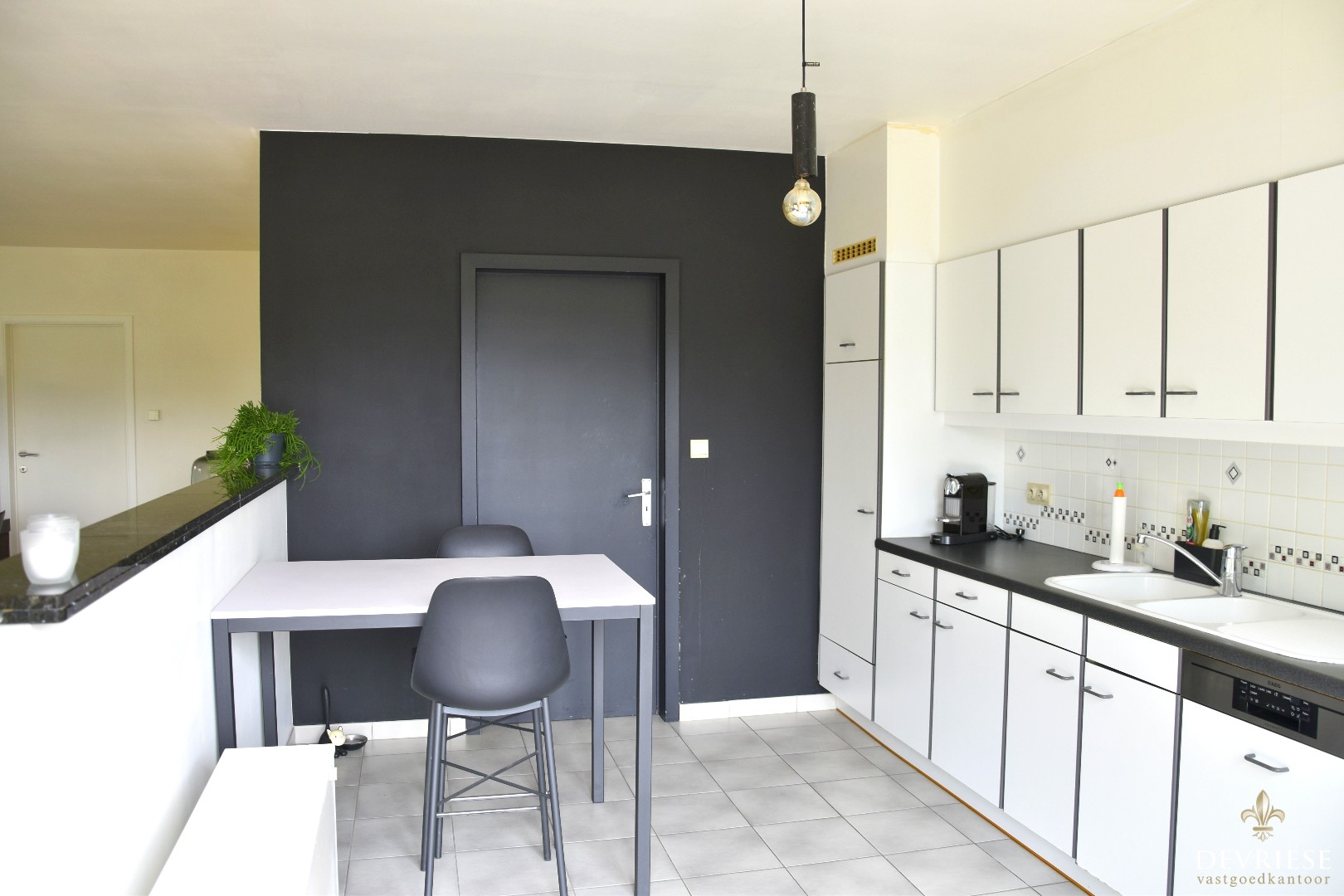 Ruime inkomhal met ingemaakte vestiaire en gastentoilet, een lichtrijke leefruimte (salon -en eetplaats) met aanpalend een open keuken. Deze is volledig uitgerust (toestellen AEG en Bosch) en biedt plaats voor een gezellige ontbijthoek. Het groenzicht is natuurlijk mooi meegenomen.