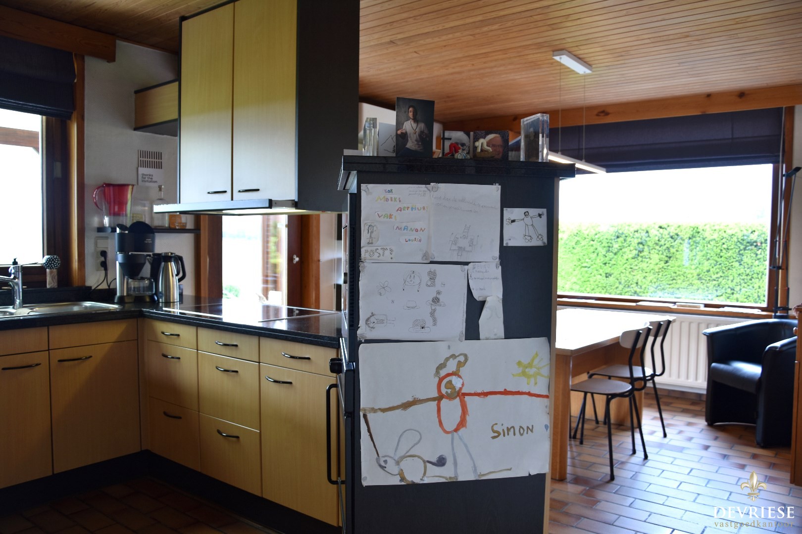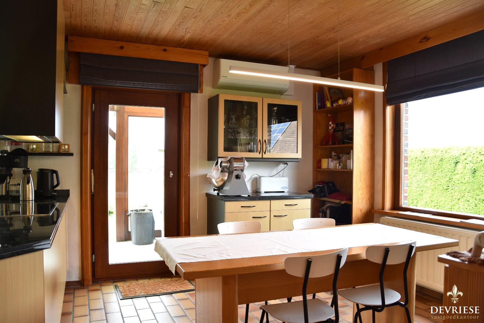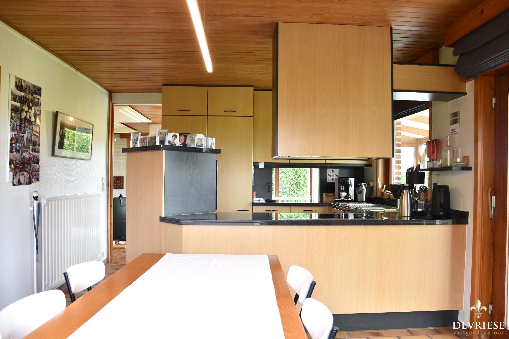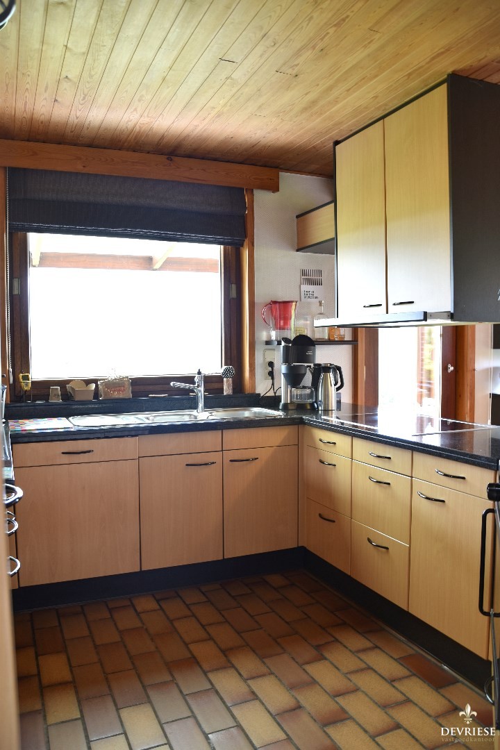 Mooie leefkeuken, volledig uitgerust en geaccentueerd door een gezellige ontbijthoek.