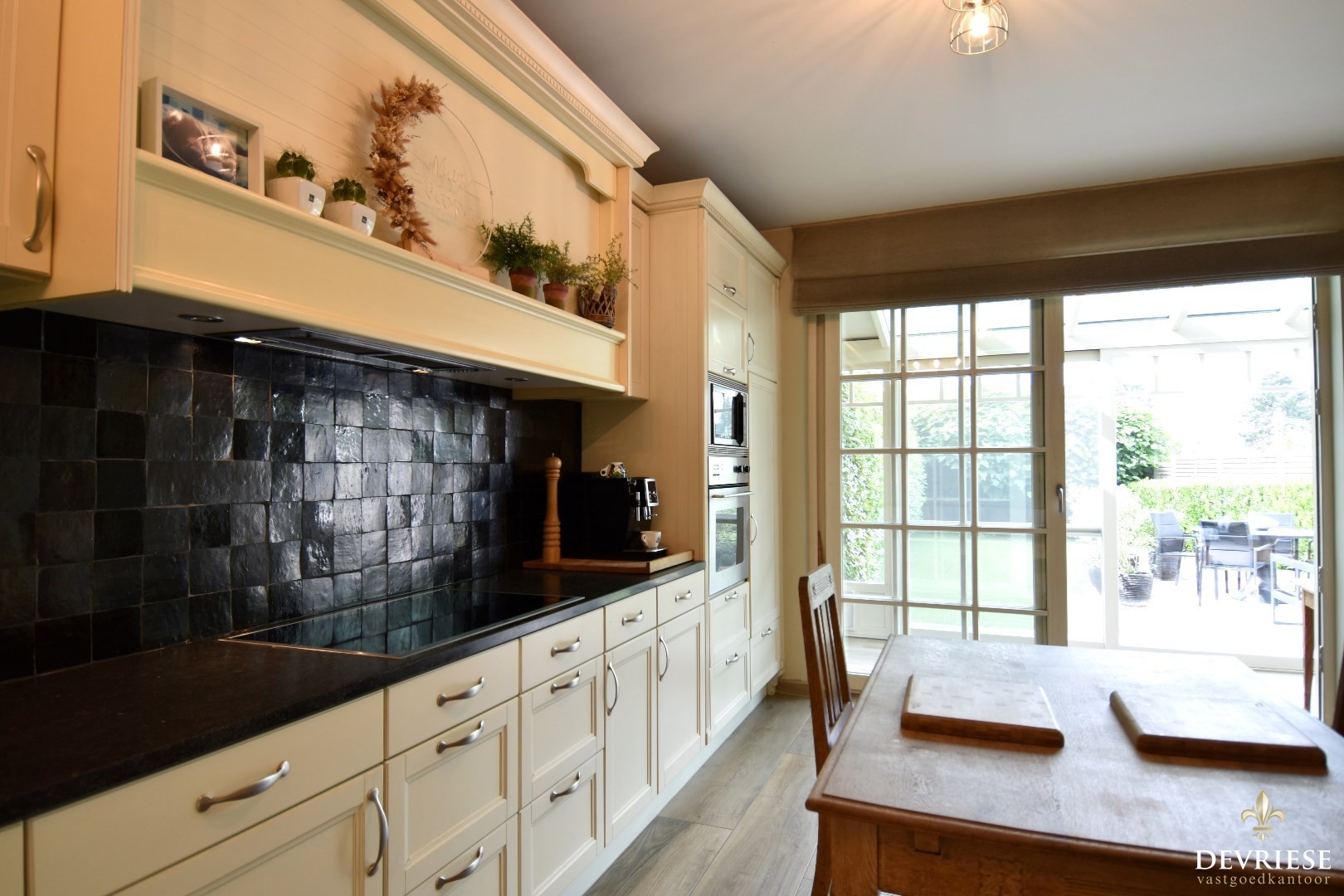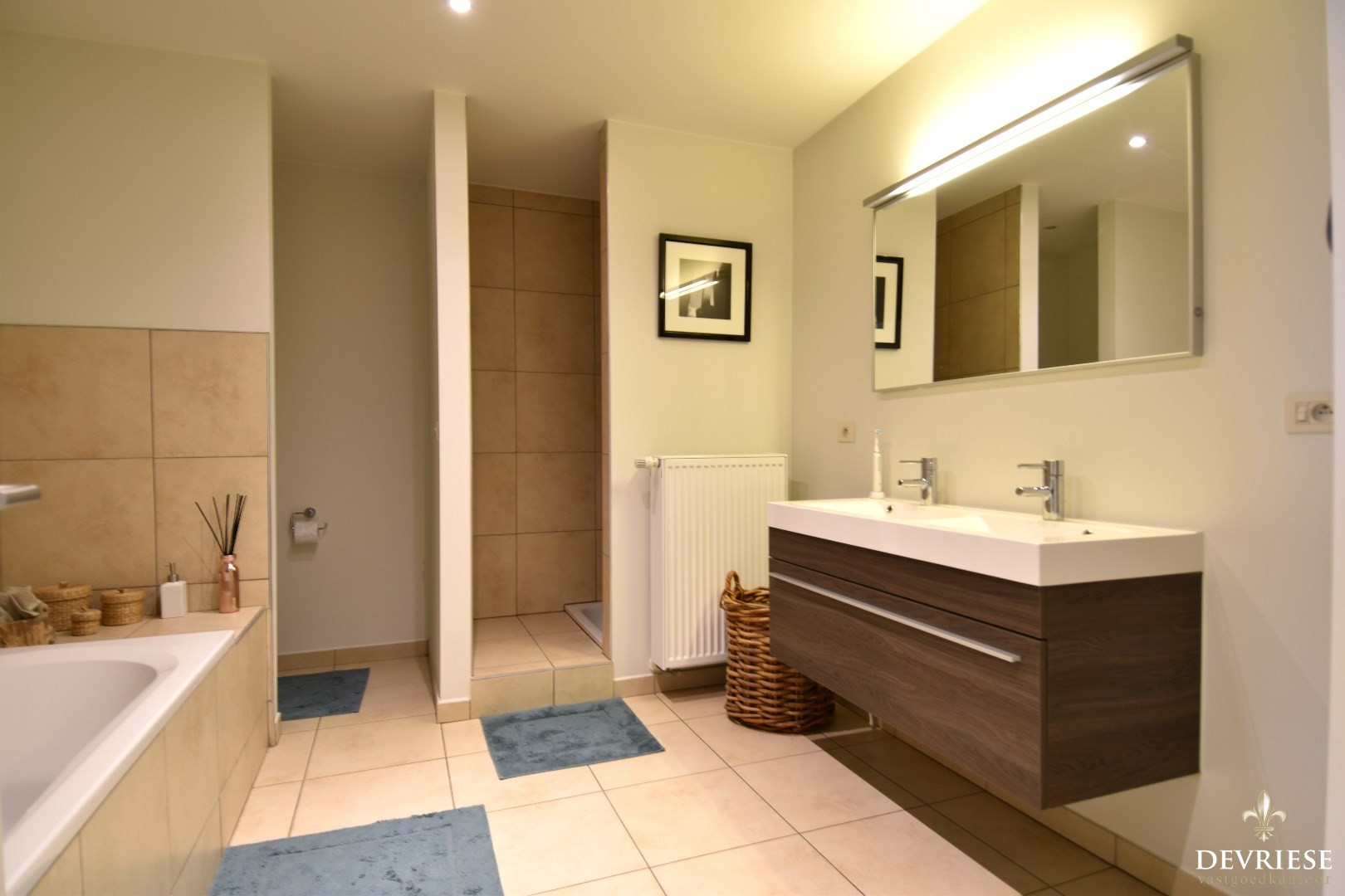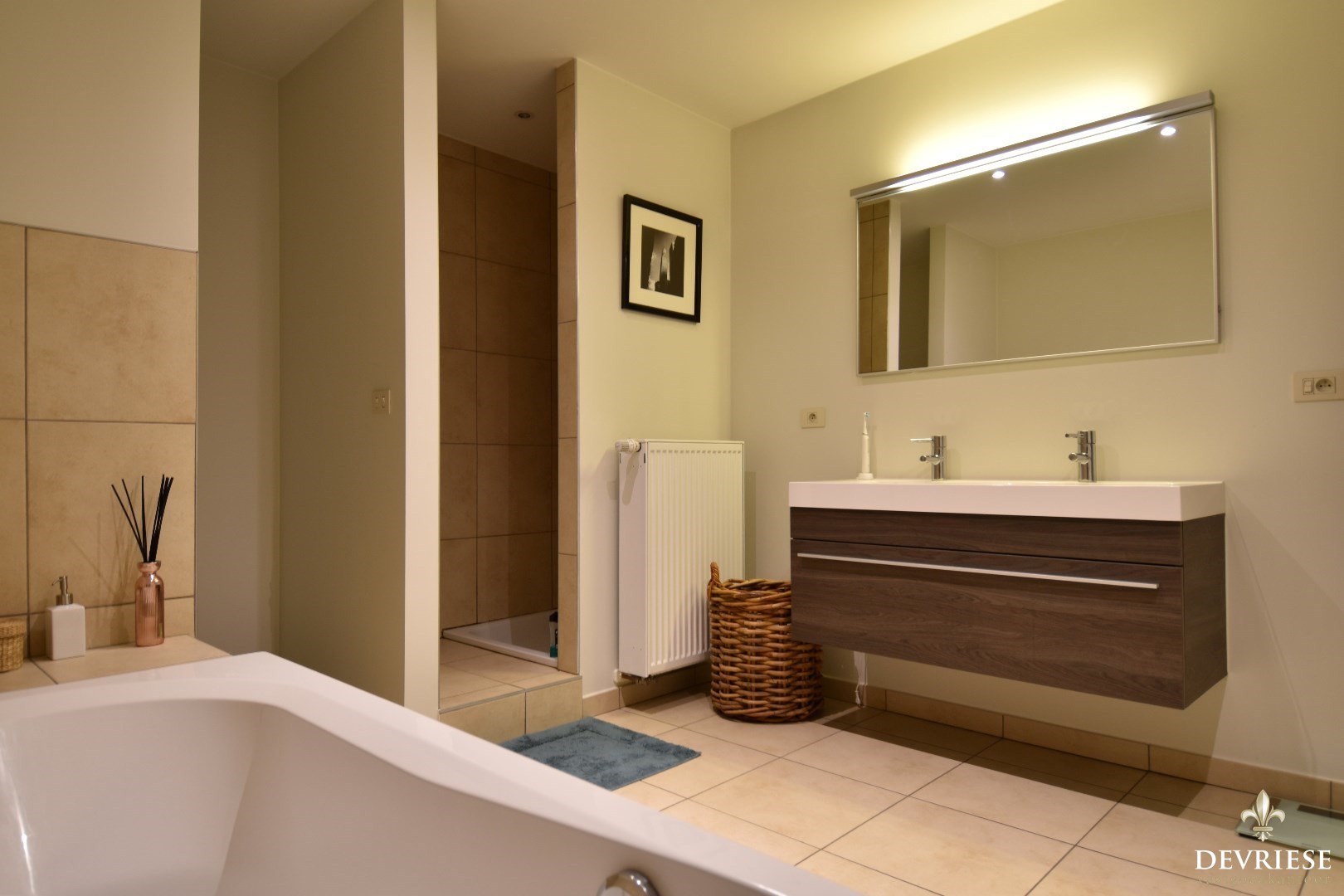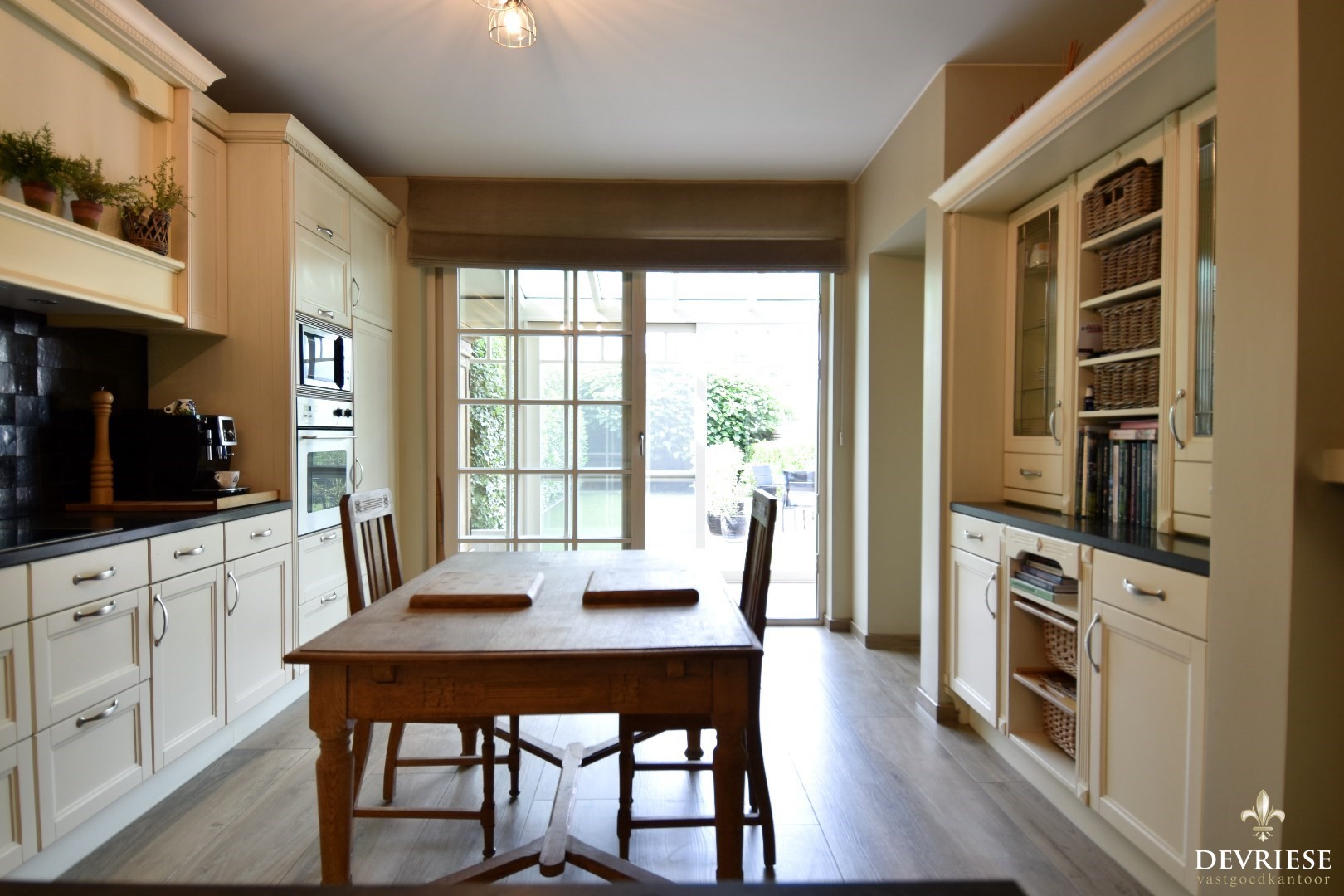 Bij het binnenkomen ontdekt u een ruime inkomhal met ingemaakte vestiaire en een apart gastentoilet. Via de elegante dubbele deur komt u terecht in het leefgedeelte, bestaande uit een gezellige eetplaats en salonruimte. Aansluitend vindt u de volledig uitgeruste keuken, voorzien van kwalitatieve toestellen, een overvloed aan opbergruimte én een gezellige ontbijthoek.